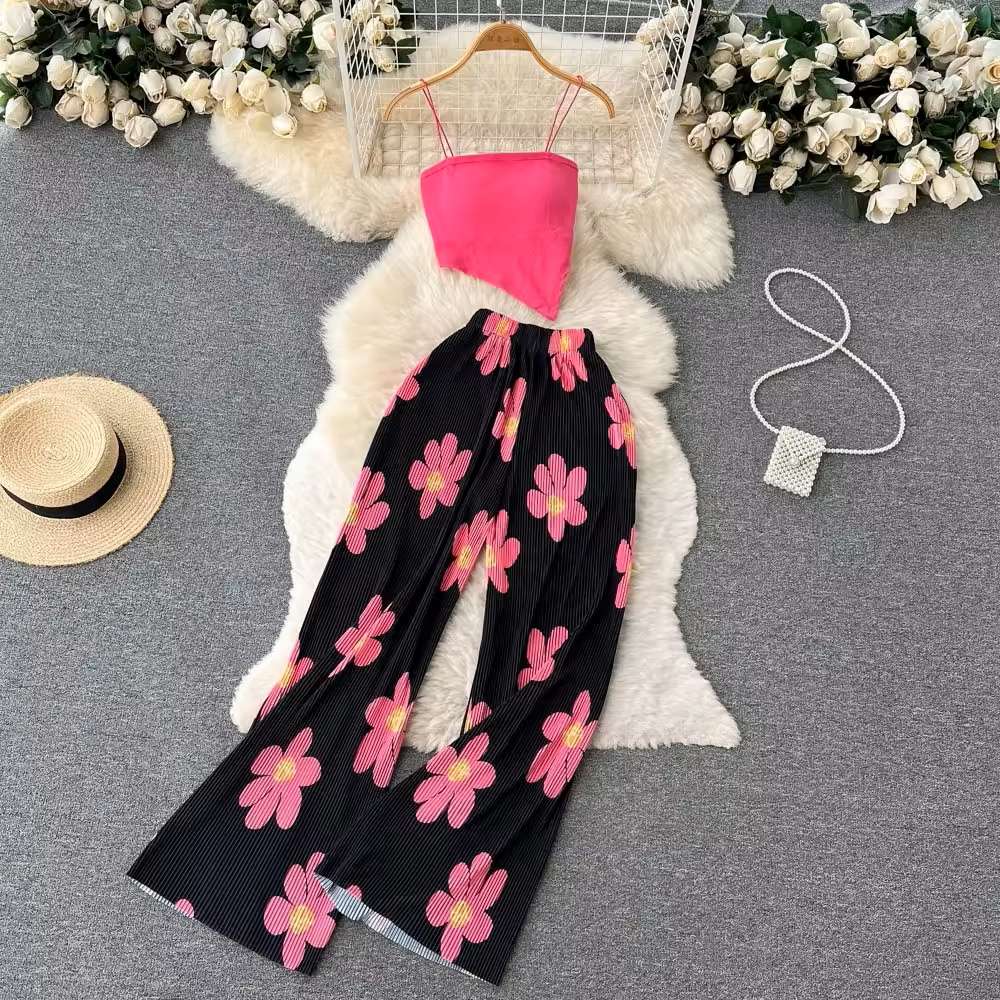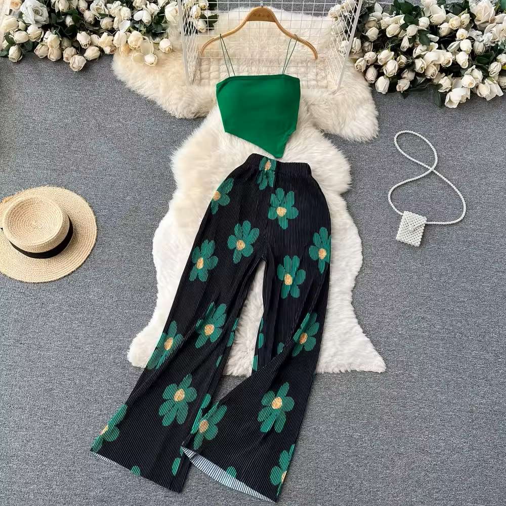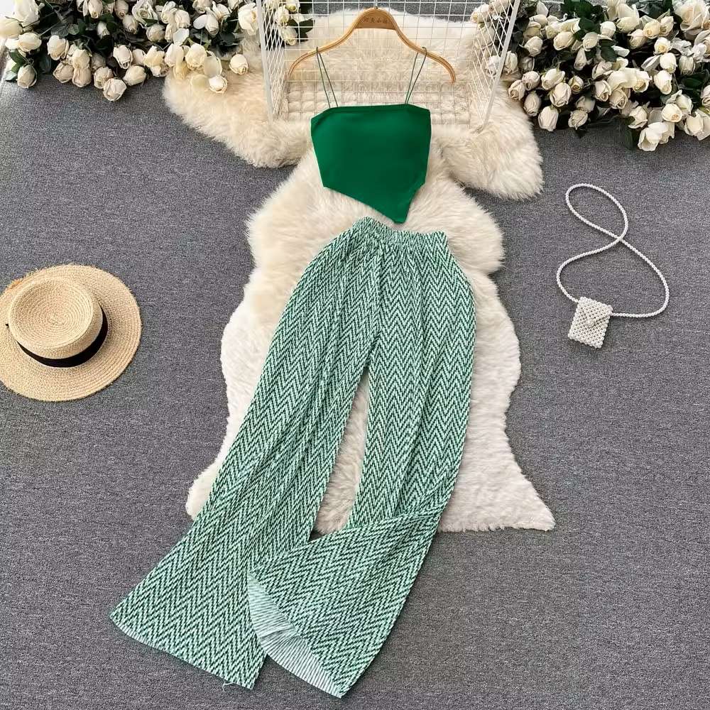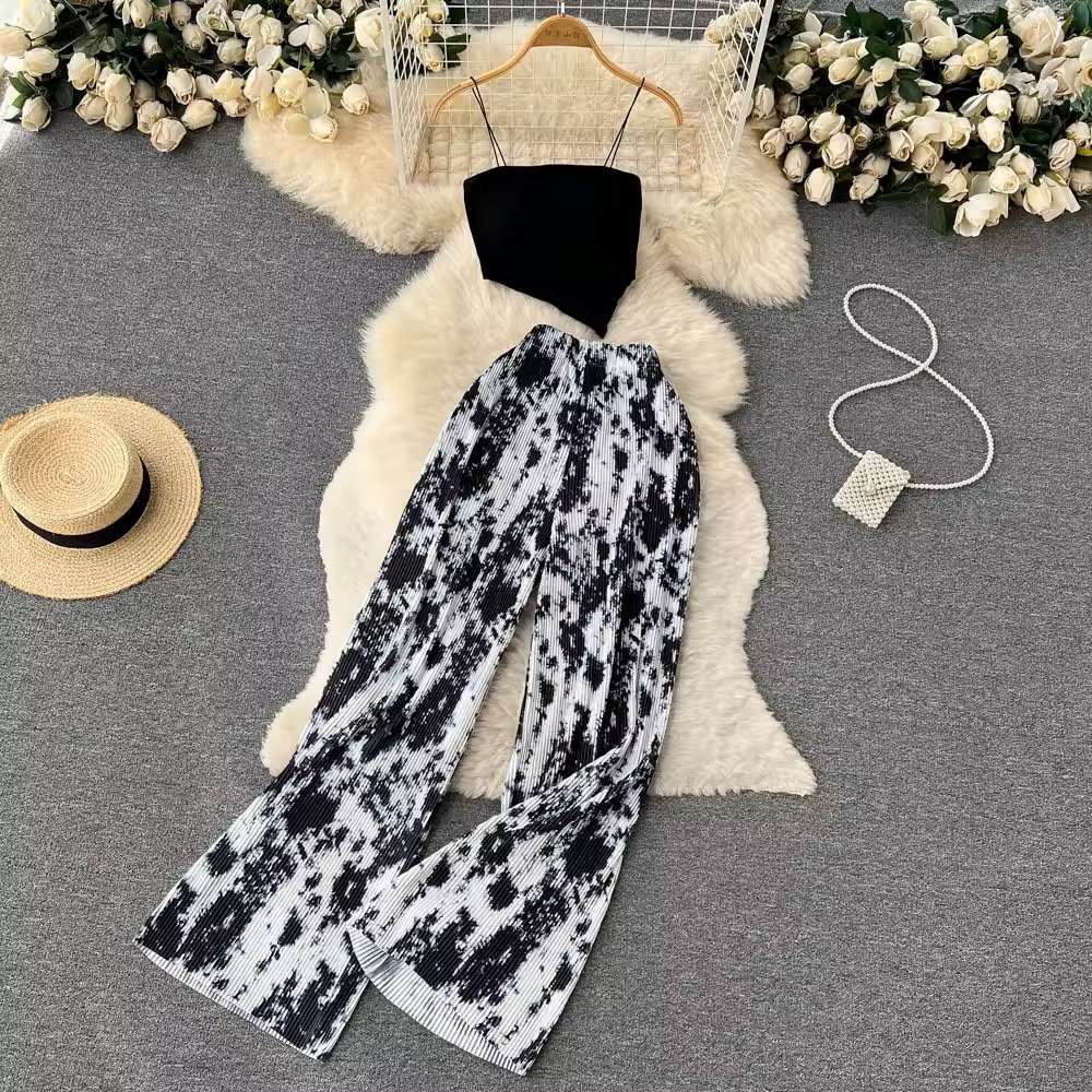 2 Piece Set Women Strapless Suspender Short Knitted Top + Printed High-Waisted Wide-Leg Trousers Women's Suits For Women
