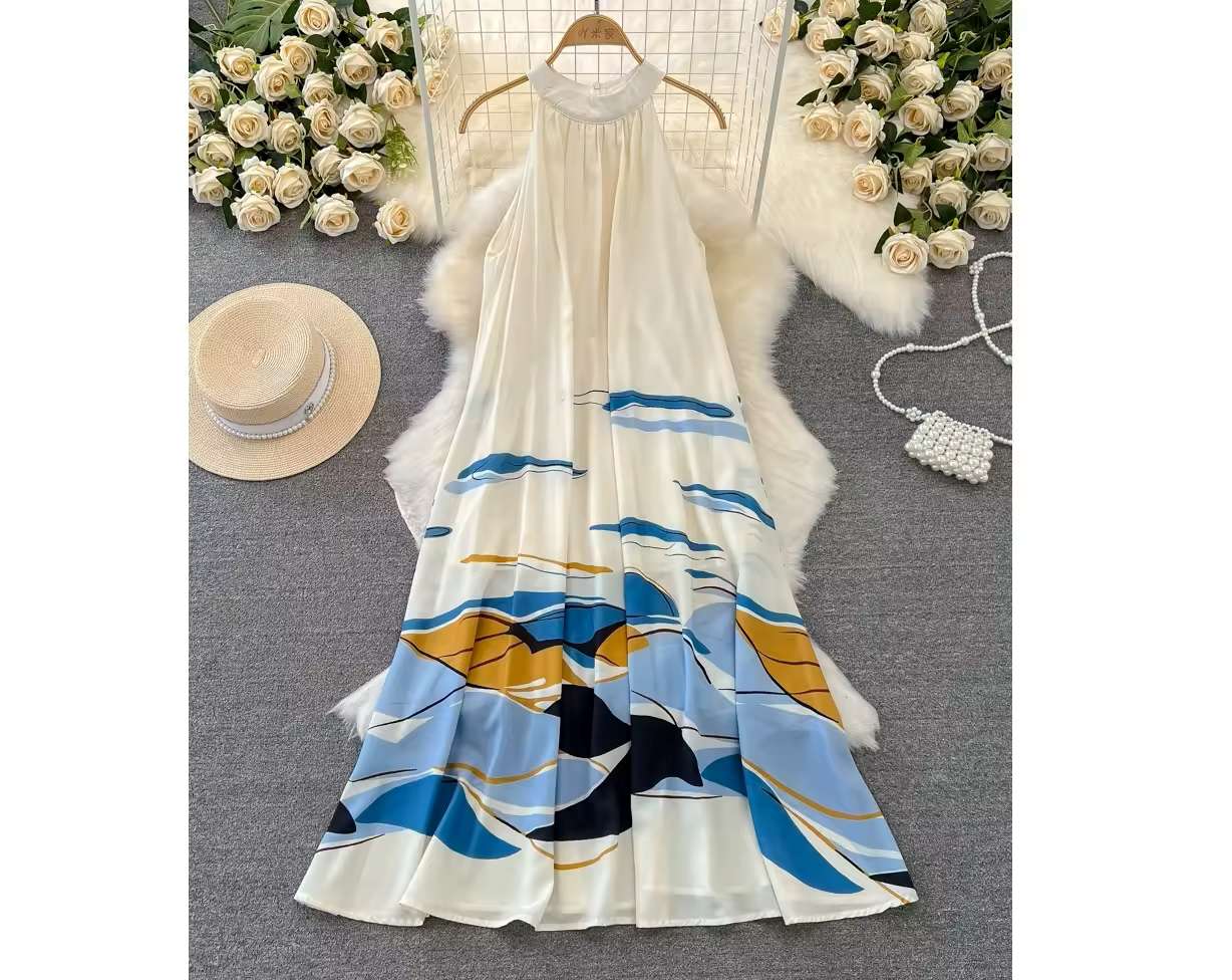 New Summer Halter Shoulder Loose A-Line Positioning Print Dress Beach Holiday Beach Fashion Travel Long Dress