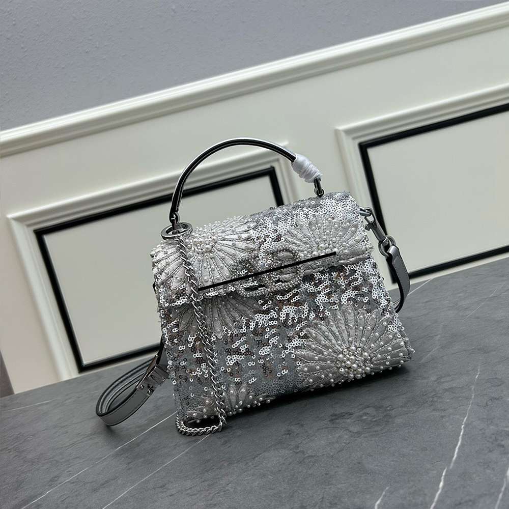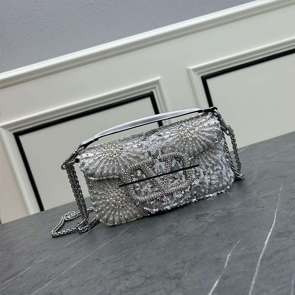 Valentino Garavani Locò small shoulder bag (MASTER COPY) with rhinestone appliqué and Swarovski® covered VLogo Signature element. Equipped with both a detachable sliding chain strap and a detachable handle, this accessory can be worn as a crossbody/shoulder bag or carried as a handbag.