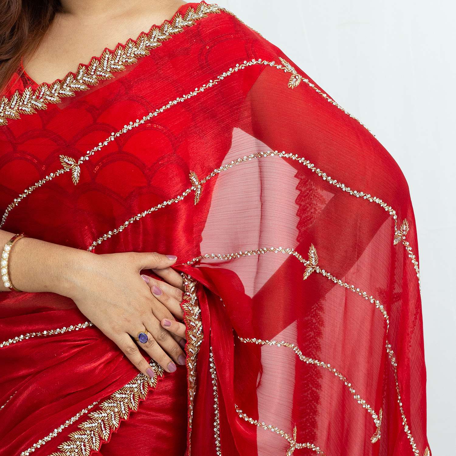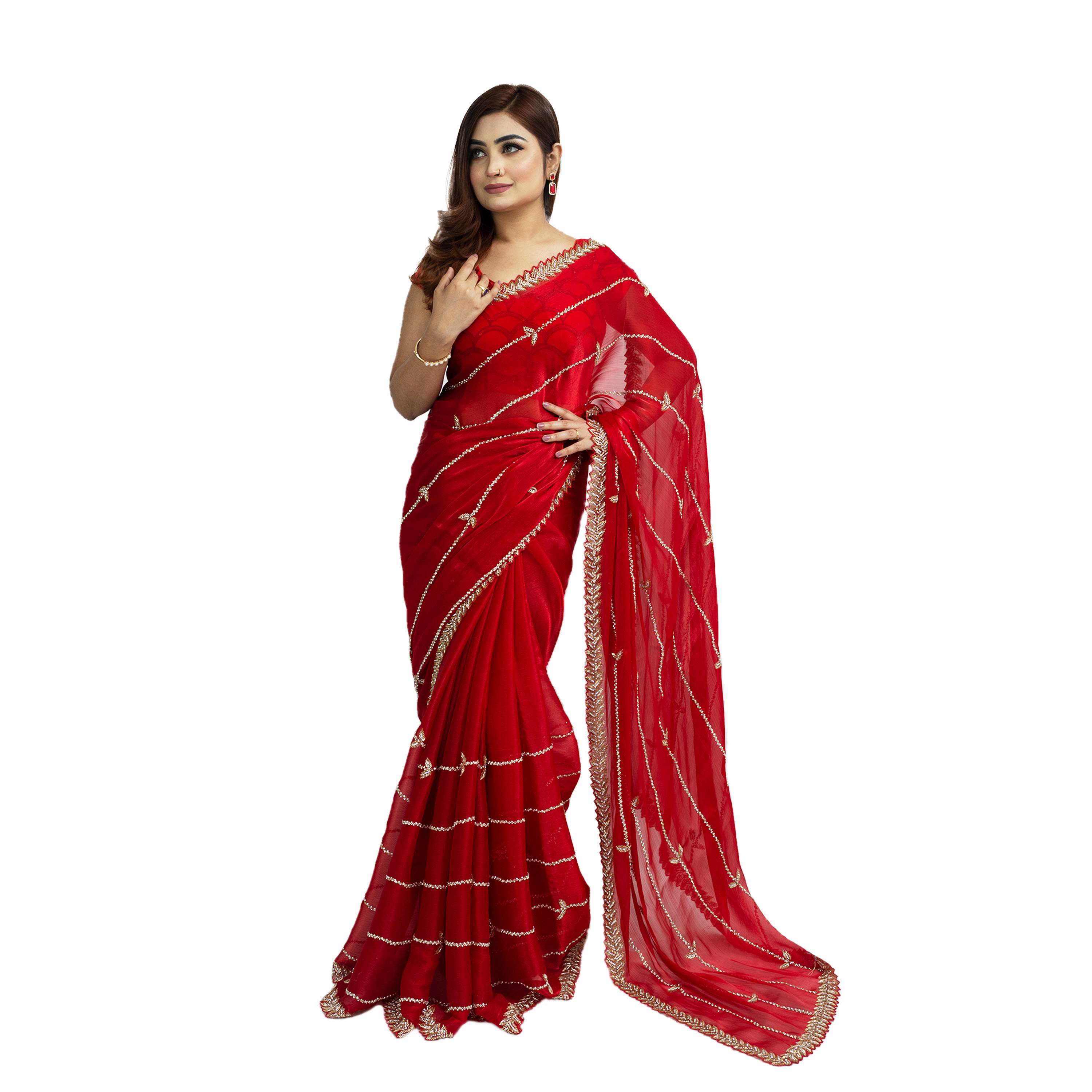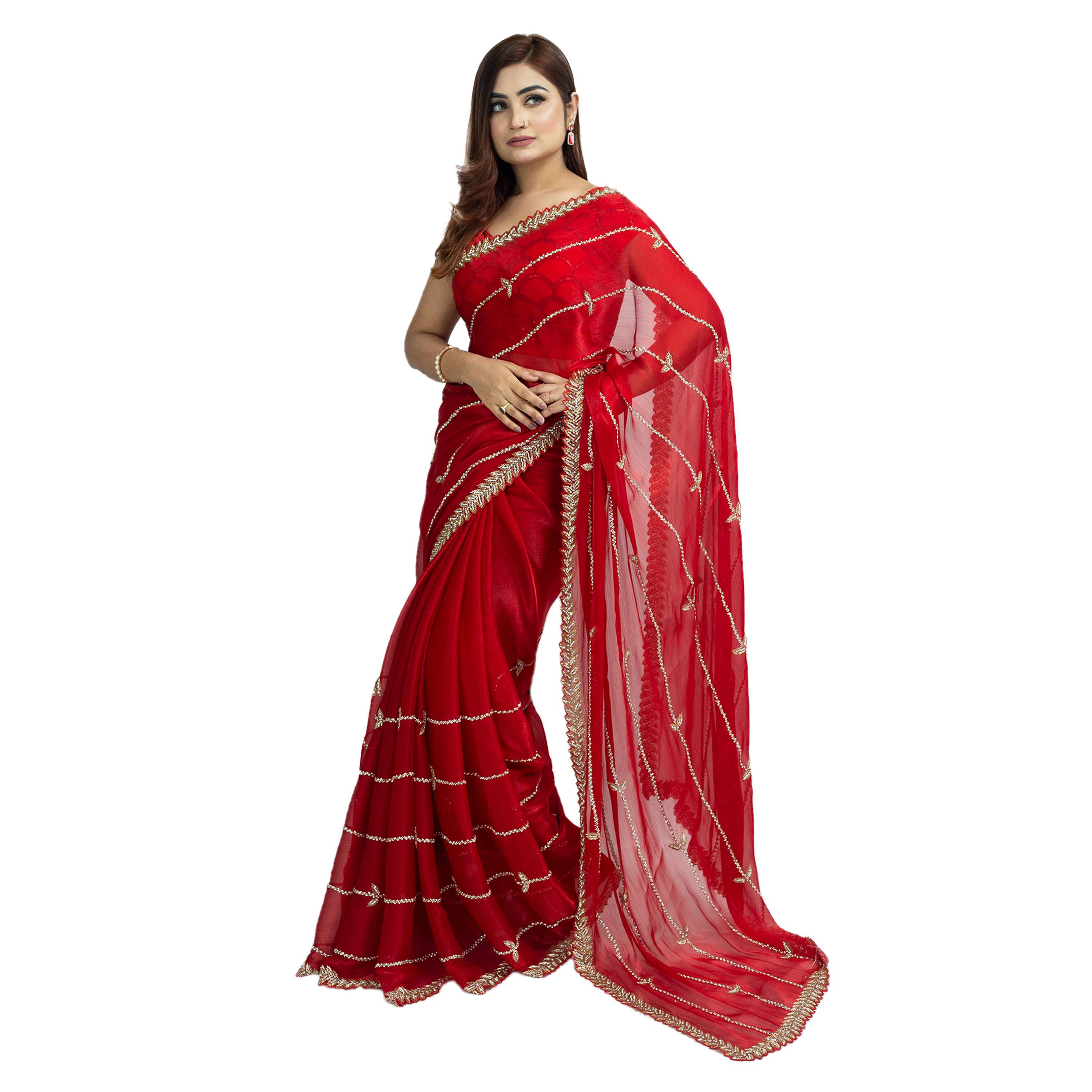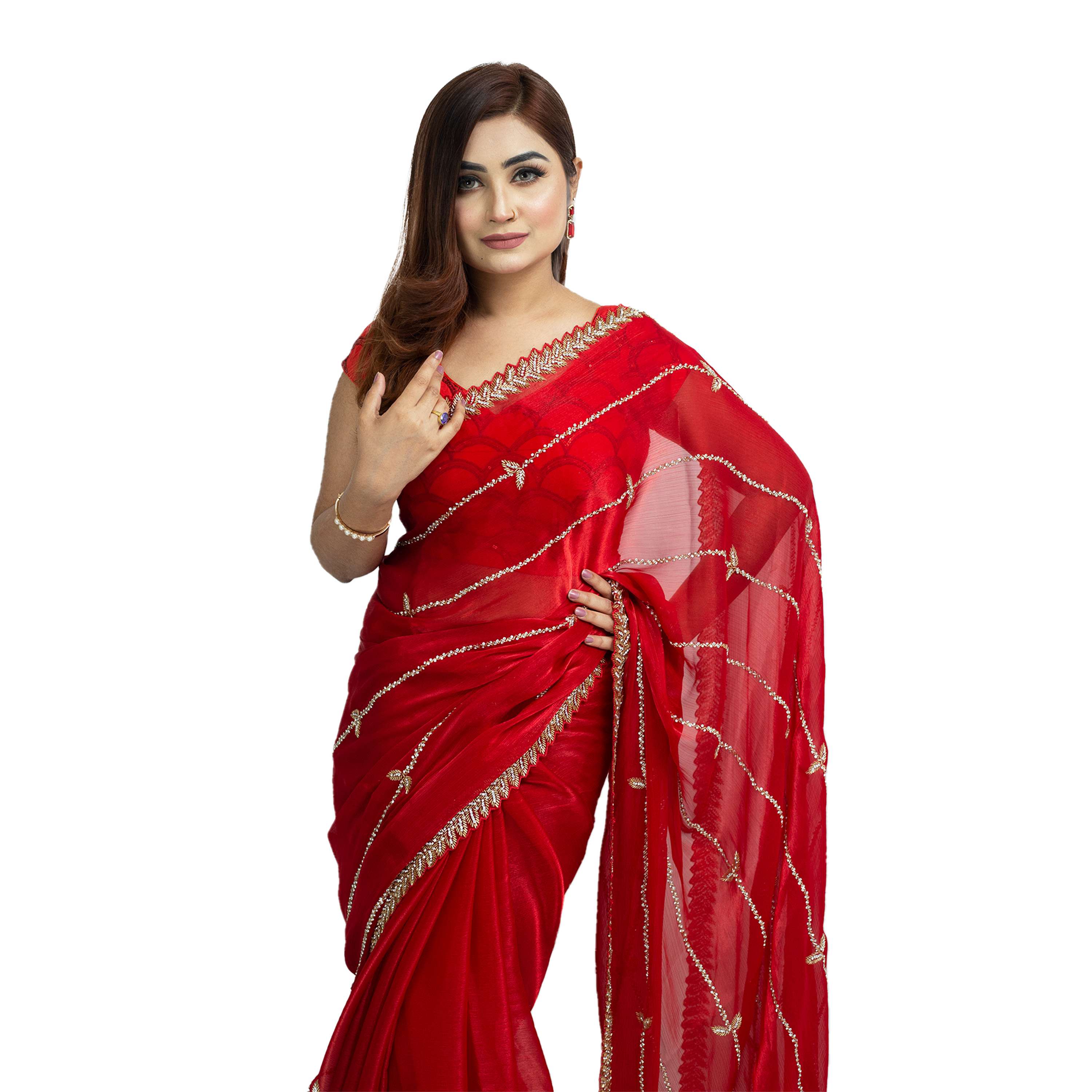 The sharee is crafted from luxurious red jimme choo fabric, renowned for its lustrous sheen and smooth texture, which gracefully drapes around the body, accentuating every movement with elegance. Adorning the sharee are exquisite pearl and stone embellishments, meticulously handcrafted to add a touch of opulence and sparkle to the ensemble. The pearls delicately shimmer against the rich red backdrop, while the intricate stone work adds depth and dimension, creating a mesmerizing visual feast.