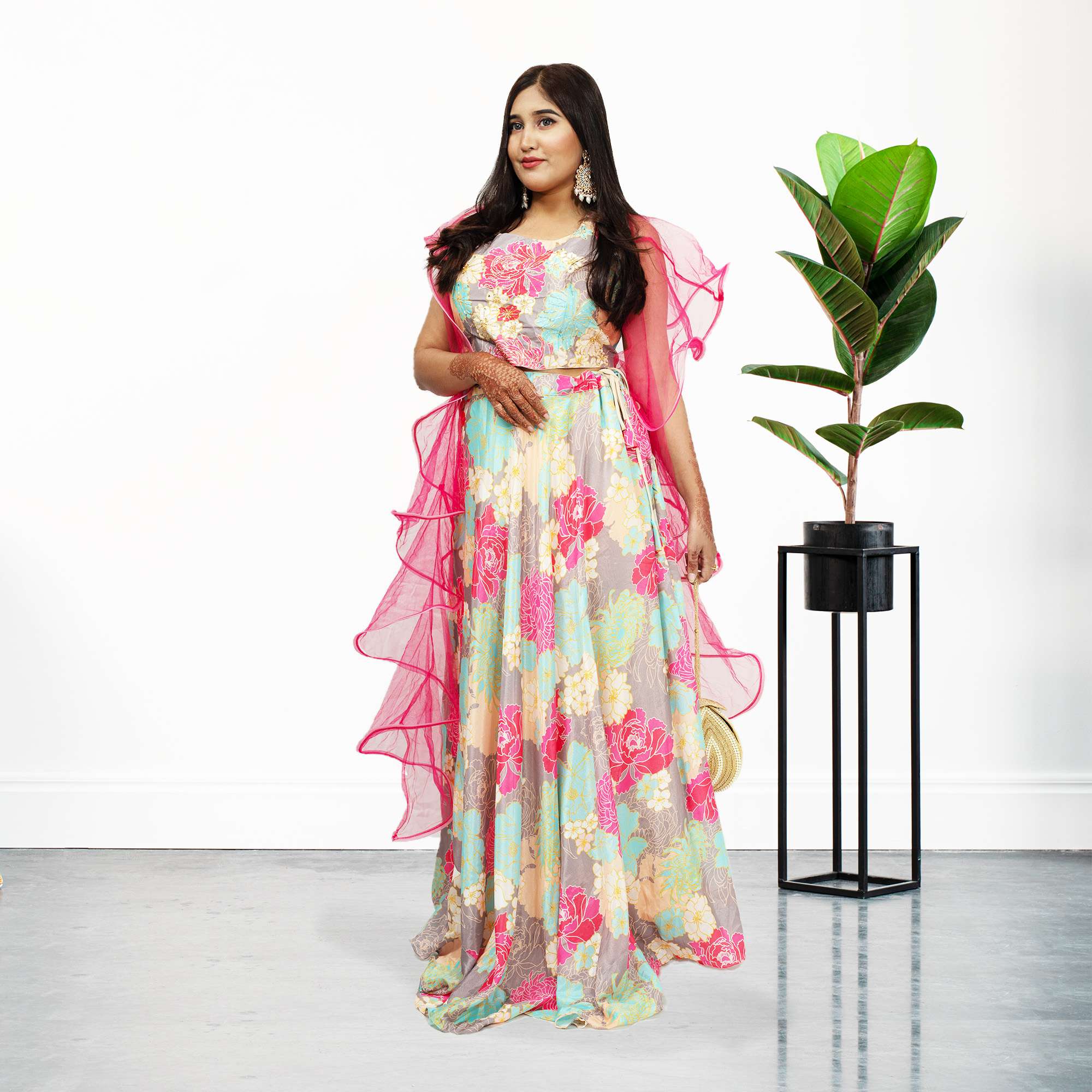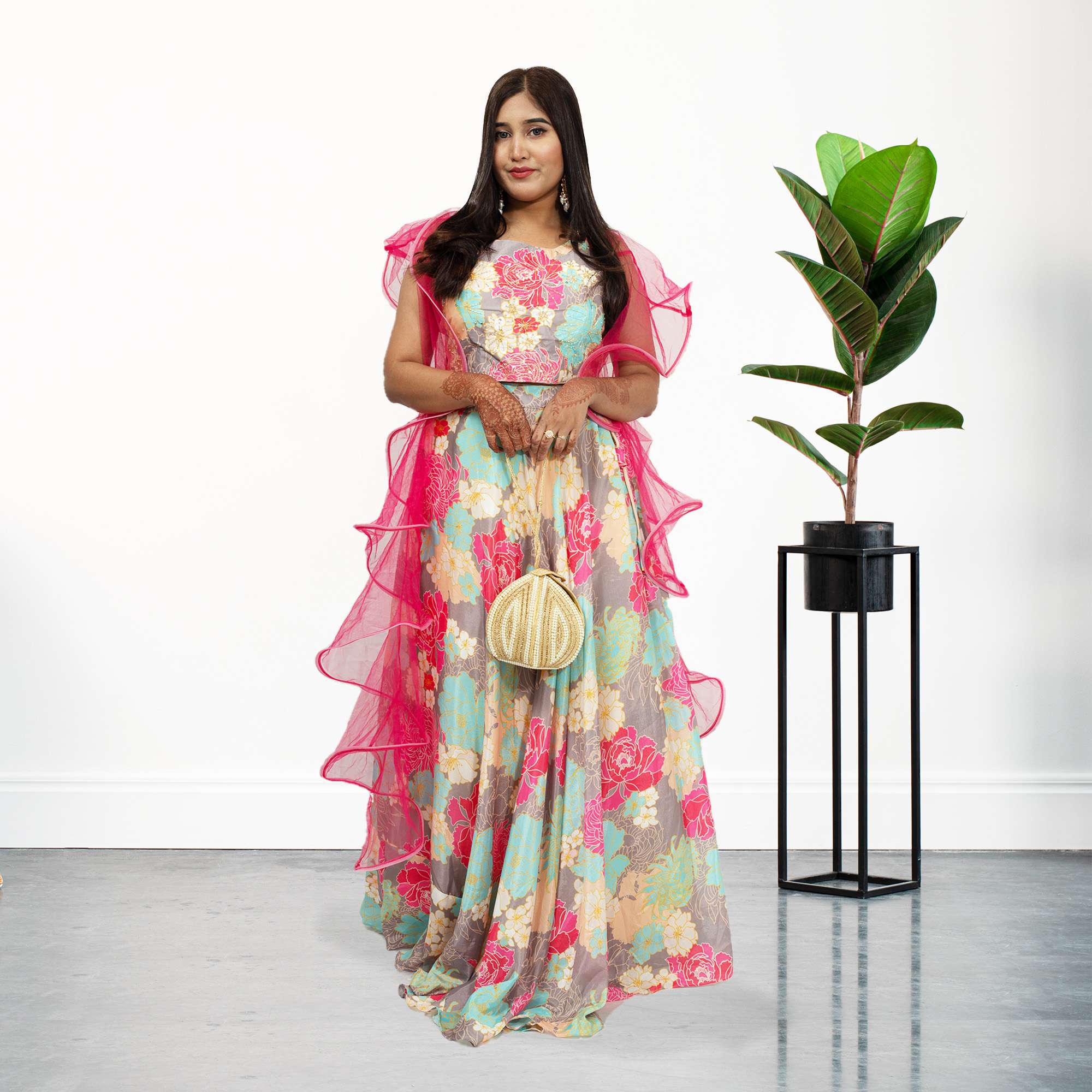 Blouse: Complementing the lehenga is a matching blouse adorned with delicate floral prints, harmonizing with the design of the skirt. The blouse is tailored to perfection, enhancing the overall look and feel of the ensemble.
