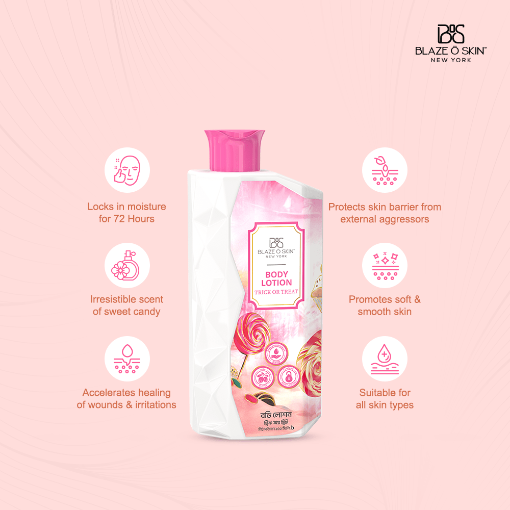 Indulge in the heavenly embrace of Blaze O' Skin's "Trick or Treat" Body Lotion! Let the delicious candy scent intertwine with a fountain of moisture, creating a symphony for your skin that lasts an incredible 72 hours. It bonds gracefully to safeguard the integrity of the skin barrier and speed up the process of healing superficial wounds and irritations.