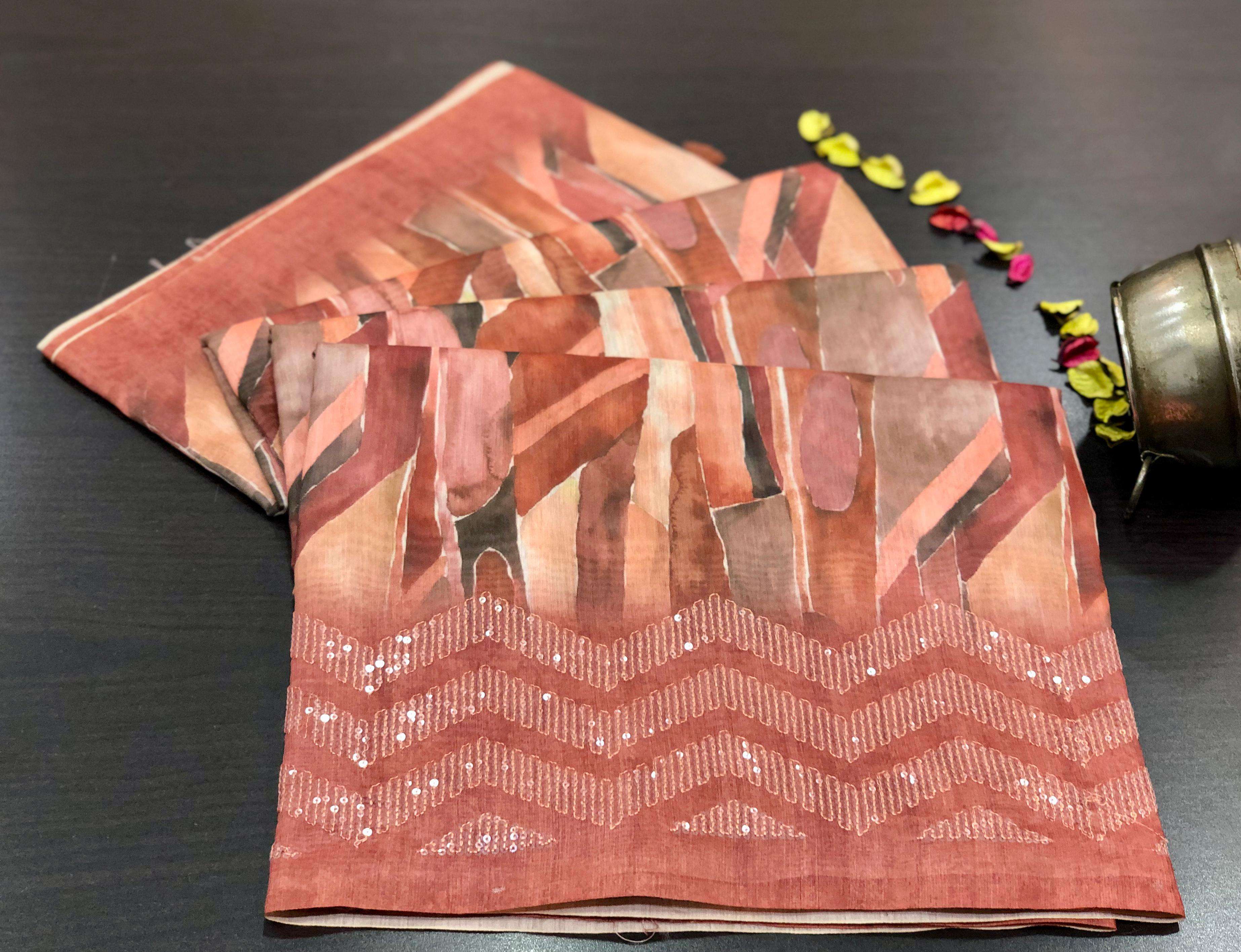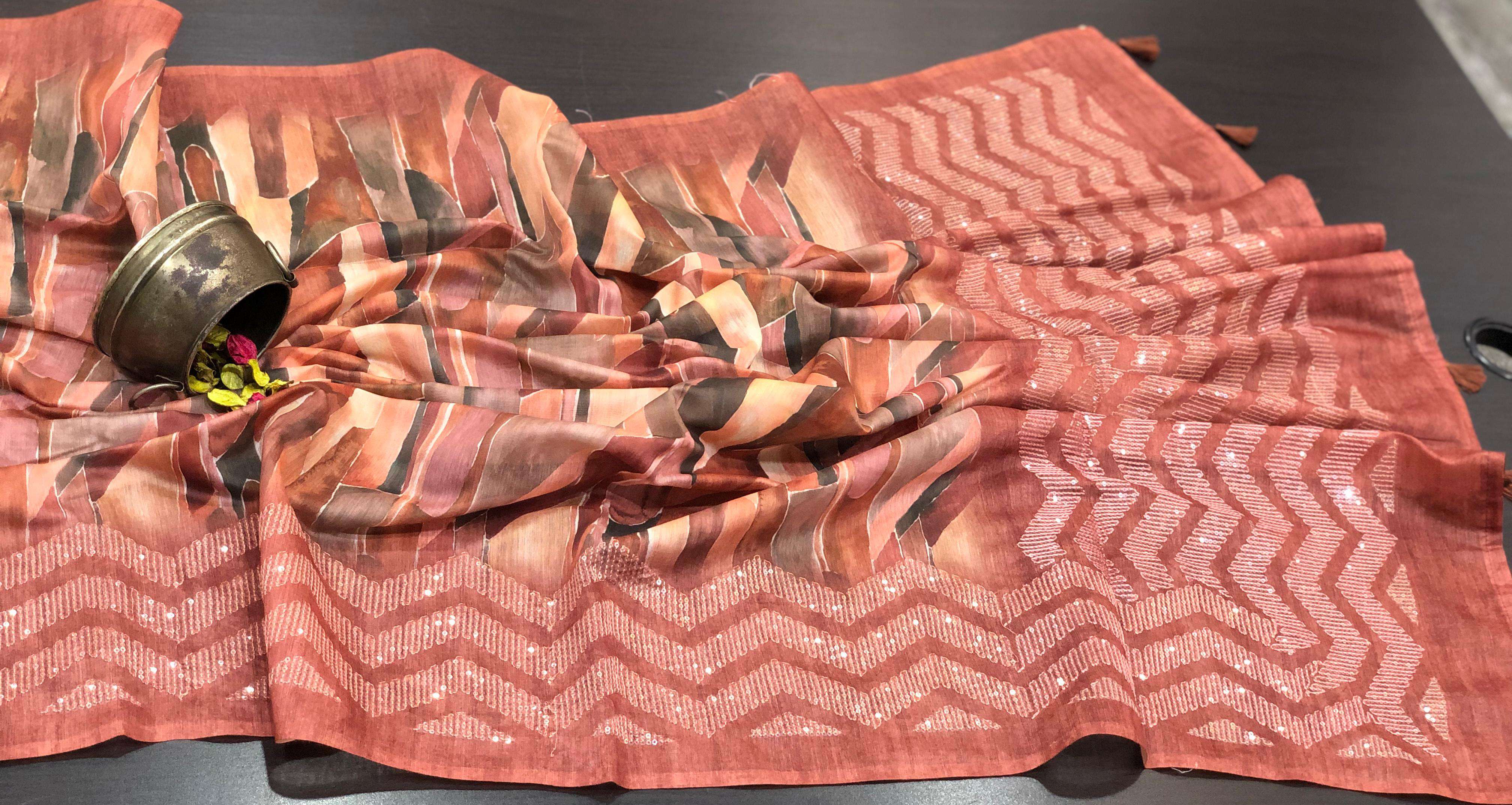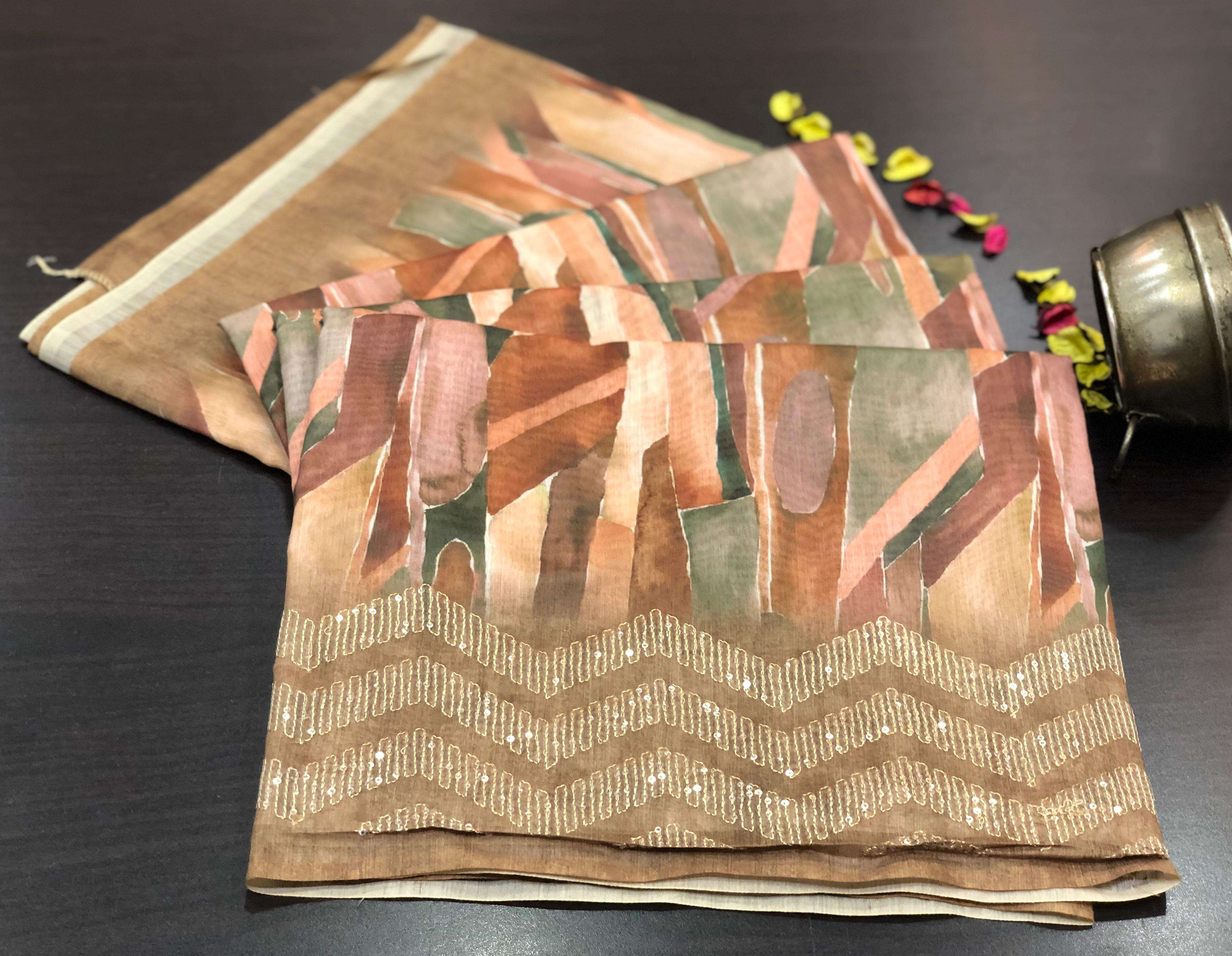 A Digital Printed Tusser Saree features intricate and vibrant patterns created through digital printing techniques on luxurious Tusser silk fabric. Known for its smooth texture and natural sheen, this saree combines traditional elegance with contemporary designs, making it a versatile choice for various occasions. The rich color palette and detailed motifs enhance its beauty, offering a sophisticated and fashionable appeal.