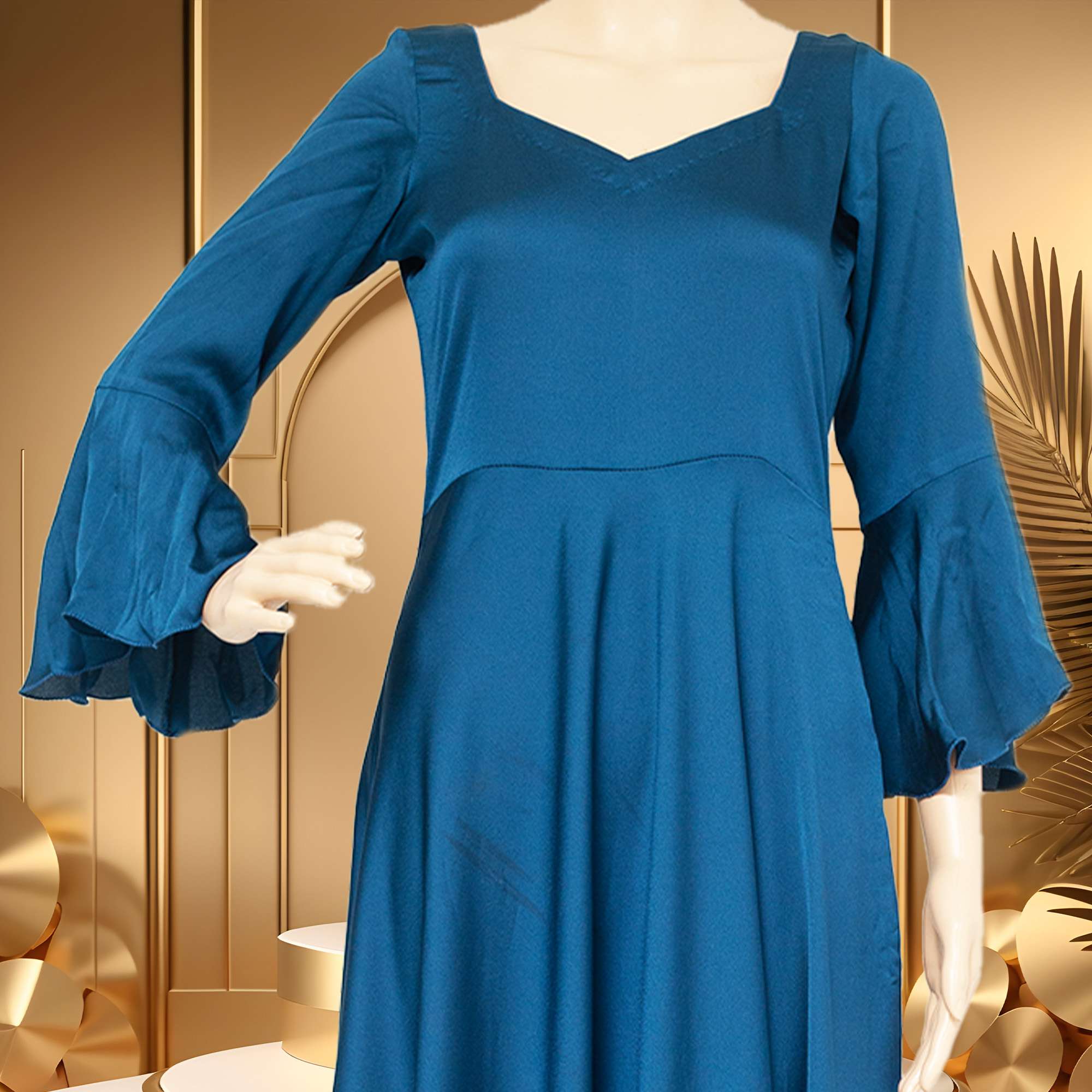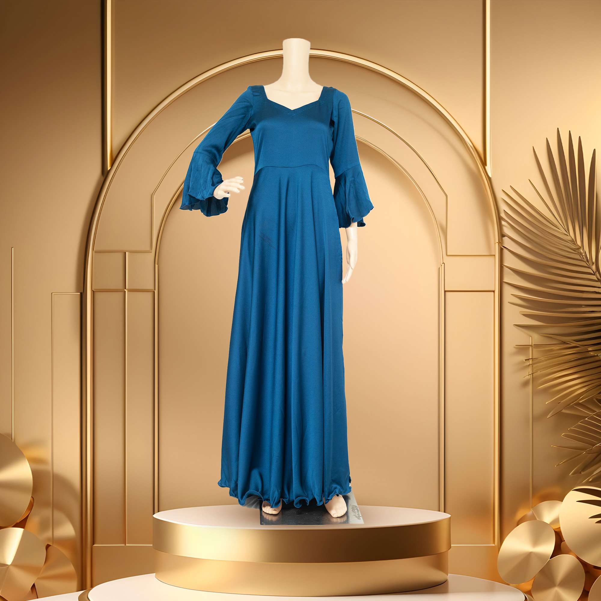 This gown is likely crafted from smooth, flowing silk, designed to elegantly drape from shoulder to ankle. The deep sea blue color suggests a rich, oceanic hue, which could range from a vibrant azure to a deep navy. The long sleeves indicate it's suitable for cooler weather or more formal occasions, offering both coverage and grace. Such a gown would likely feature subtle details like a flattering neckline, perhaps a V-neck or boat neck, and a cinched waist or flowing silhouette for a flattering fit. Embellishments could include delicate embroidery, beading, or simply the natural sheen of high-quality silk.