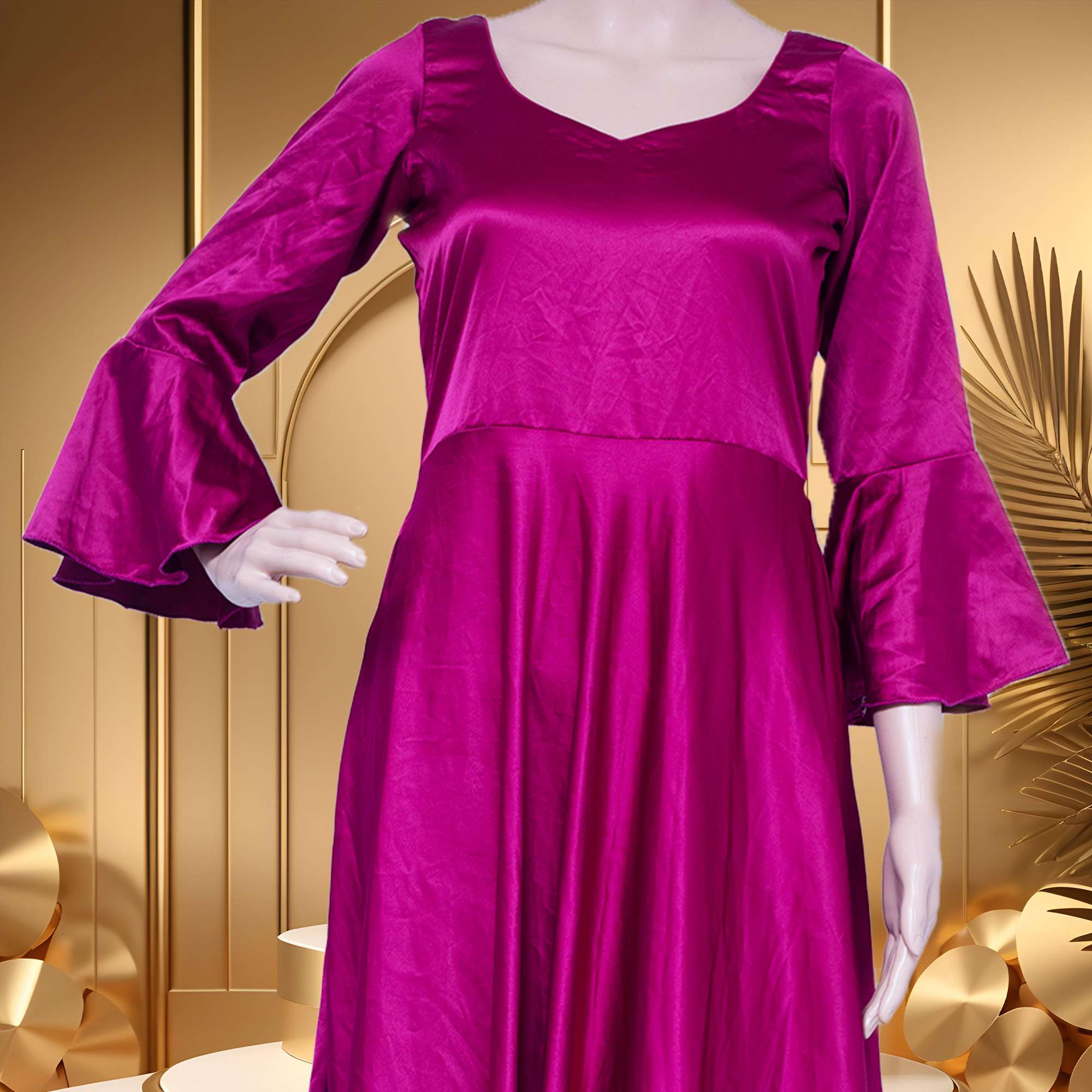 A "Purple Floor Touch Long Sleeve Gown" typically refers to a formal or evening dress that is long enough to touch the floor, featuring long sleeves. It suggests a garment that is elegant and suitable for formal occasions, often made from flowing or luxurious fabrics, and colored in a shade of purple, known for its association with royalty and sophistication.