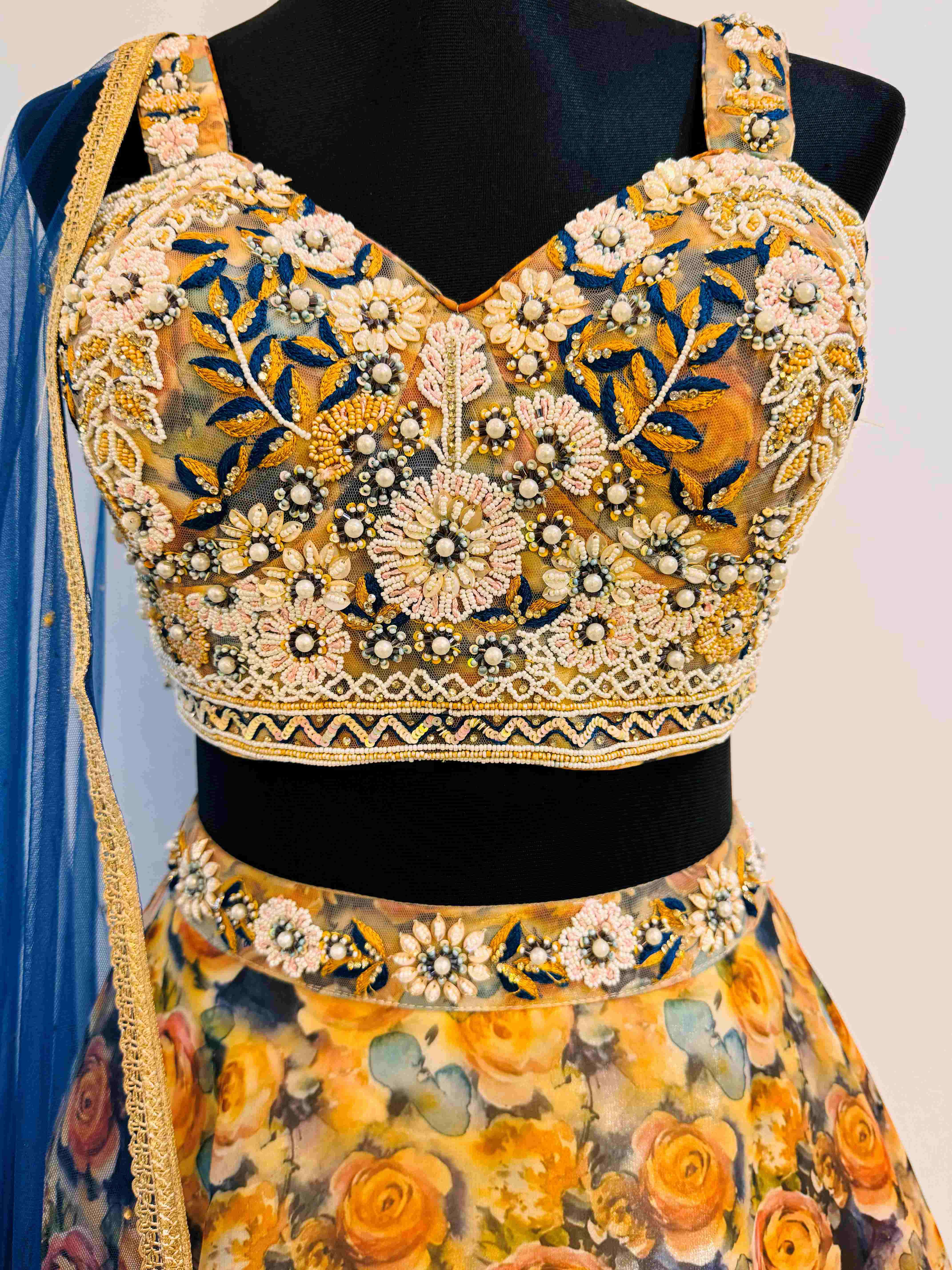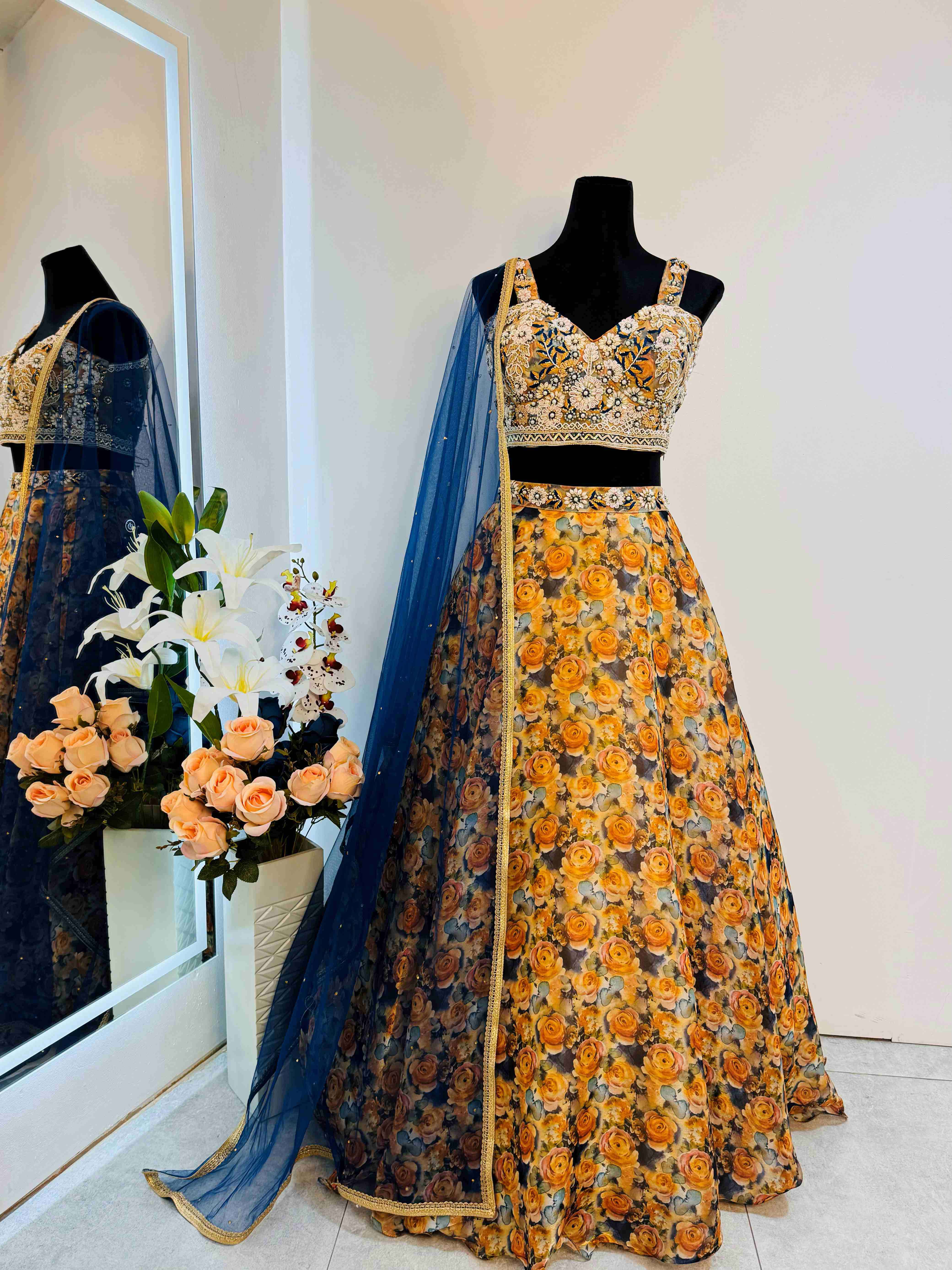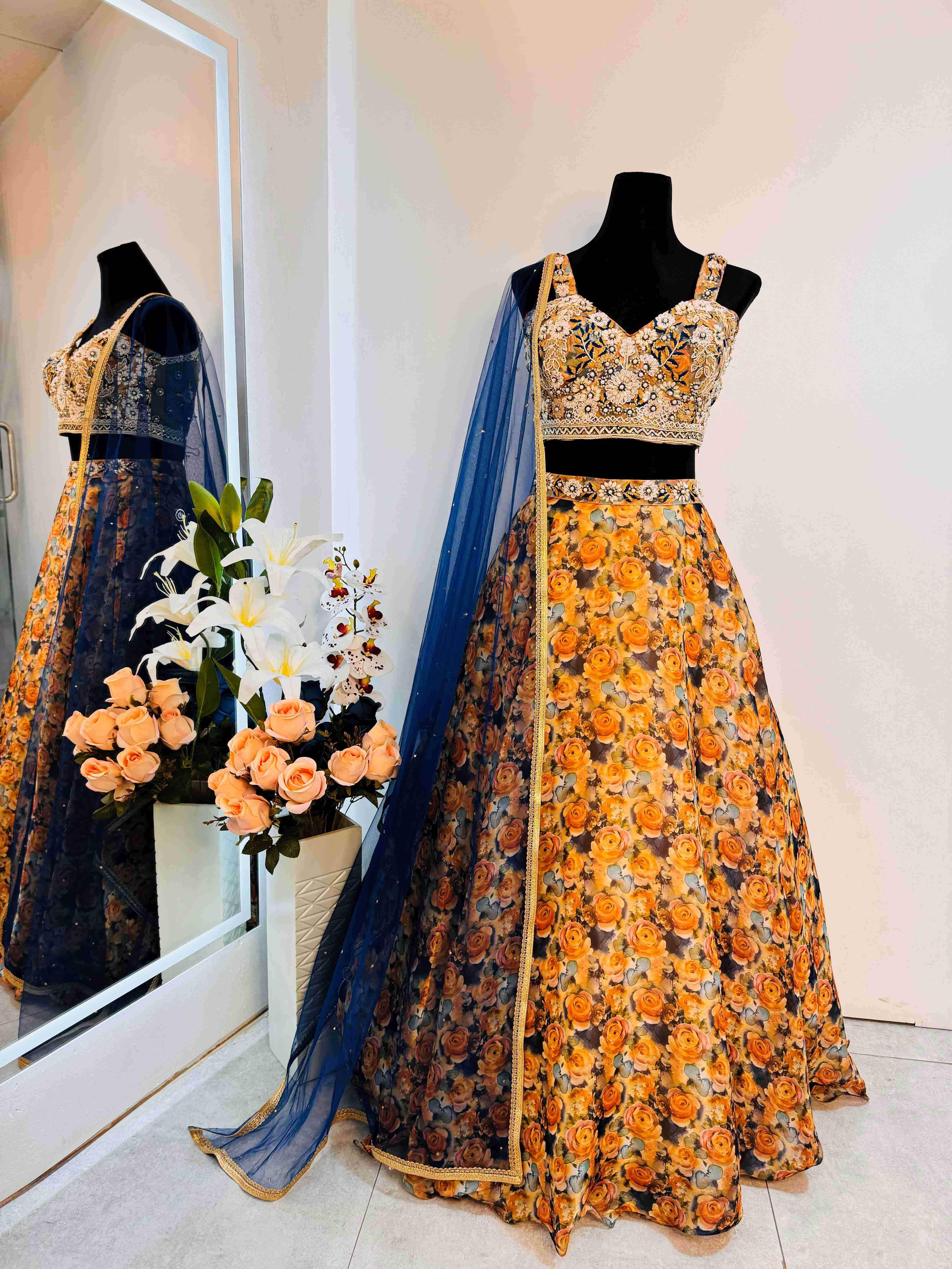 - Print and Design: The lehenga features a gorgeous floral print that adds a touch of nature-inspired beauty. The intricate flower motifs are meticulously printed, offering a rich and vibrant look.