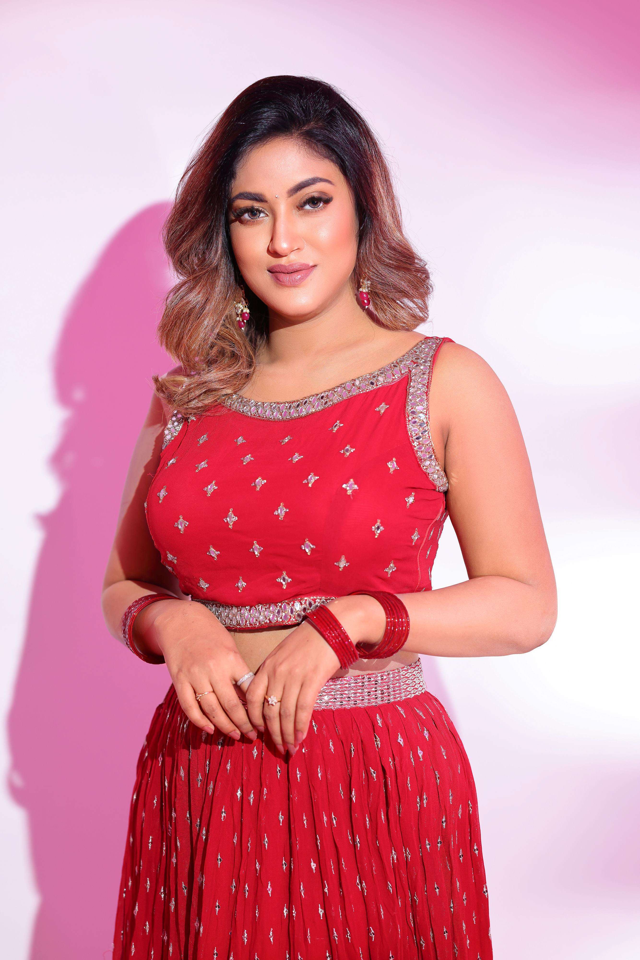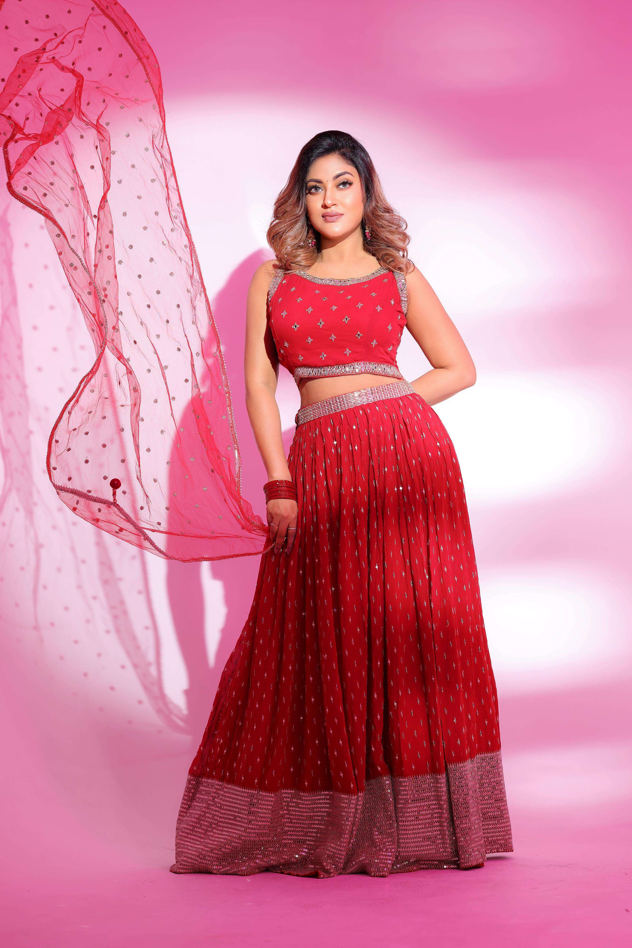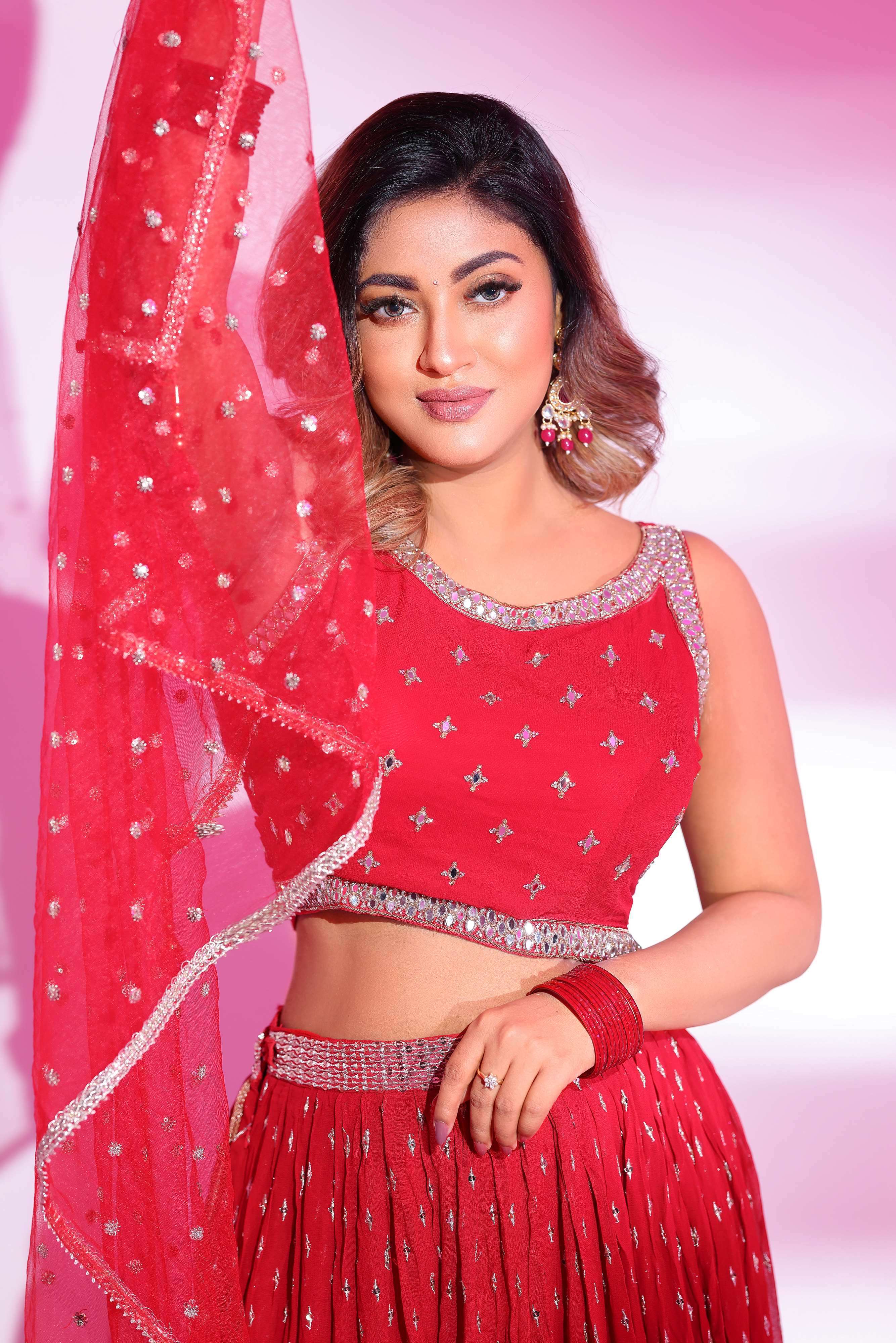 A gorgeous hot red color lehenga is a stunning ensemble that exudes elegance and charm. Here's a full description: