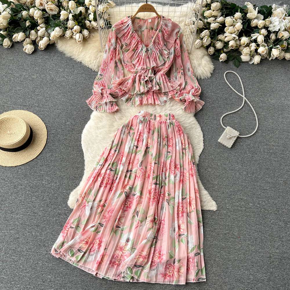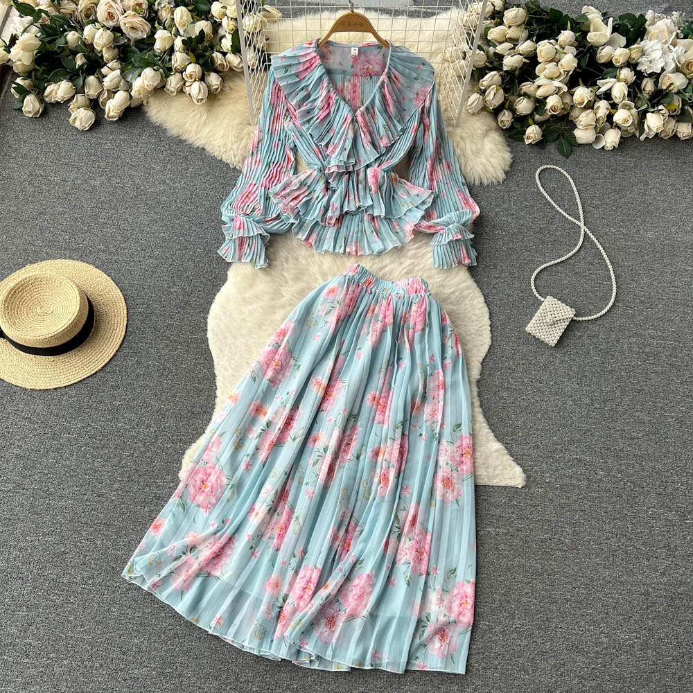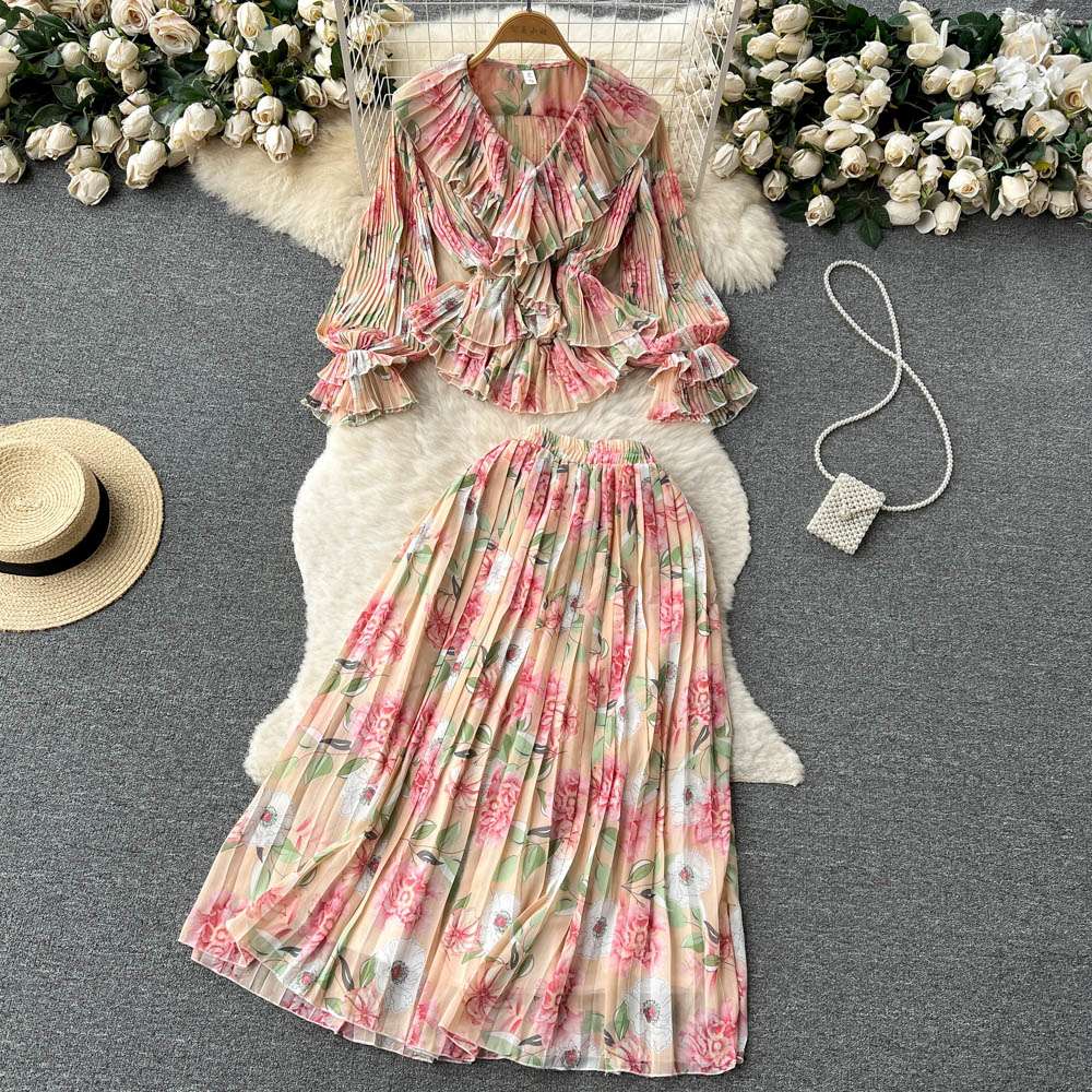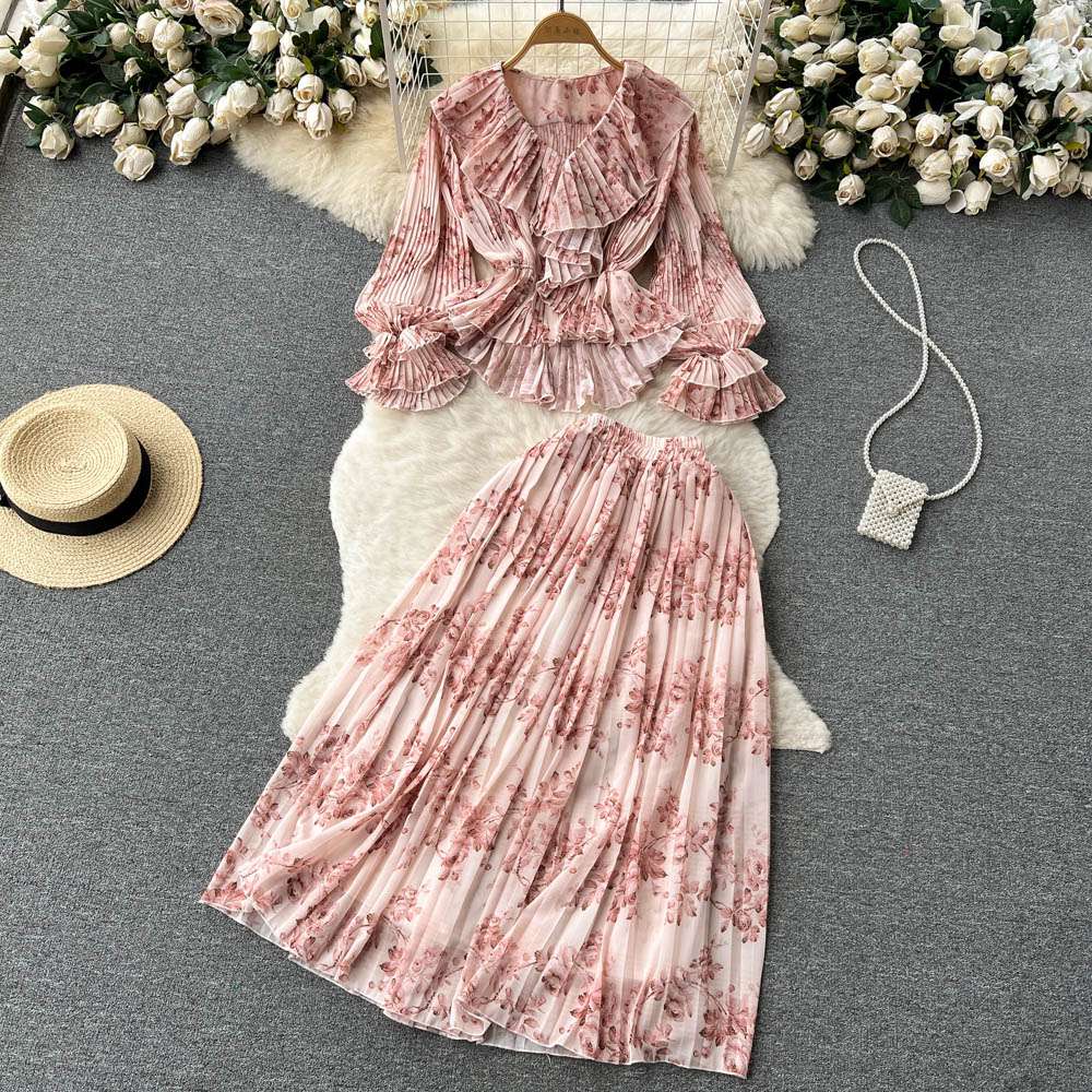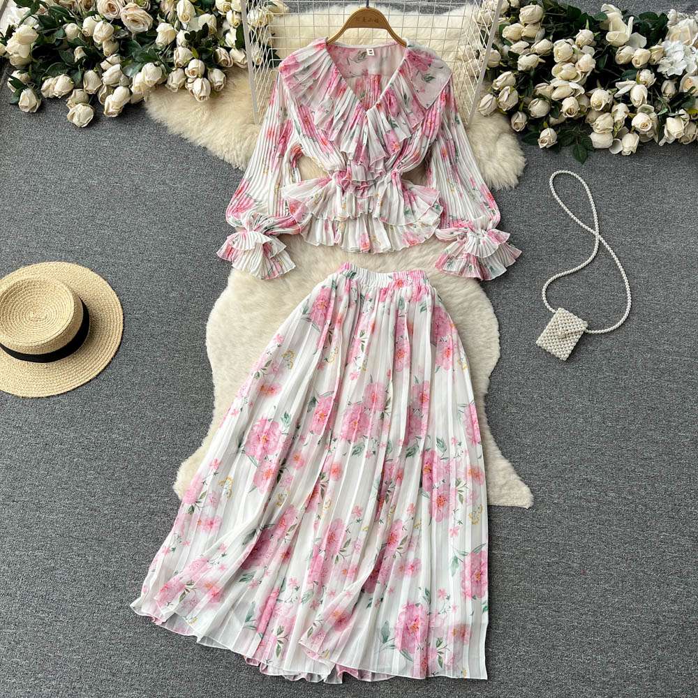 Holiday Suit Chic Lantern Sleeve Short Top High Waist Pleated Skirt Chiffon Floral Two Piece Set