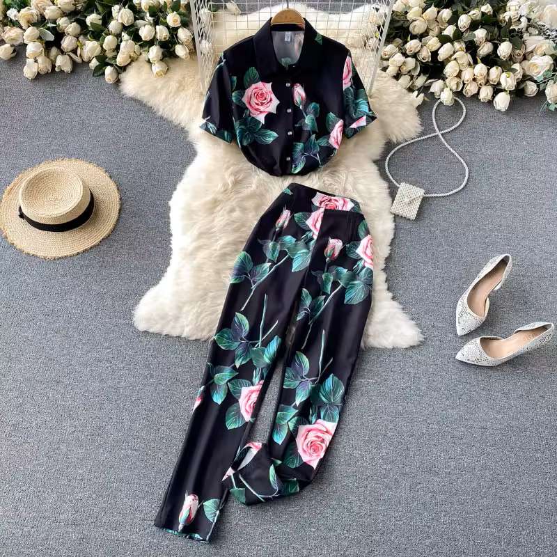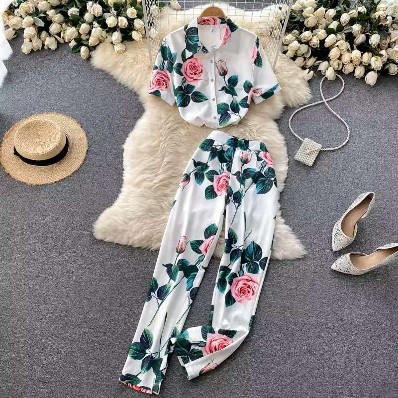 Ladies Shirt Short Sleeve Elegant Print High Waist Wide Leg Pants Two Piece