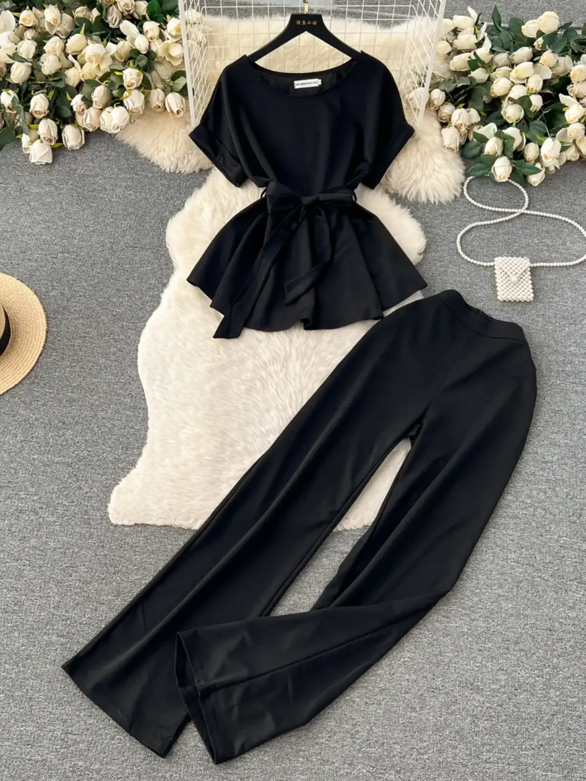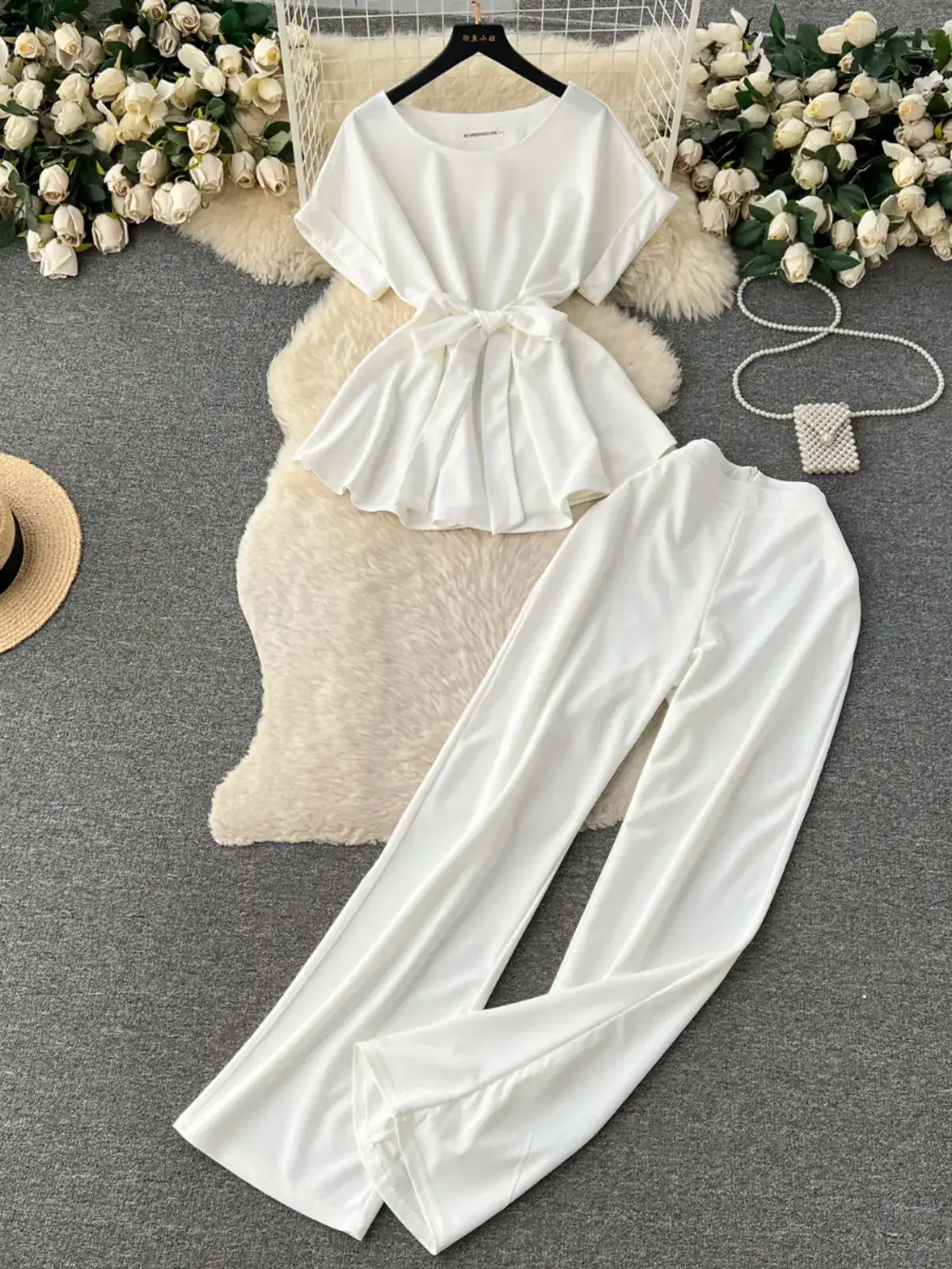 Fashion Round Neck Short Sleeve Tie Top Two Piece Women Casual Loose Wide Leg Pants 2 Pieces