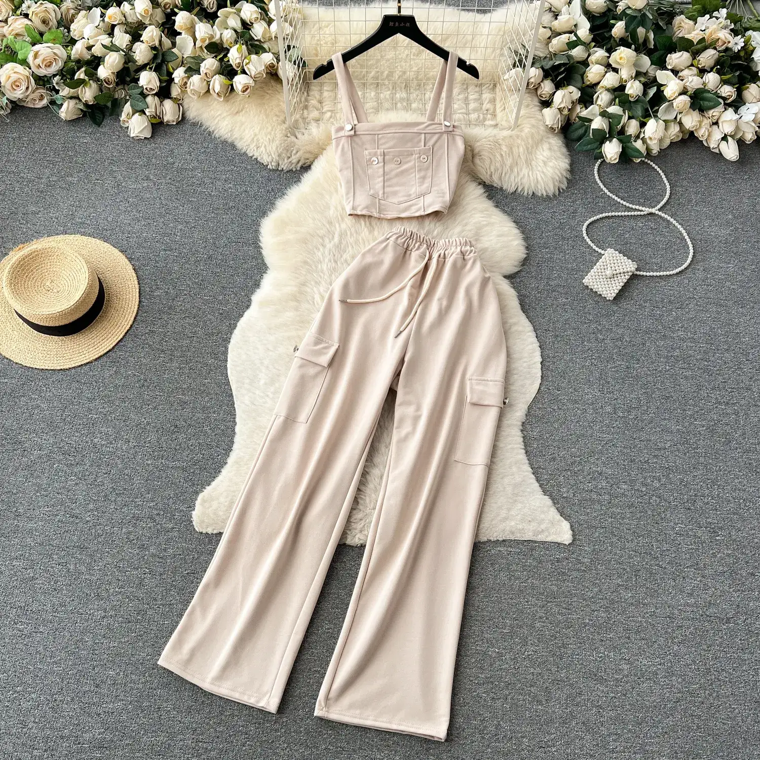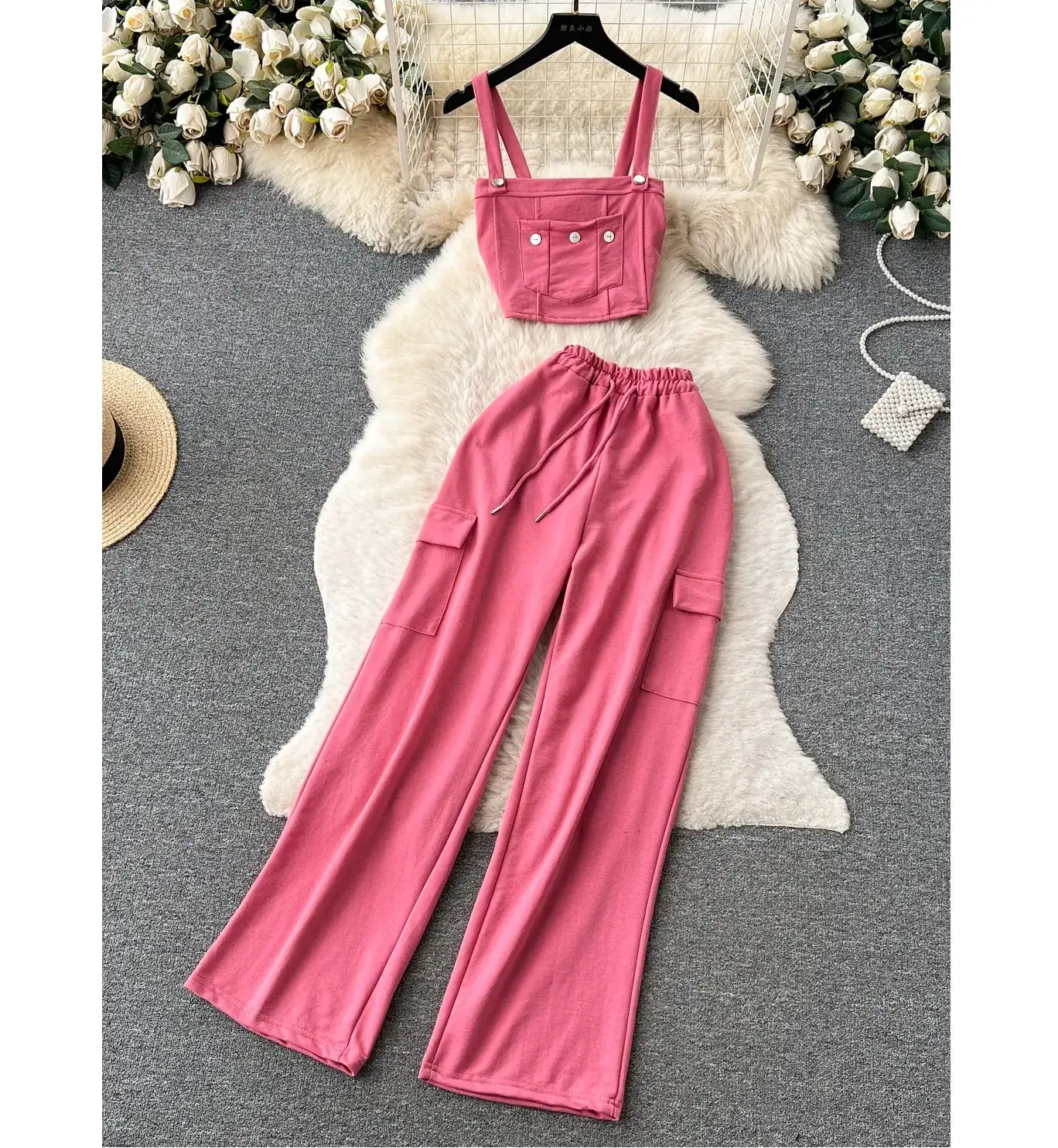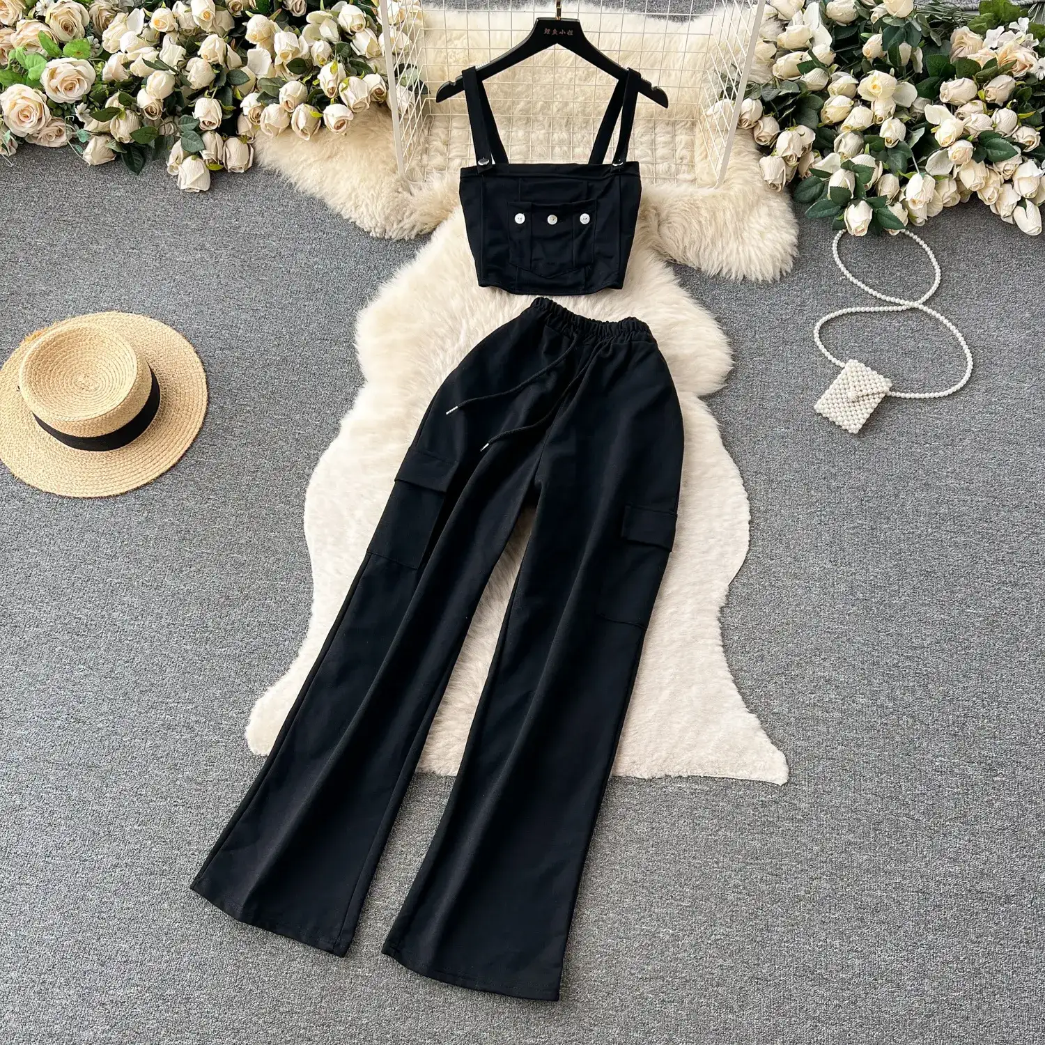 Denim Suit Women Summer Crop Top Camisole Vest Sense Wide Leg Pants 2 Pieces