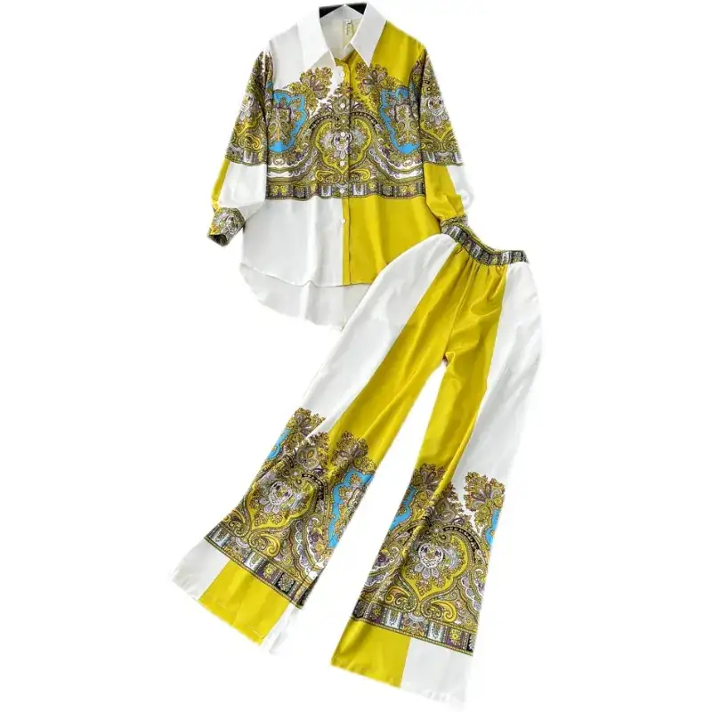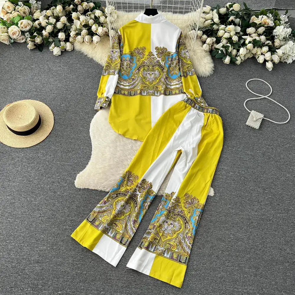 French Loose Long Sleeve Single Breasted Shirt High Waisted Wide Leg Pants Fashion Print Two Piece Set