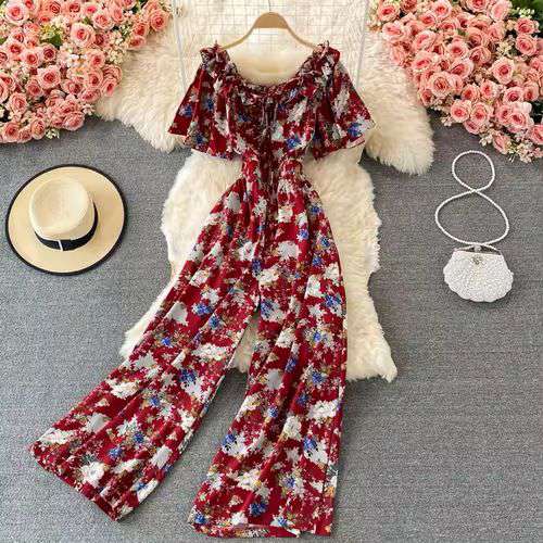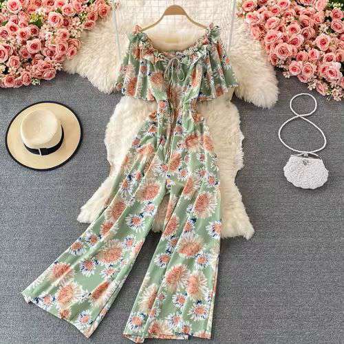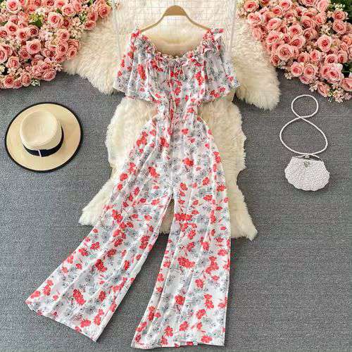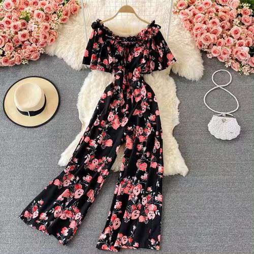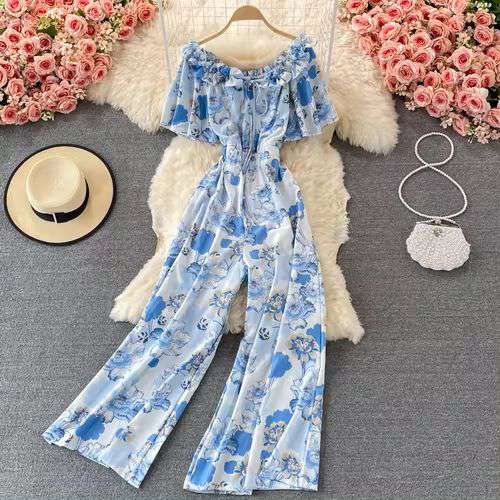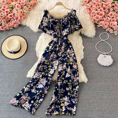 Off Shoulder High Waist Vacation Style Jumpsuit Women's Drooping Wide Leg Floral Playsuits