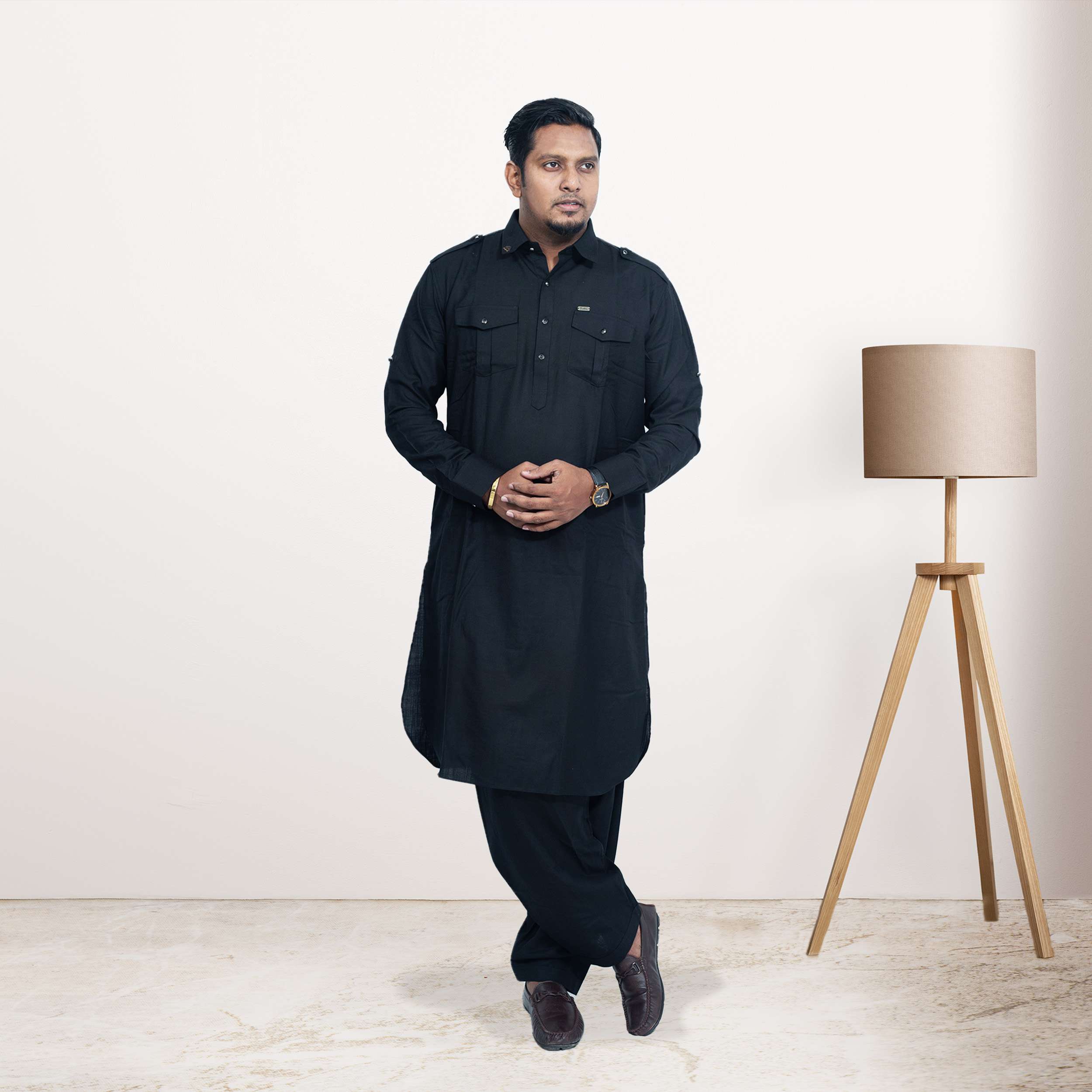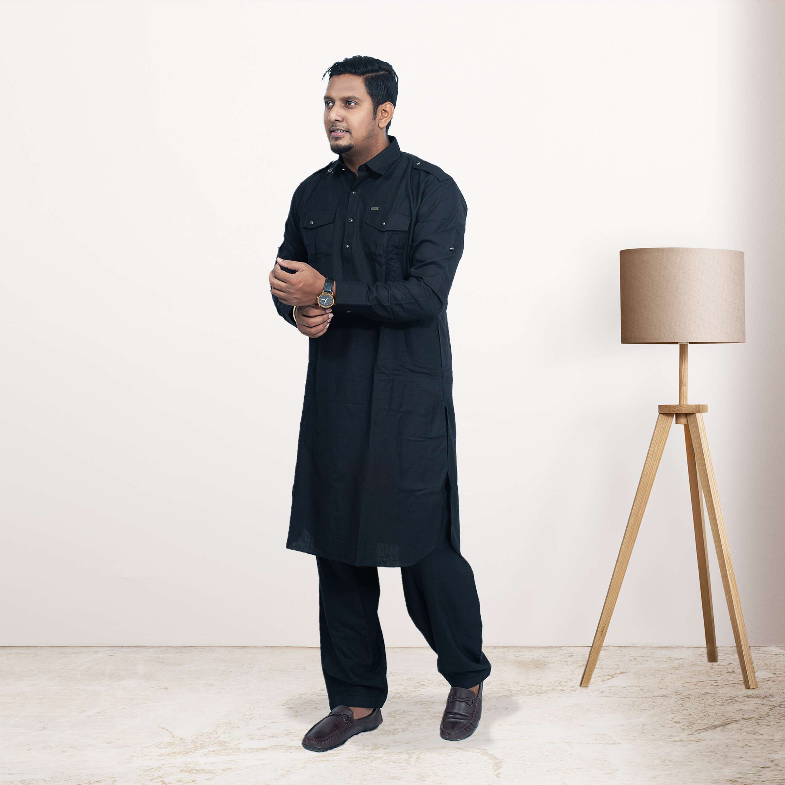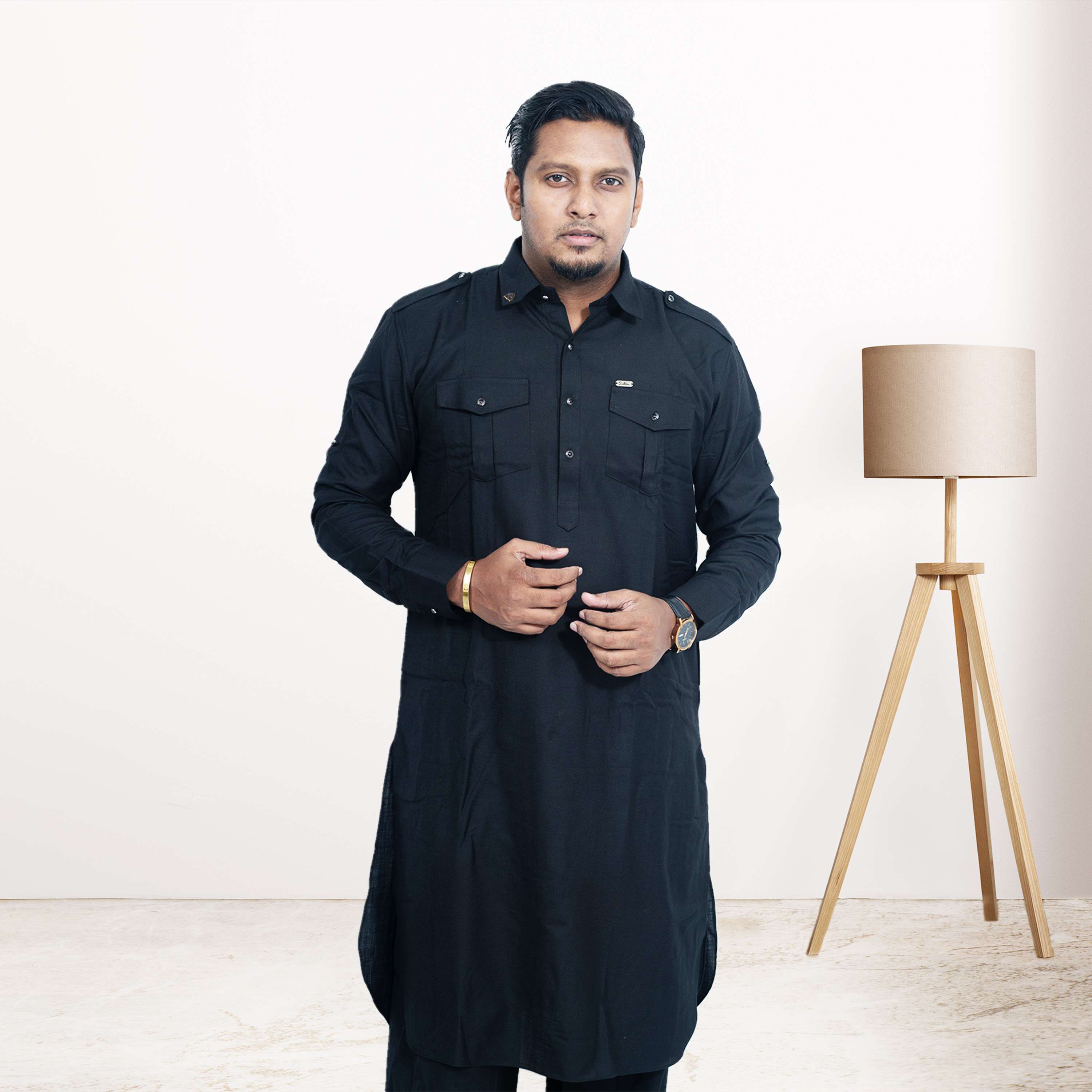 The Platinum Black Kabli Panjabi Set is an elegant ensemble typically worn by men for formal or semi-formal occasions in South Asian cultures, particularly in countries like Bangladesh and parts of India and Pakistan.