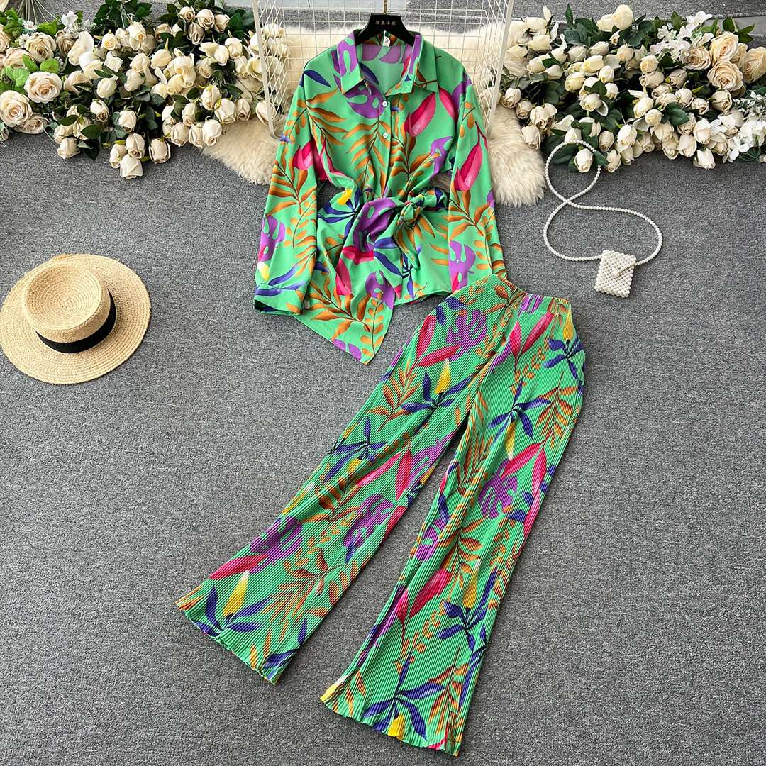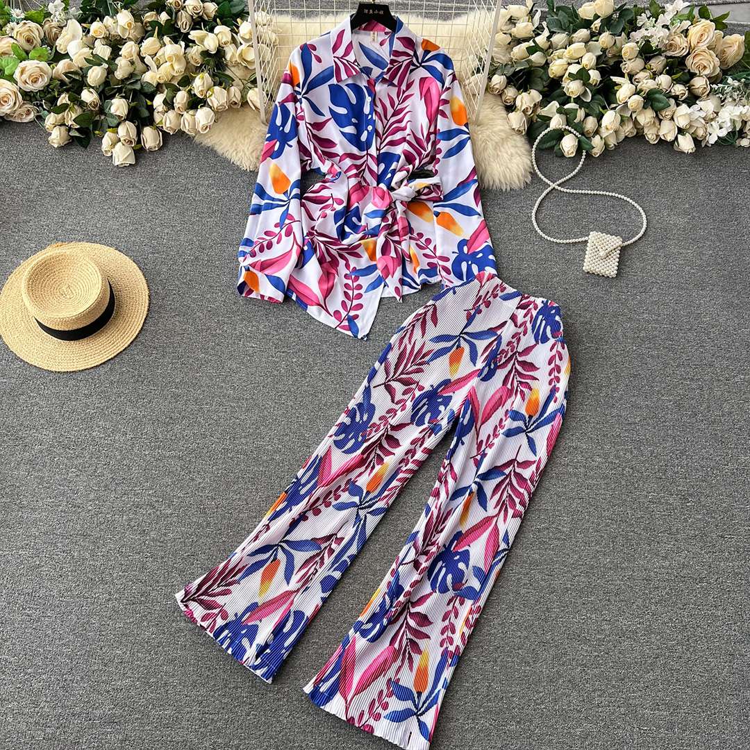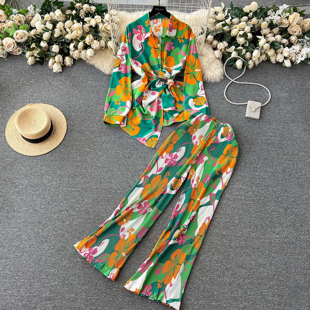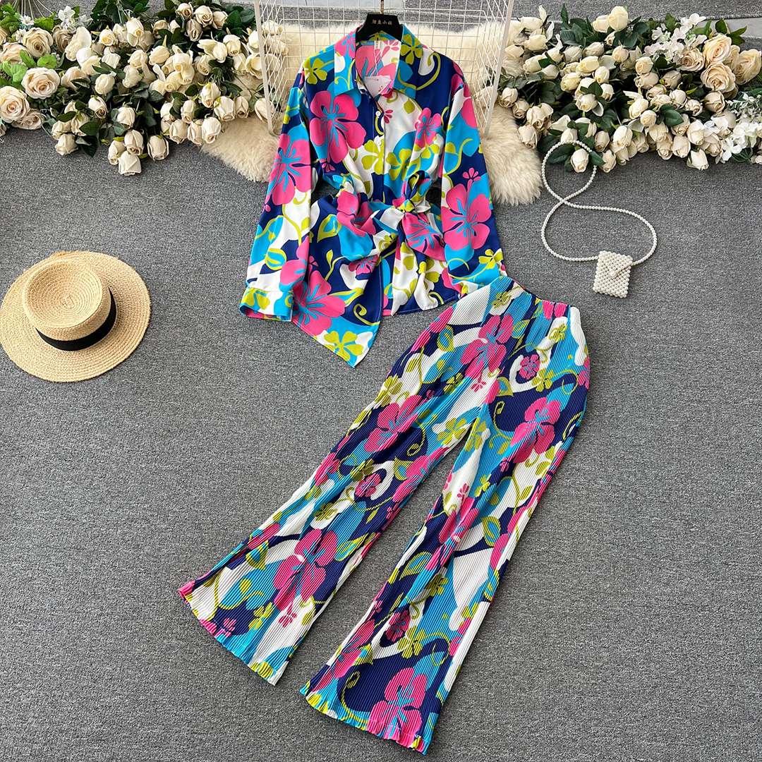Premium floral Fashion set women fall loose long sleeve shirt high waisted draped trousers 2 piece set