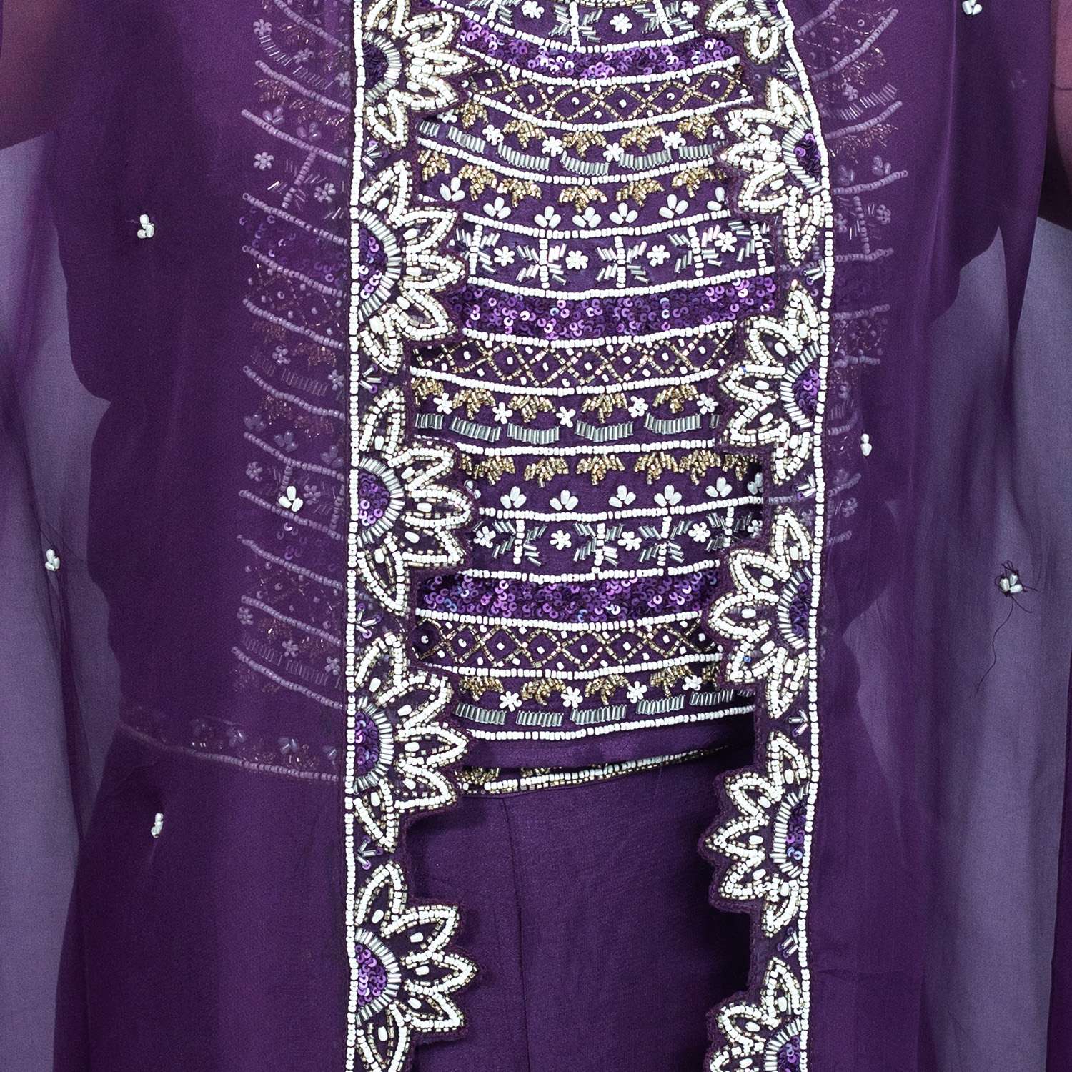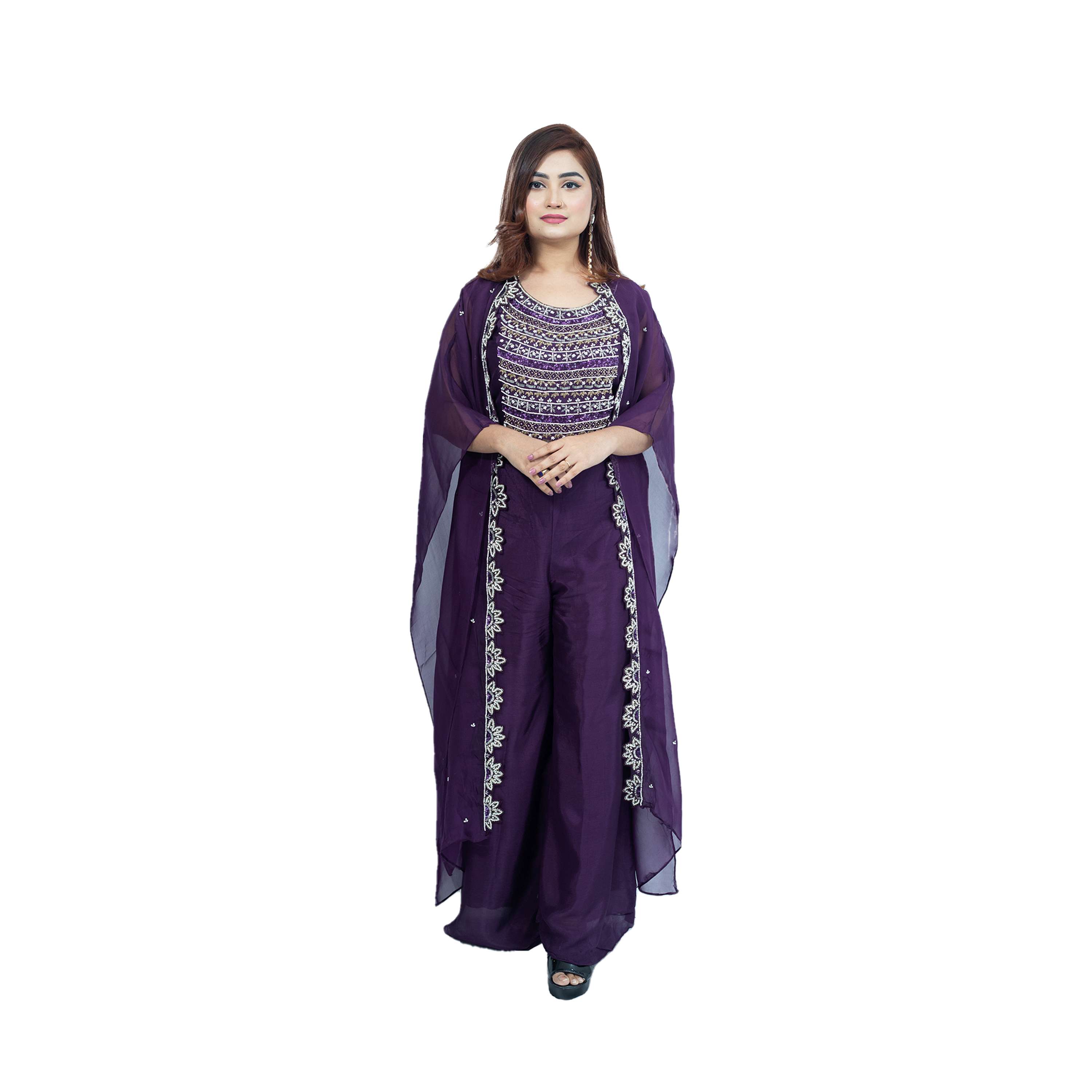 The vibrant purple hue of the dress exudes warmth and joy, perfect for celebratory events. The silhouette strikes a harmonious balance between traditional and contemporary elements, featuring a flattering A-line cut that drapes gracefully around the body.