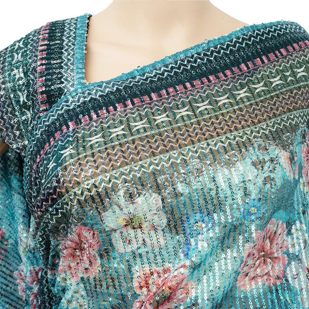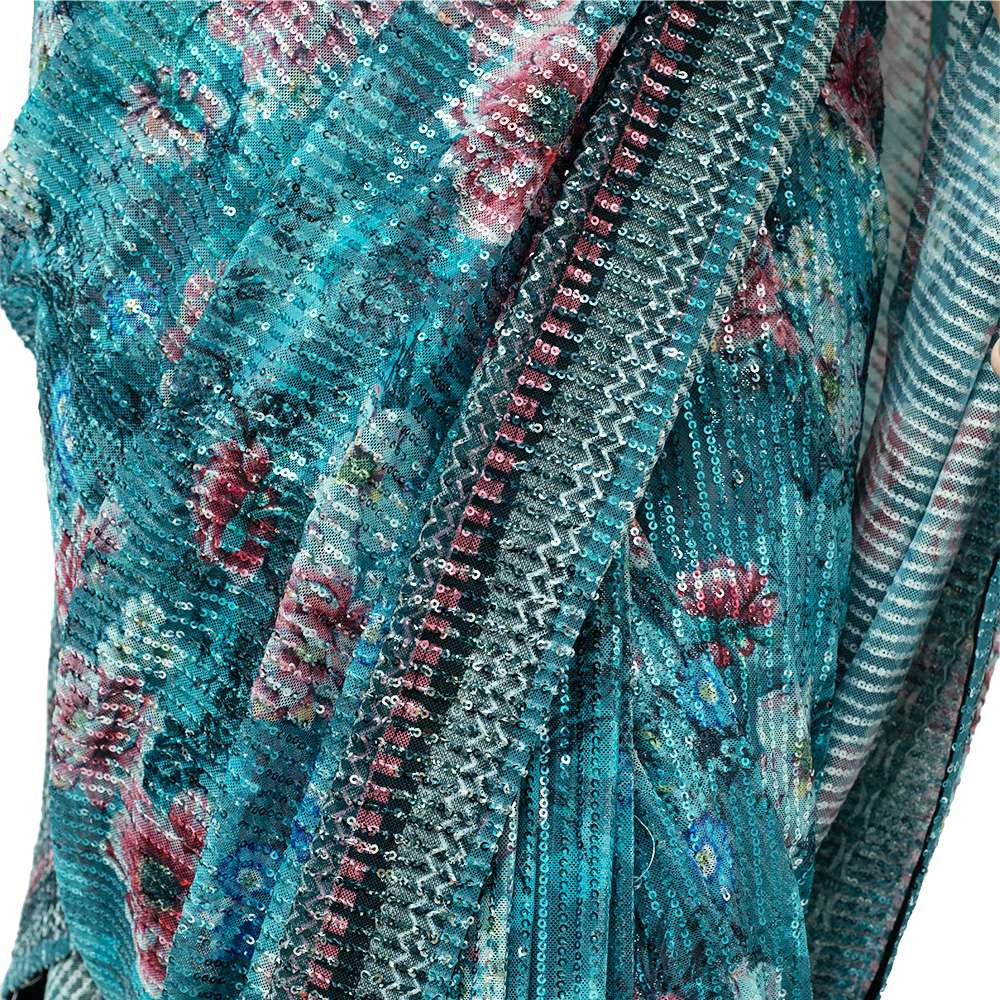 Design: The saree features intricate floral prints that are delicately adorned with sequins, adding a touch of sparkle and glamour. The floral patterns are meticulously designed to create a captivating visual appeal, making it perfect for various occasions.