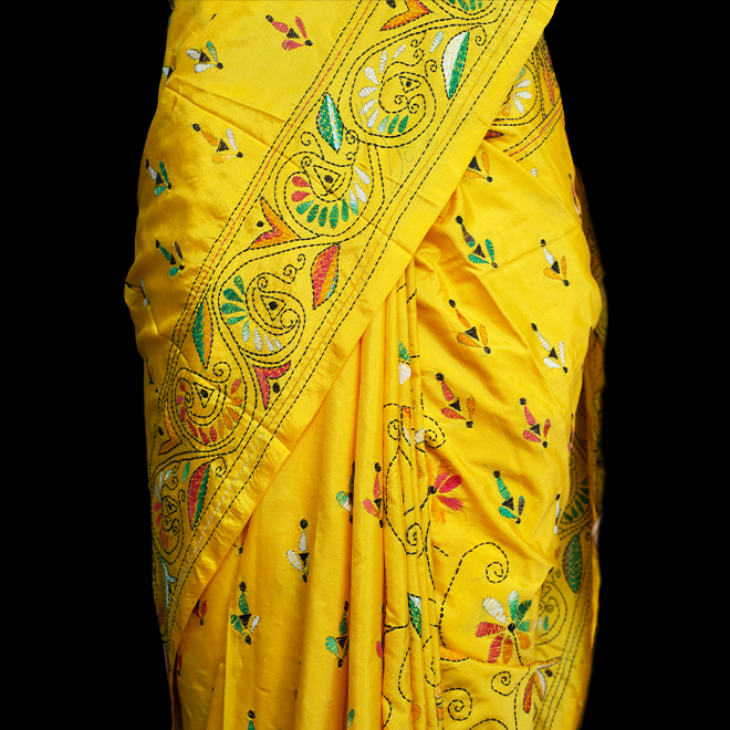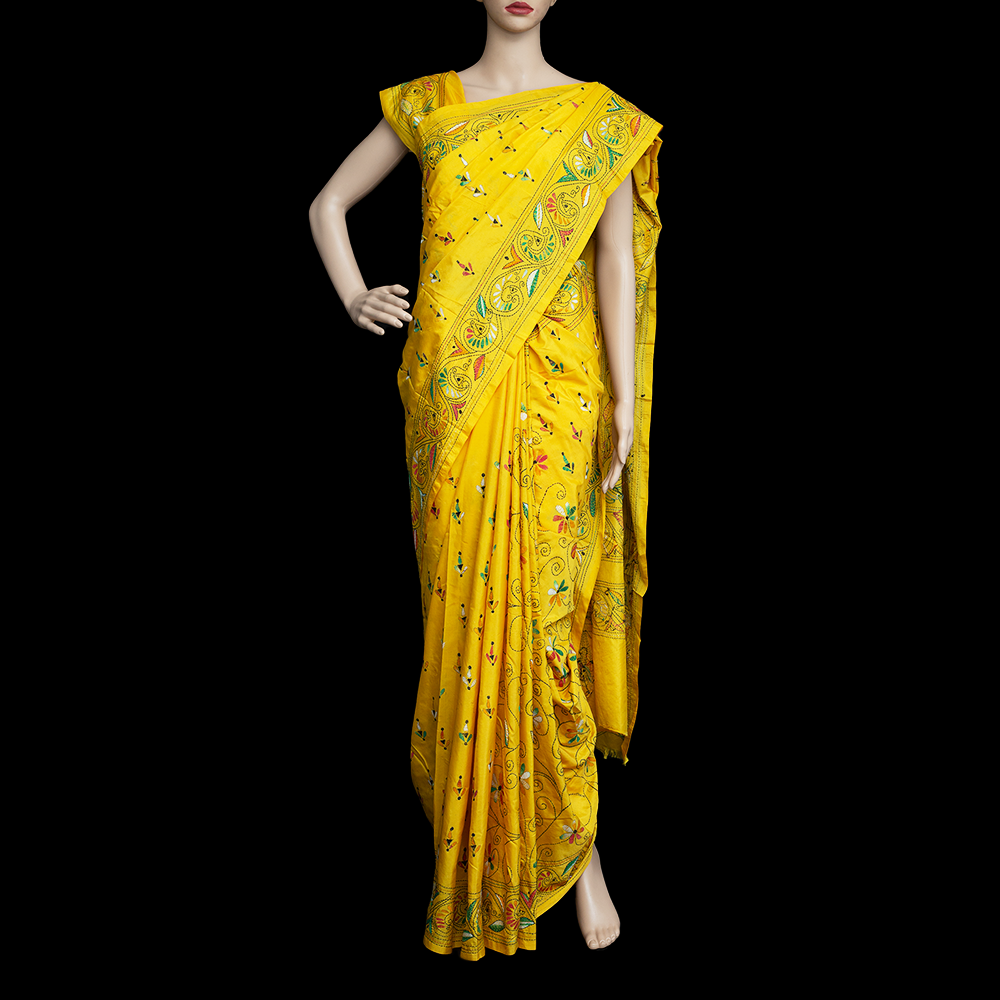 Mustard Gold Tussar Silk Hand Embroidery Kantha Stitch Saree