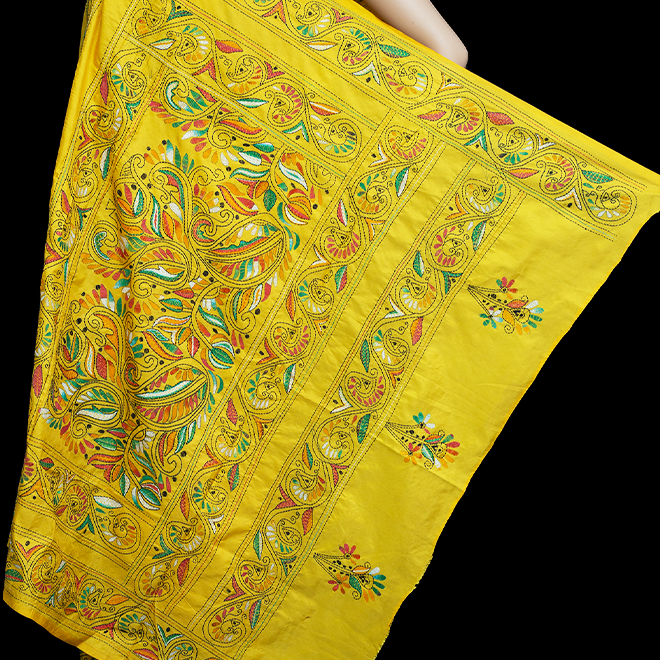 The mustard gold base of this saree exudes warmth and elegance, making it a perfect choice for both daytime events and evening soirées. The soft sheen of the silk fabric lends a luxurious appeal, while the intricate hand embroidery in Kantha stitch adds an artisanal touch, showcasing the skilled craftsmanship of Indian artisans.