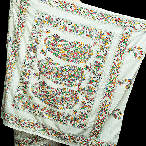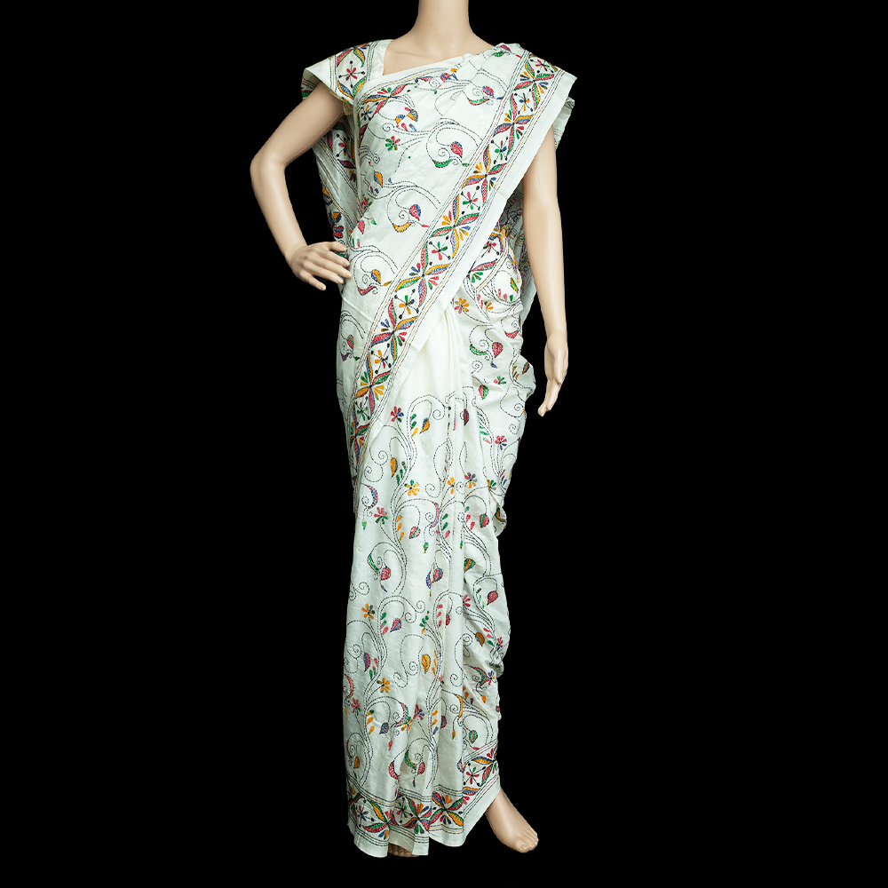 The White Kantha Stitch Blended Silk Saree is a stunning piece of traditional attire that beautifully combines the elegance of silk with the intricate artistry of Kantha stitching. Here's a full description: