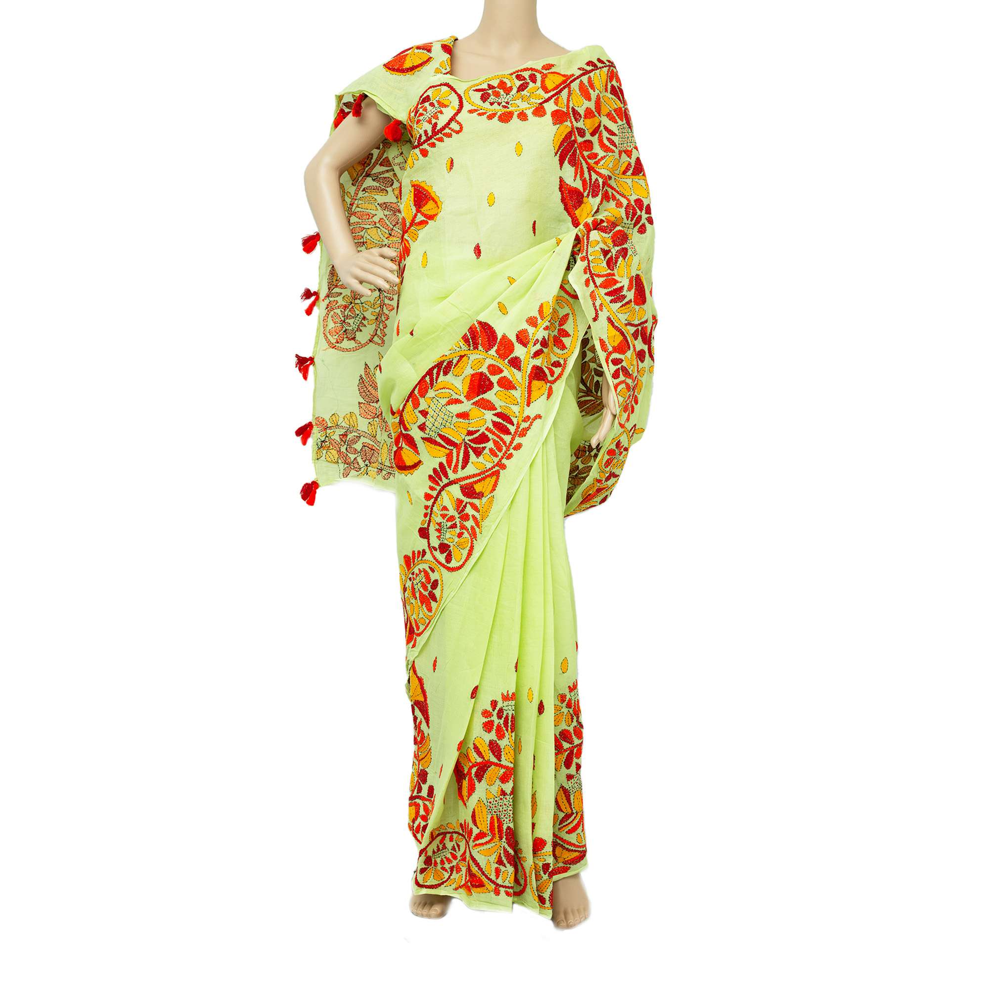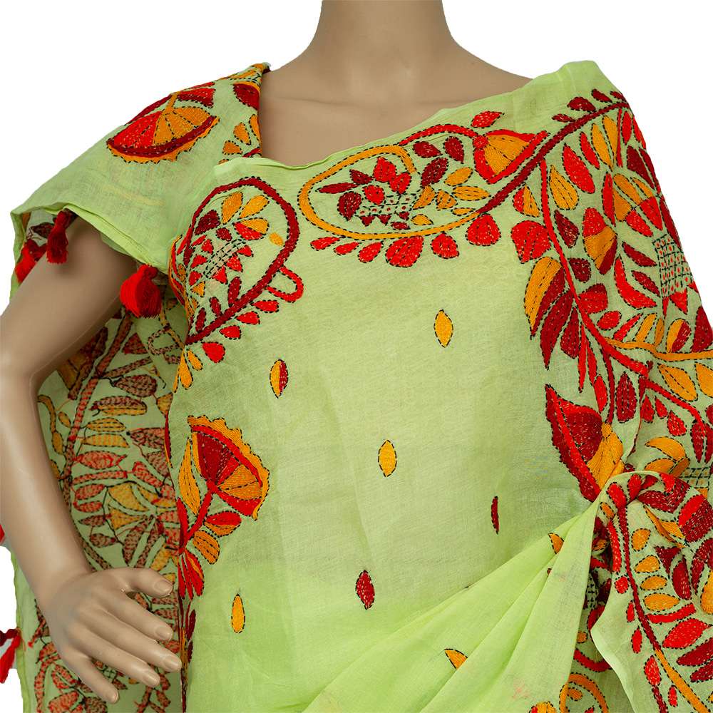 The Lemon Cotton Katha Stitch Saree with Embroidery and Tassel Trim is a vibrant and elegant saree perfect for various occasions. Here's a detailed description: