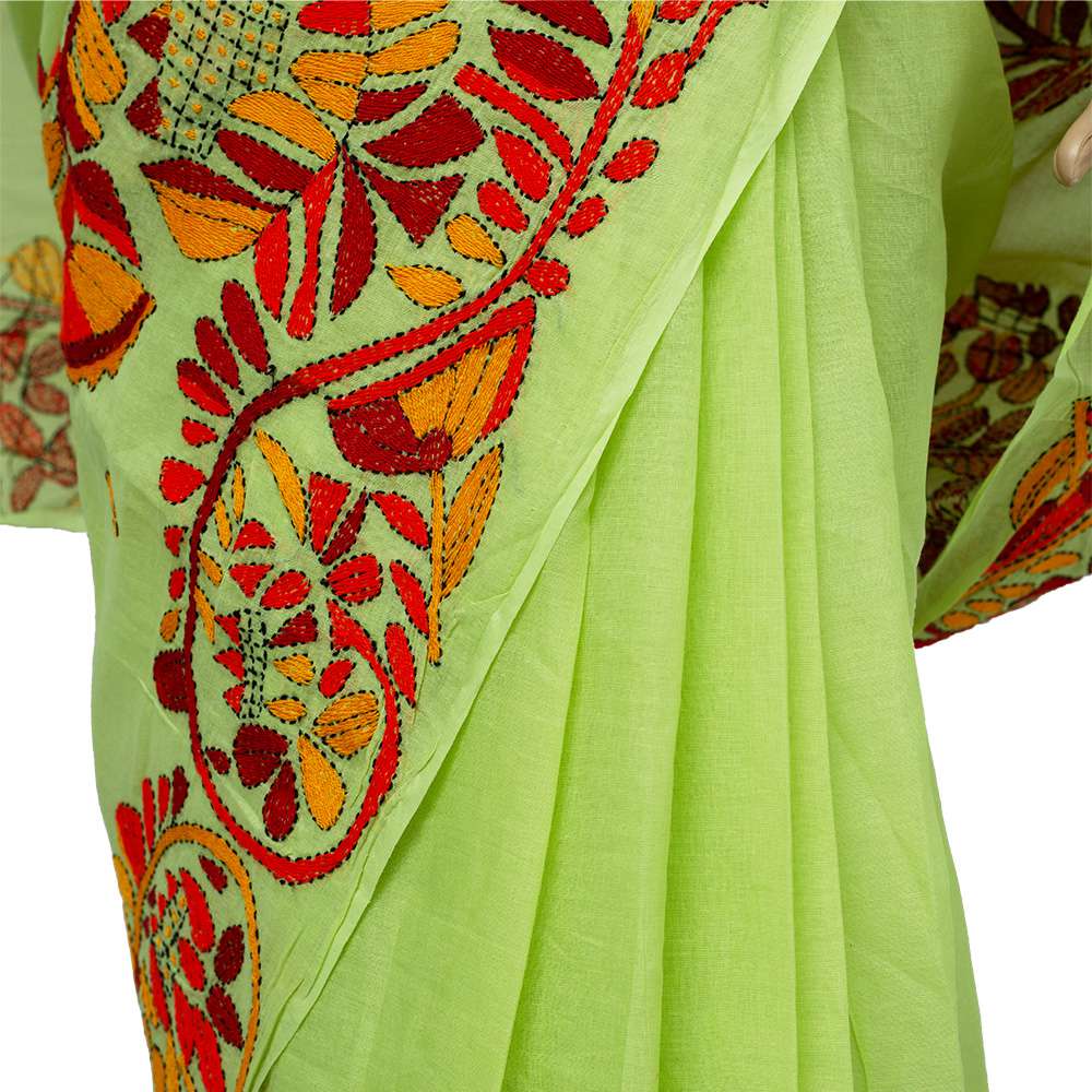 Design: The saree is adorned with intricate Katha stitch embroidery, adding a touch of traditional charm and sophistication. The embroidery work is meticulously done, showcasing fine craftsmanship and attention to detail.