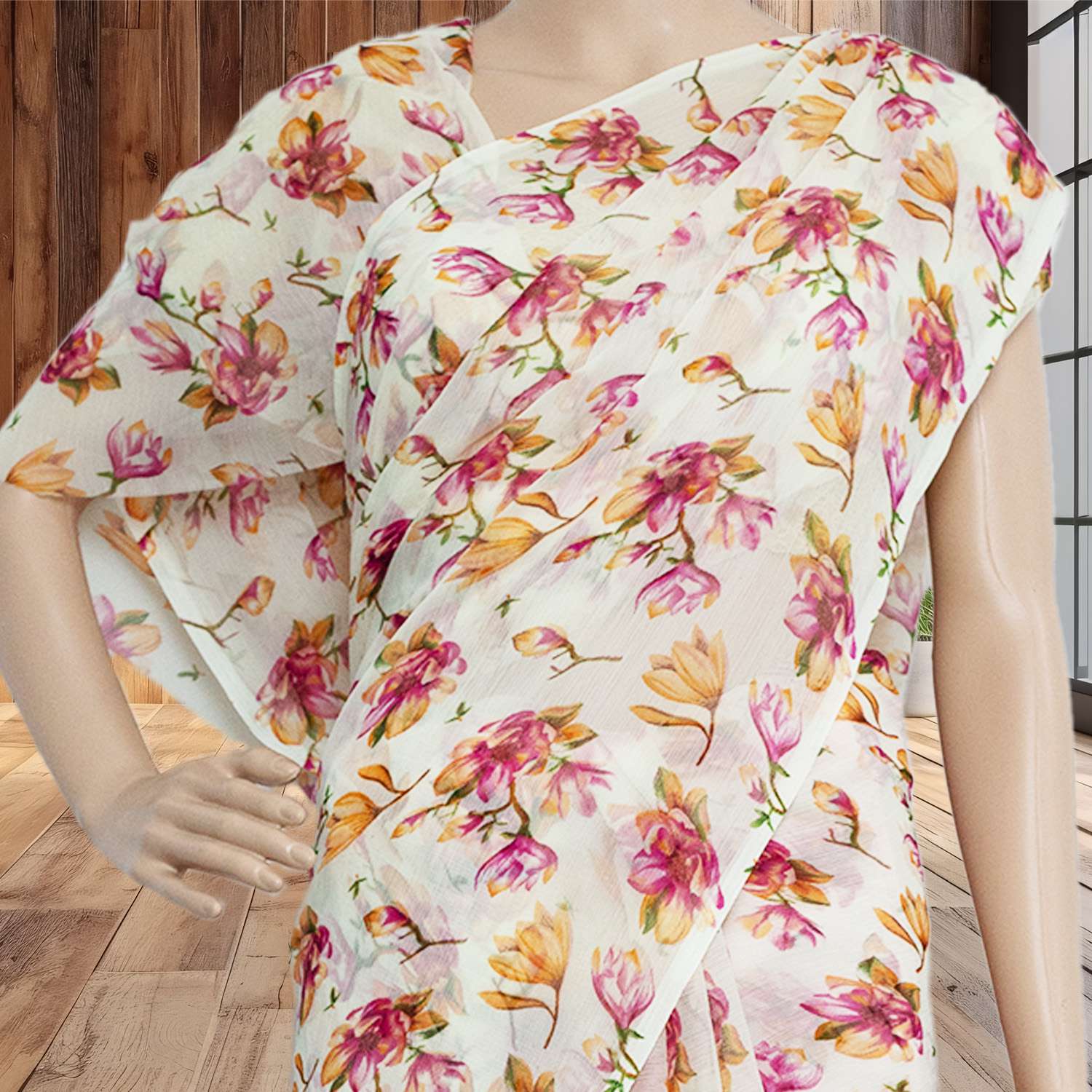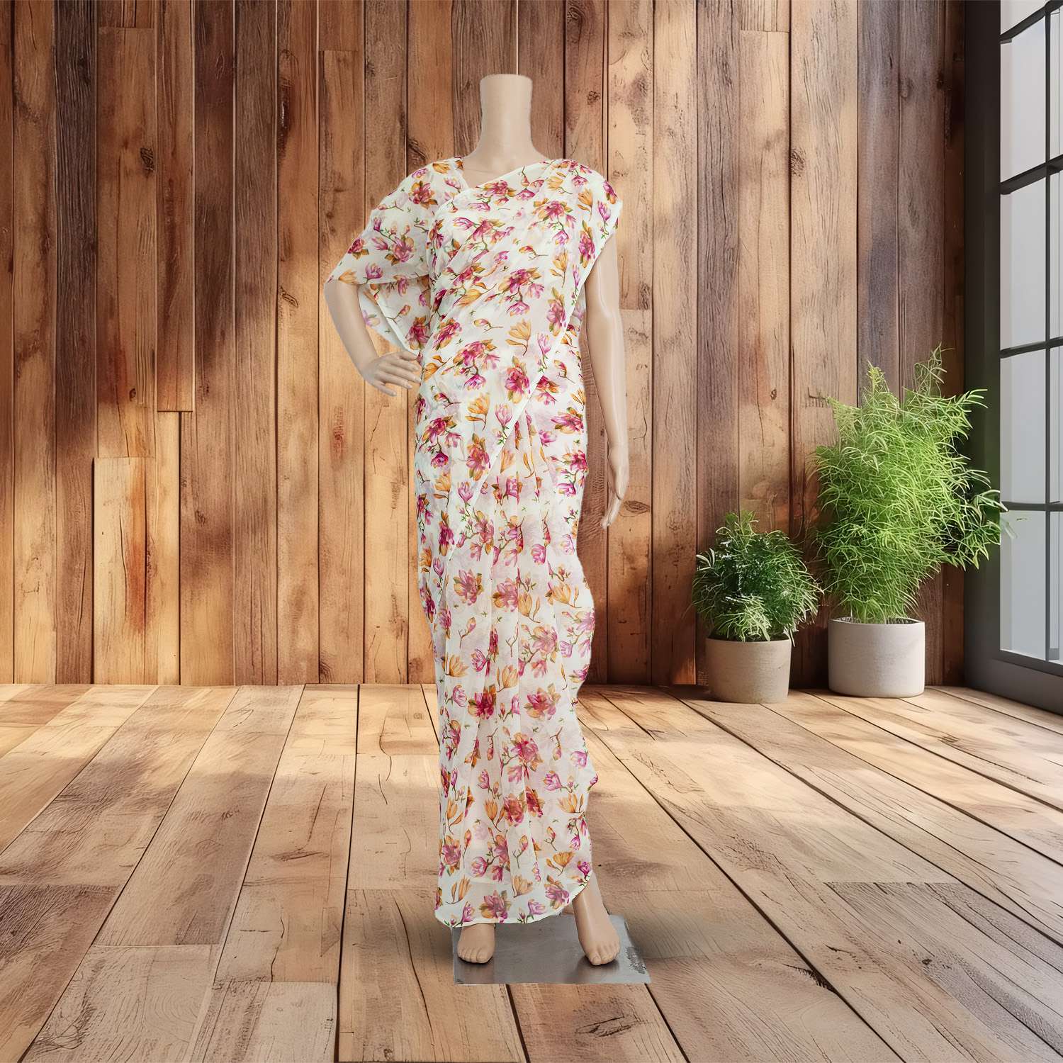 This elegant saree features a beautiful floral print on soft white chiffon fabric. Perfect for both formal occasions and casual gatherings, it exudes grace and sophistication. The lightweight chiffon material drapes gracefully, while the floral pattern adds a touch of femininity and charm. Ideal for those who appreciate timeless elegance with a hint of romance.