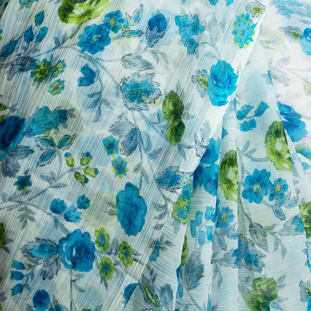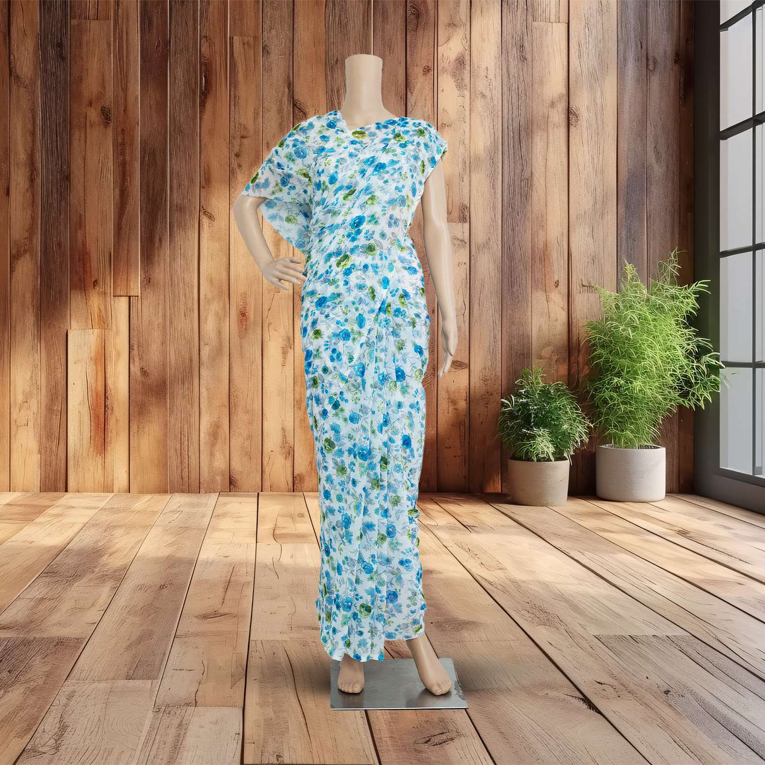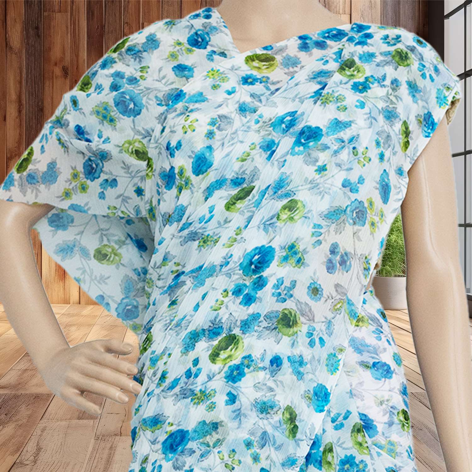The Floral Printed Blue Chiffon Saree is a graceful and elegant attire that embodies the beauty of traditional Indian fashion with a modern twist. Here's a detailed description: