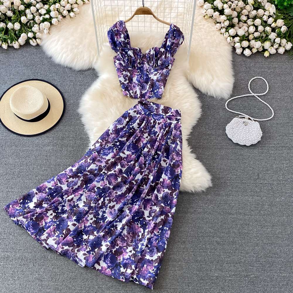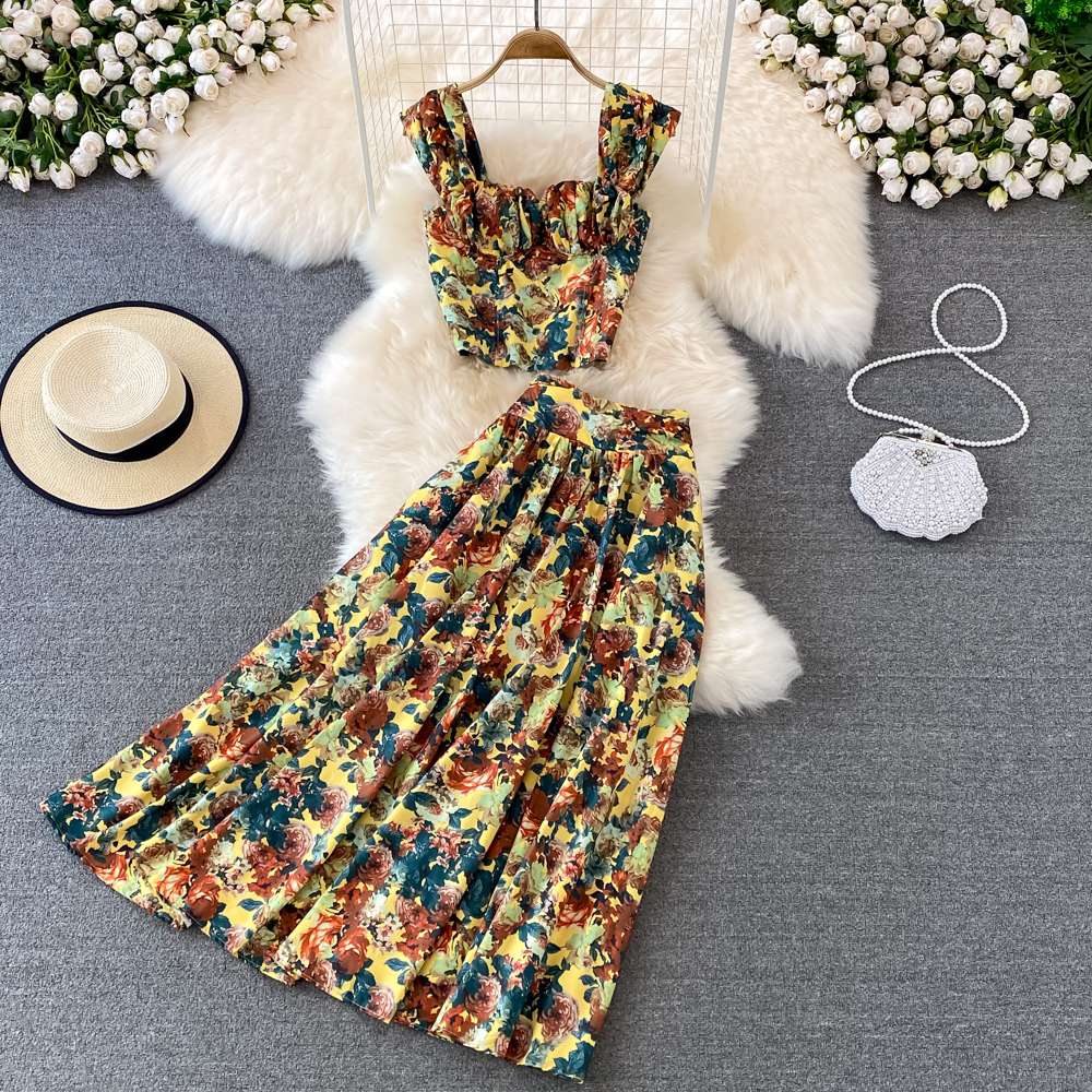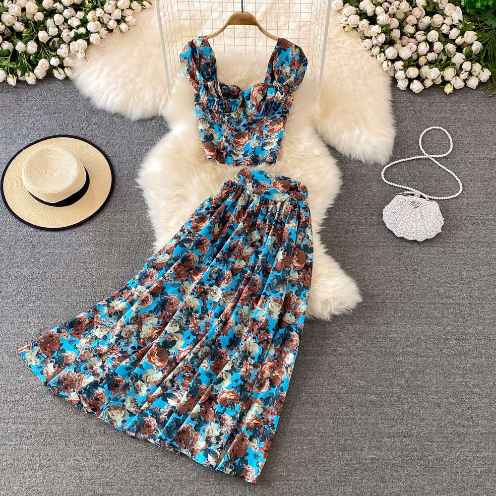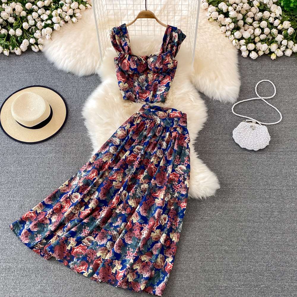 Seaside Vacation Fashion Suit Women High Waist Long A-Line Floral Skirt Two-Piece Set