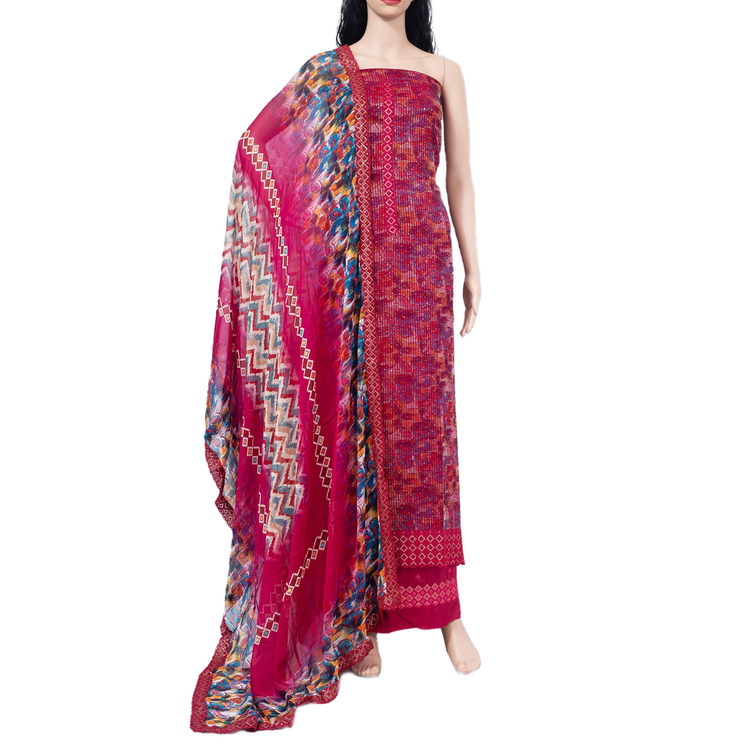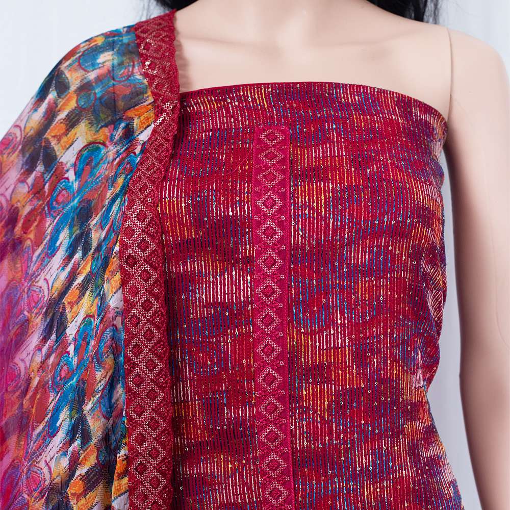 Soft georgette kamiz paired with a chiffon dupatta featuring intricate all-over threadwork and sequin embellishments. This elegant ensemble blends the lightweight and flowy texture of georgette with the delicate shimmer of sequins, creating a graceful and sophisticated look. The meticulous threadwork adds depth and dimension to the attire, enhancing its overall appeal. Perfect for special occasions or festive gatherings, this ensemble exudes timeless charm and effortless glamour.