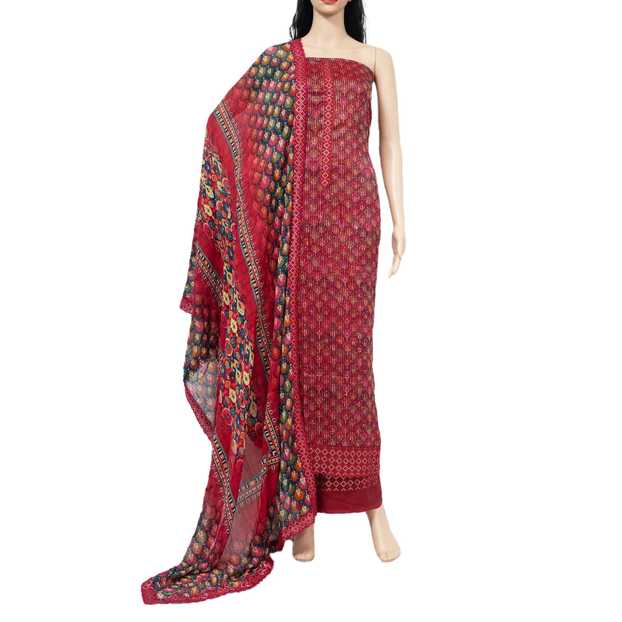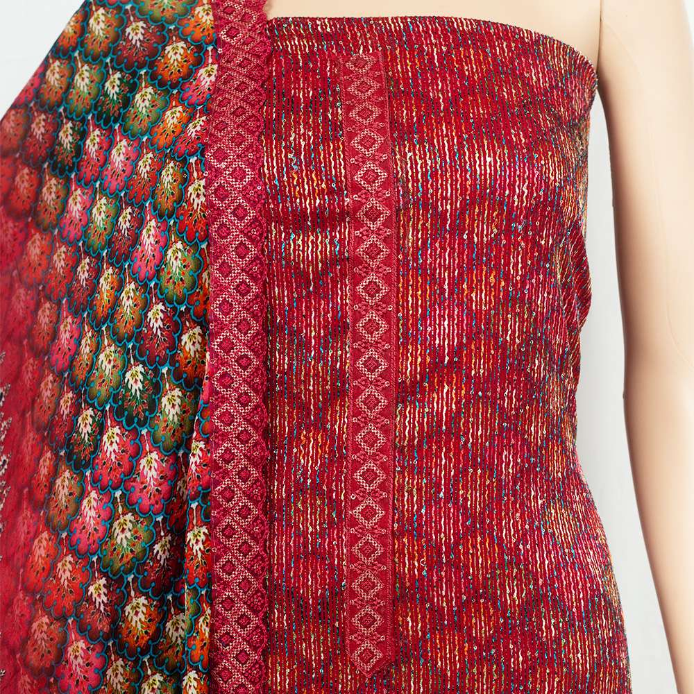 Soft georgette kamiz paired with a chiffon dupatta featuring intricate all-over threadwork and sequin embellishments. This elegant ensemble blends the lightweight and flowy texture of georgette with the delicate shimmer of sequins, creating a graceful and sophisticated look. The meticulous threadwork adds depth and dimension to the attire, enhancing its overall appeal. Perfect for special occasions or festive gatherings, this ensemble exudes timeless charm and effortless glamour.