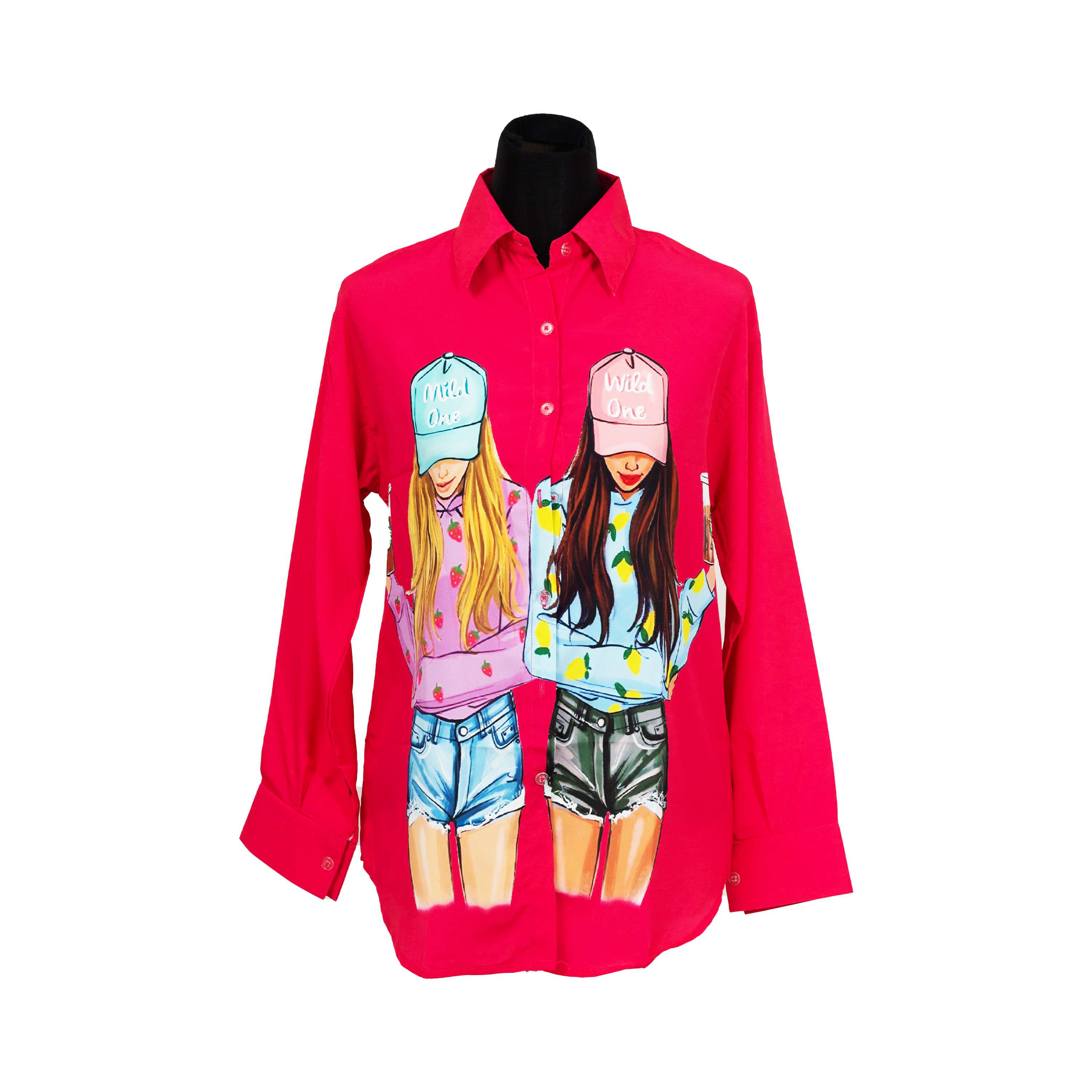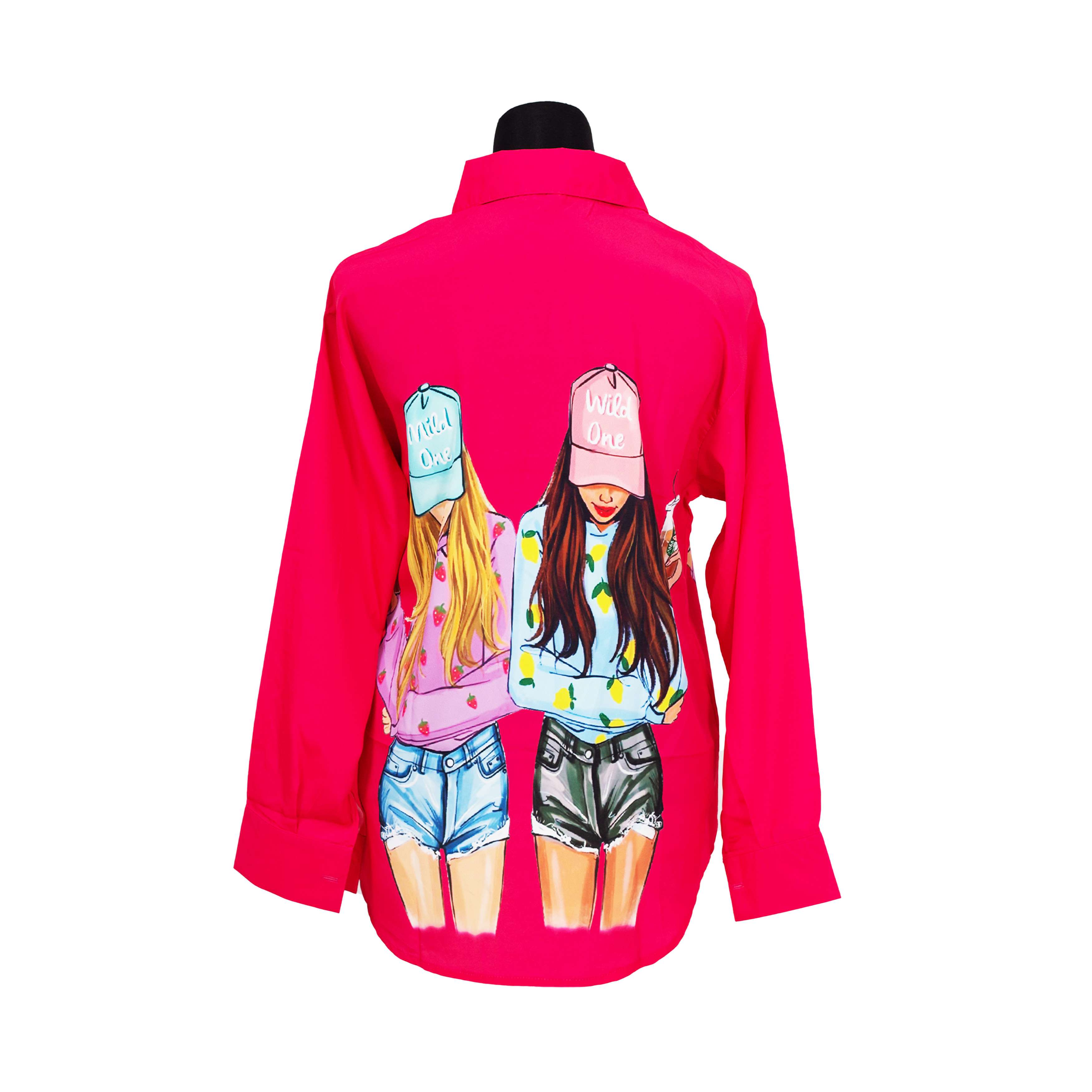 Causal Ladies Hot Pink Cartoon Long Shirt