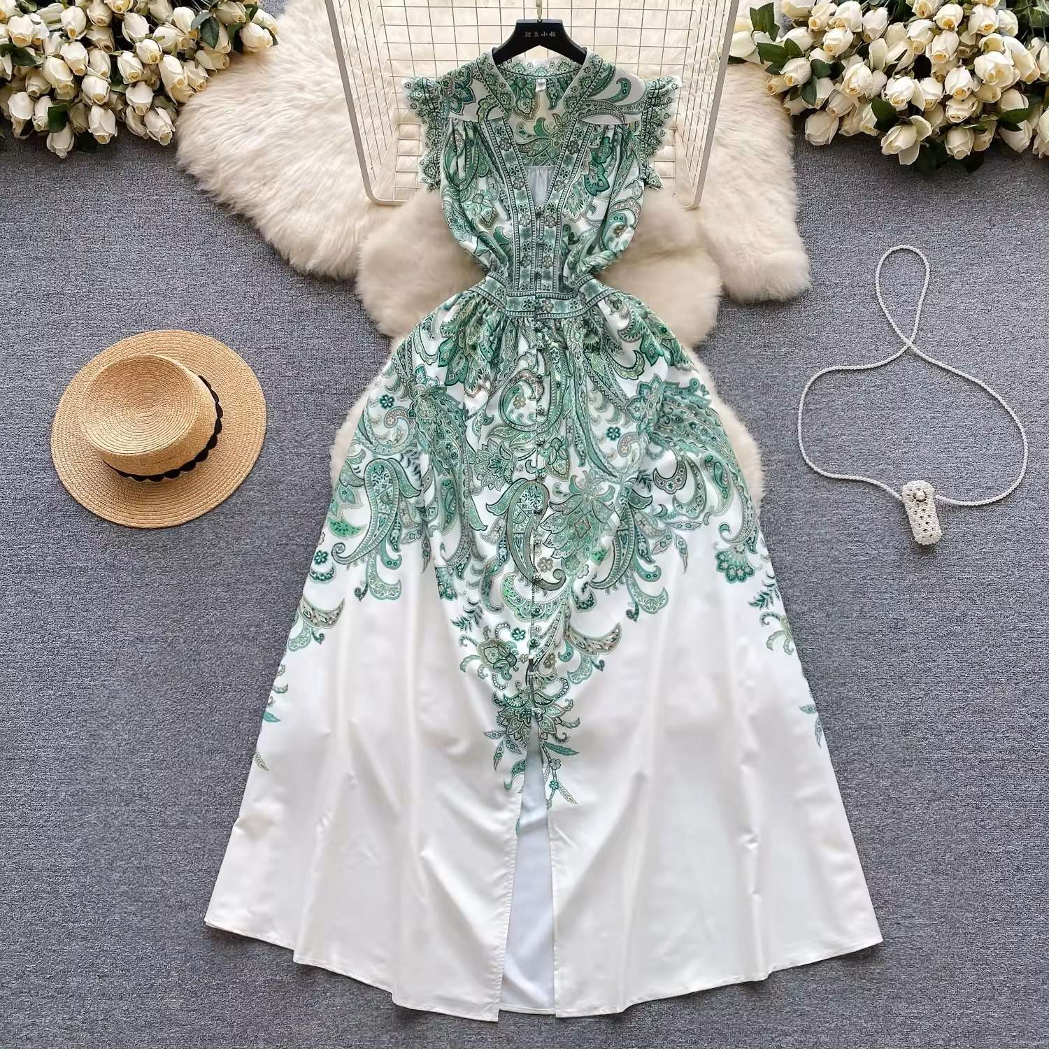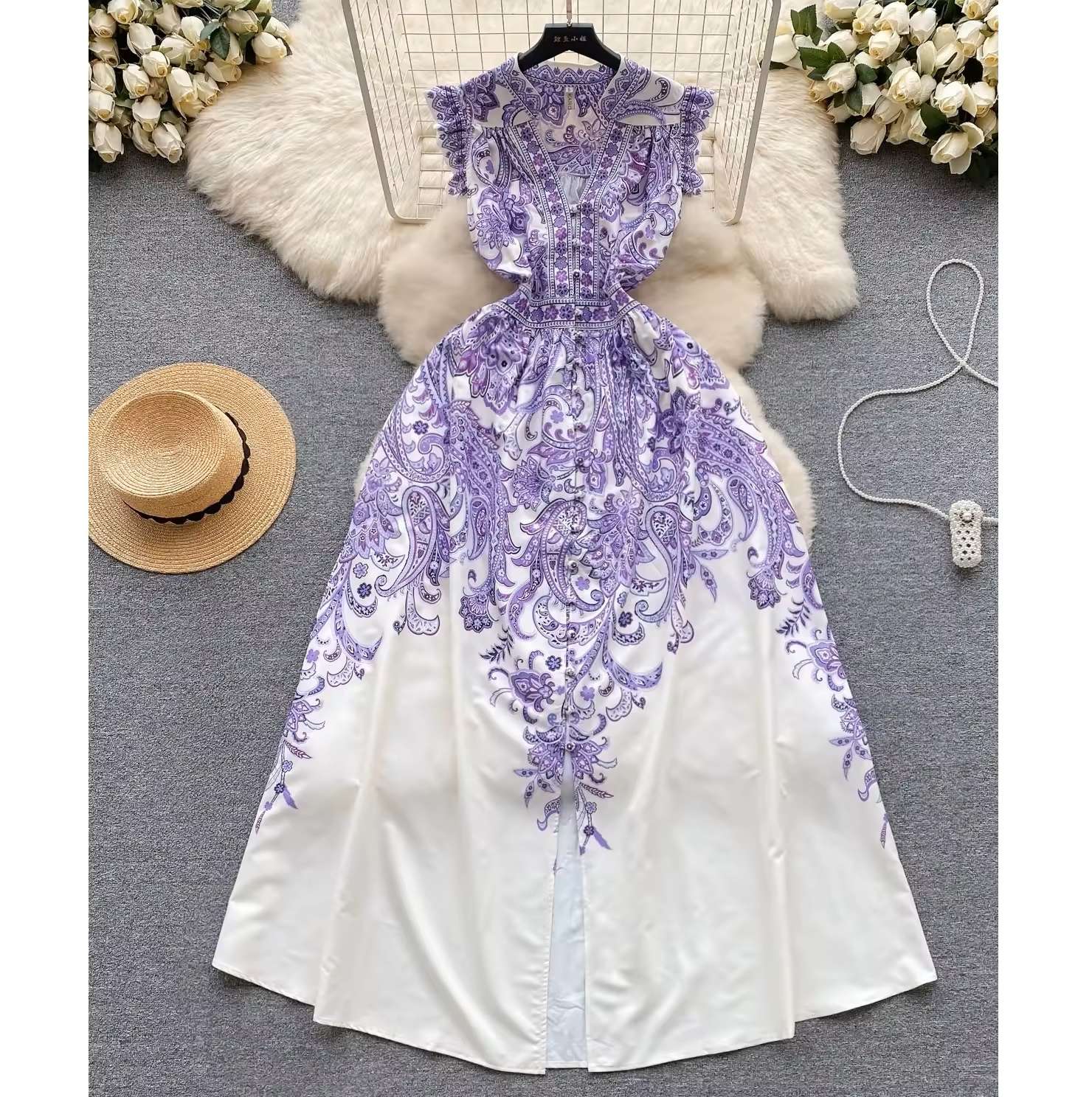 Summer Court Holiday Style Stand Collar Lantern Sleeve Wide Dress Small Flying Sleeve Long Printed Dress