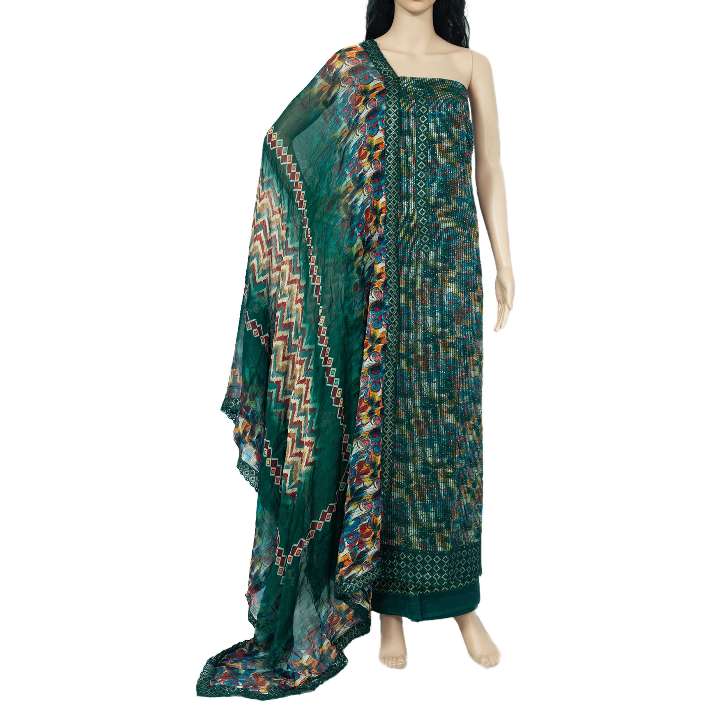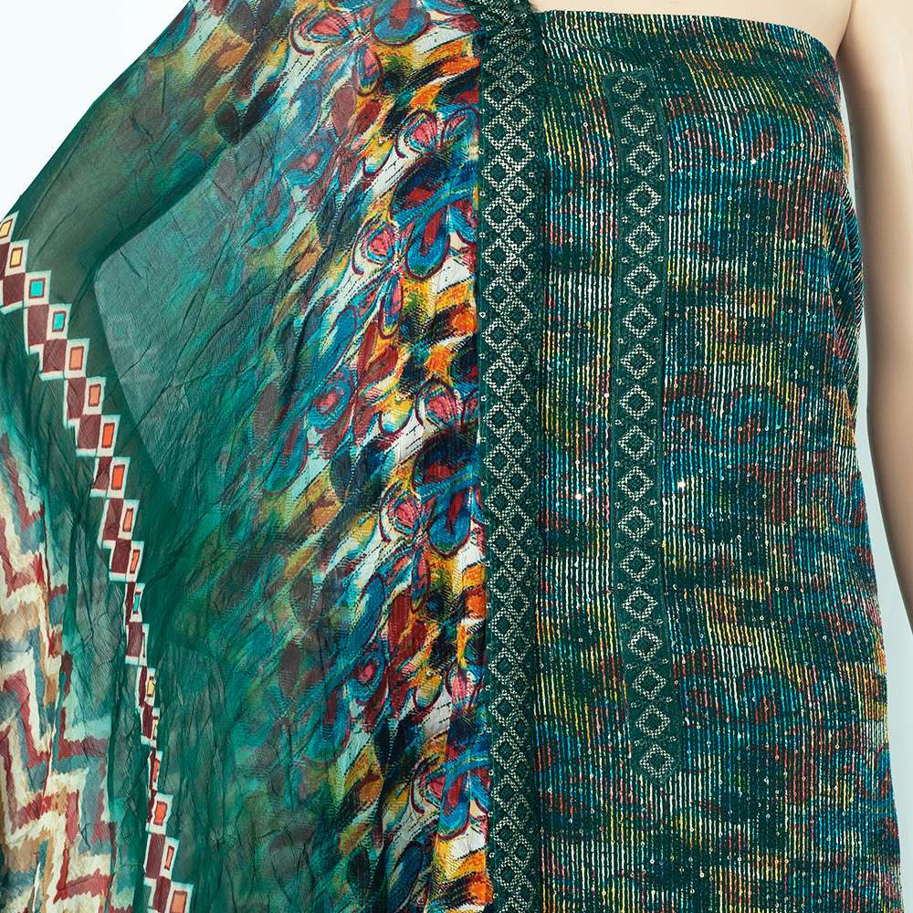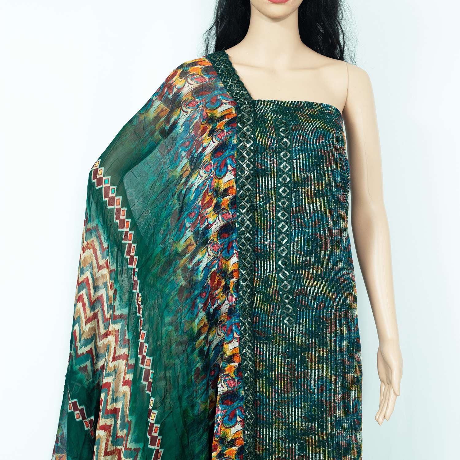 Soft georgette kamiz paired with a chiffon dupatta featuring intricate all-over threadwork and sequin embellishments. This elegant ensemble blends the lightweight and flowy texture of georgette with the delicate shimmer of sequins, creating a graceful and sophisticated look. The meticulous threadwork adds depth and dimension to the attire, enhancing its overall appeal. Perfect for special occasions or festive gatherings, this ensemble exudes timeless charm and effortless glamour.
