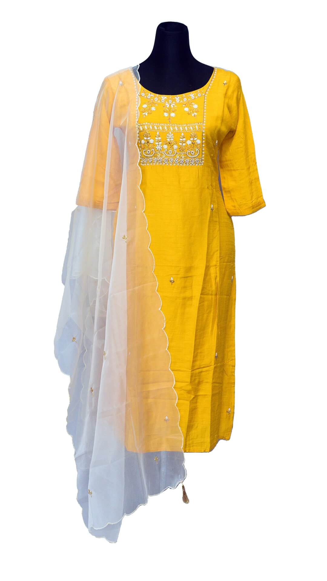Neckline, hand and chest worked with laser cut georgette Dupatta.