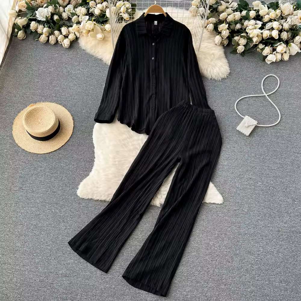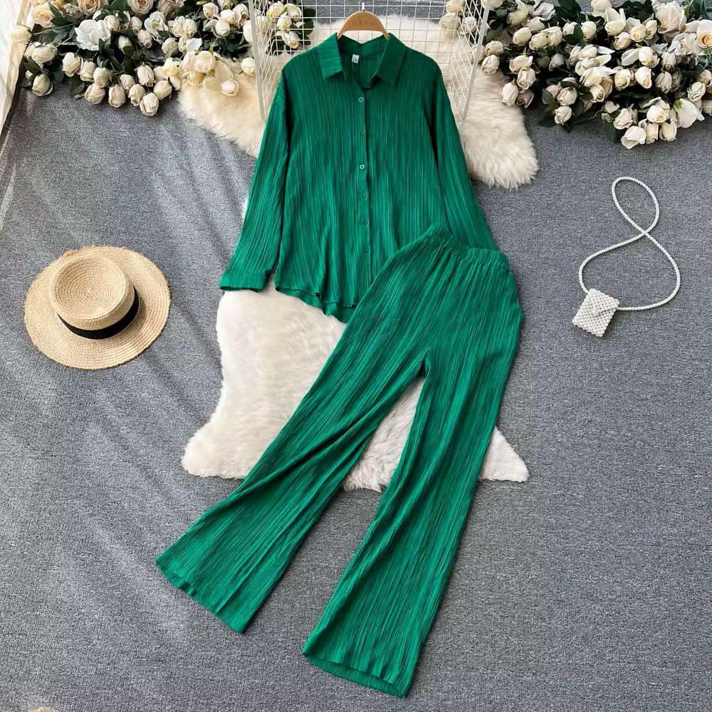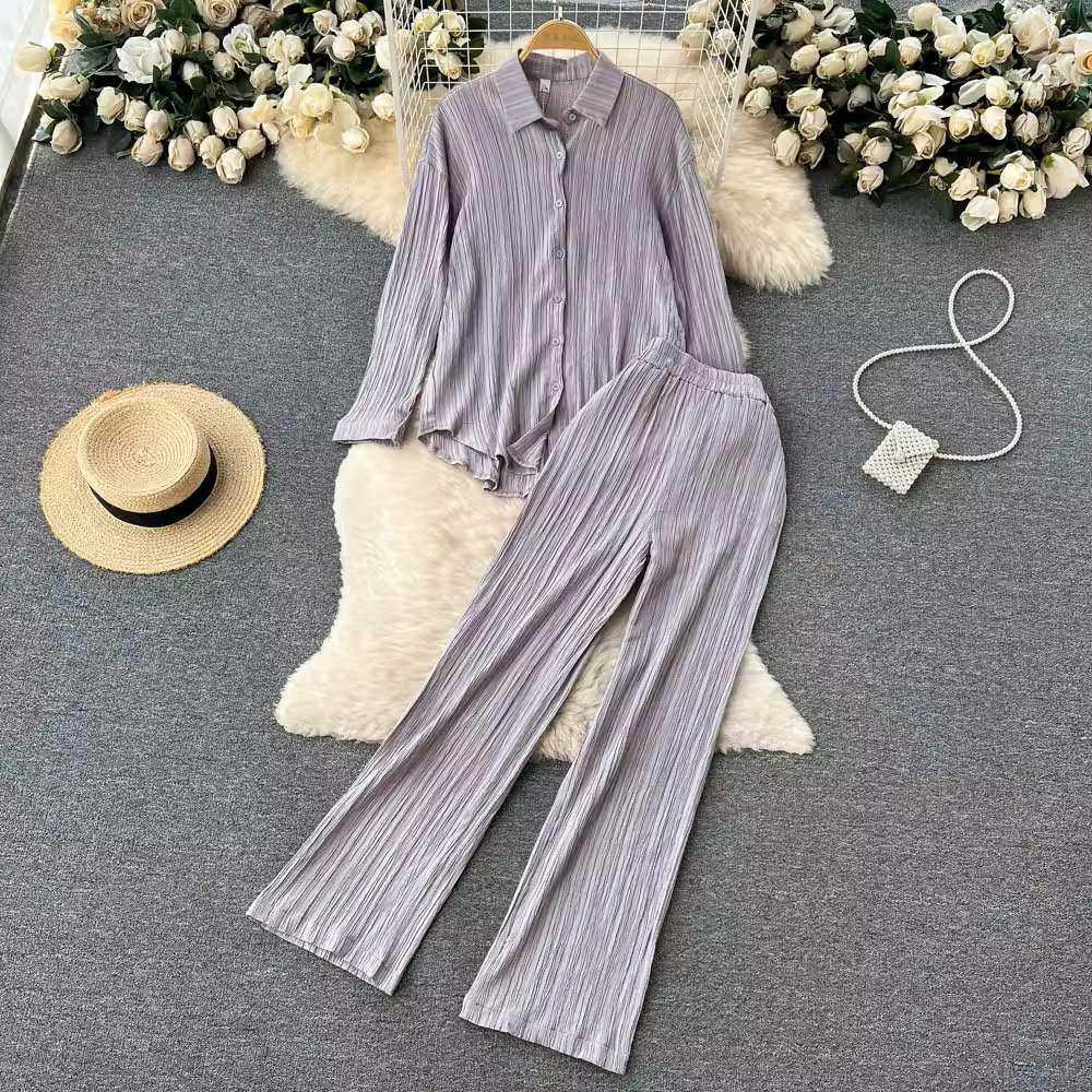 Two Piece Set Ladies Suits Office Pant Pleated Two-Piece Casual Loose Long-Sleeved Shirt High Waist Drape Wide-Leg Long Pants