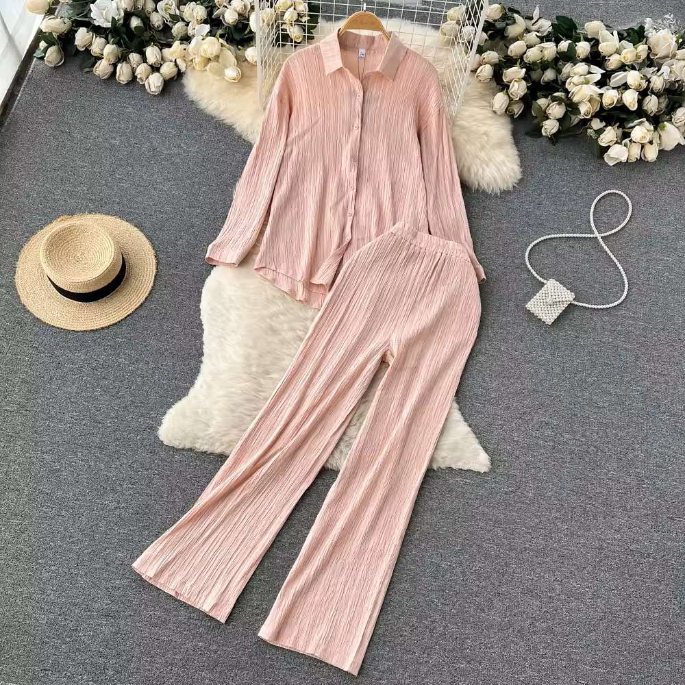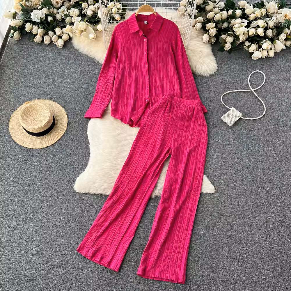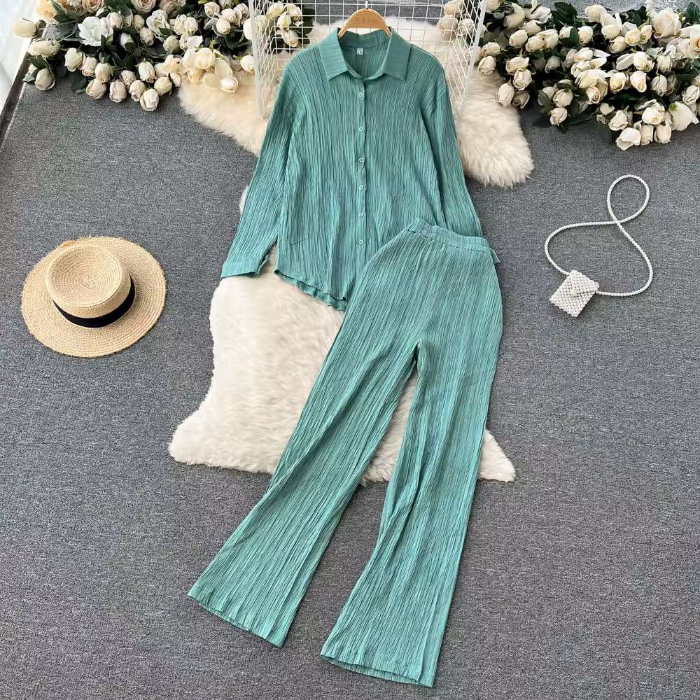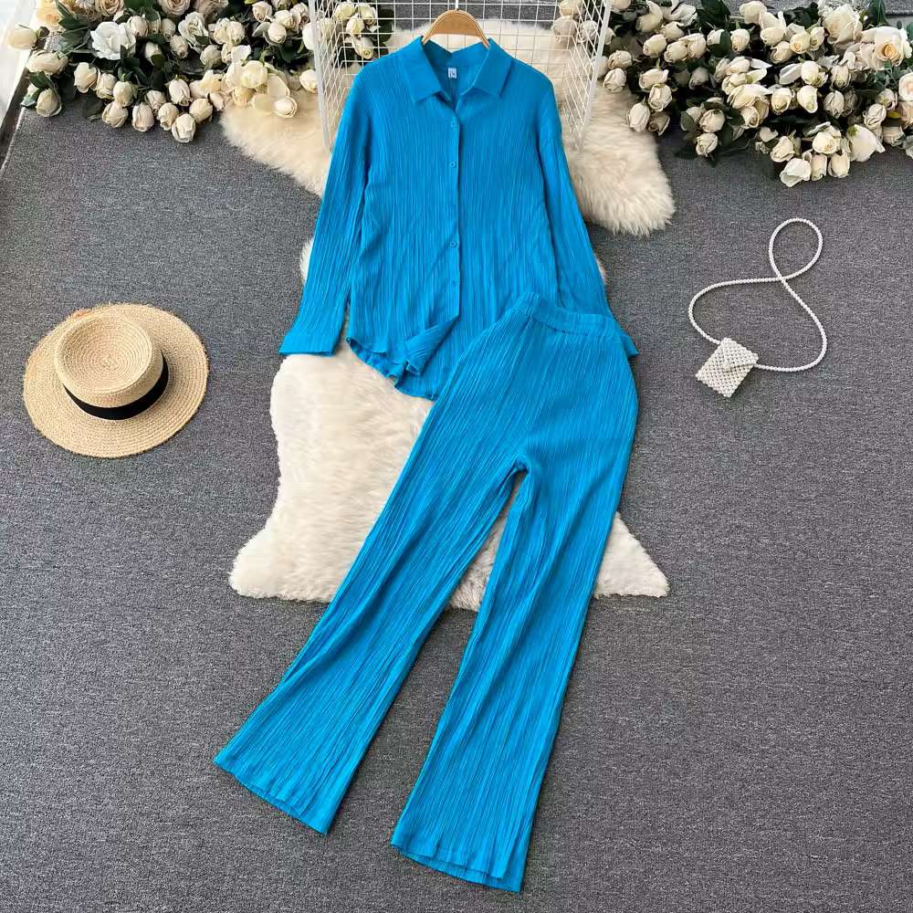 Two Piece Set Ladies Suits Office Pant Pleated Two-Piece Casual Loose Long-Sleeved Shirt High Waist Drape Wide-Leg Long Pants