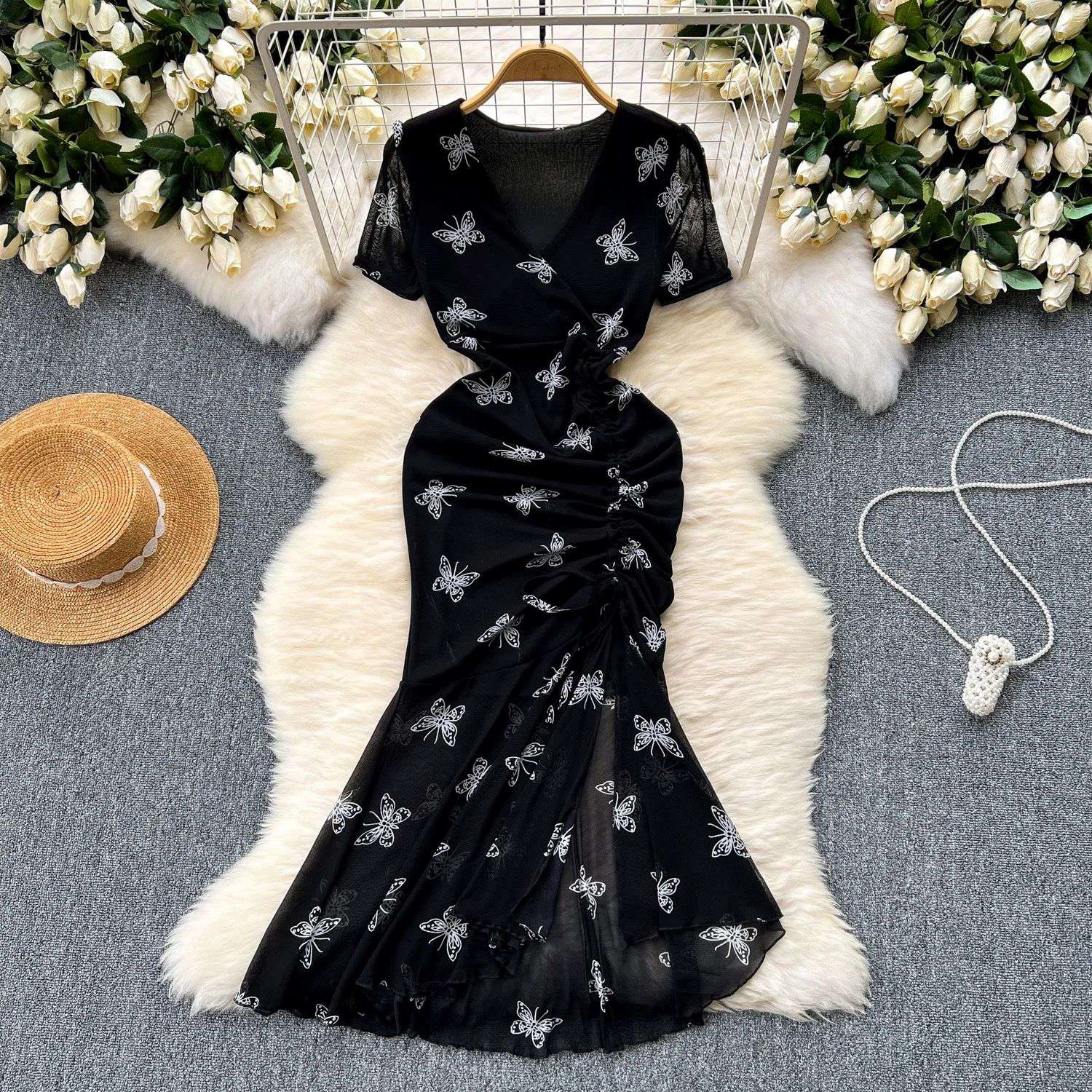 Women Child Summer New Elegant Pleated Tie Slim Fishtail Dress