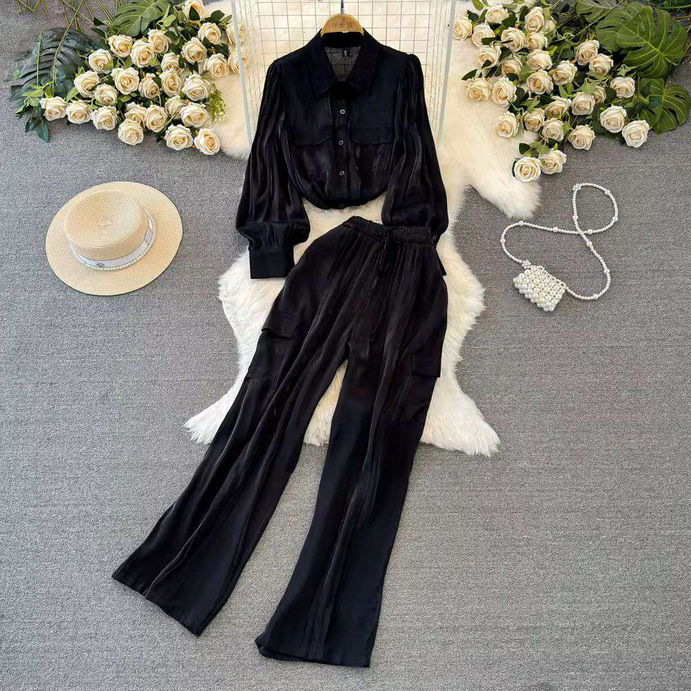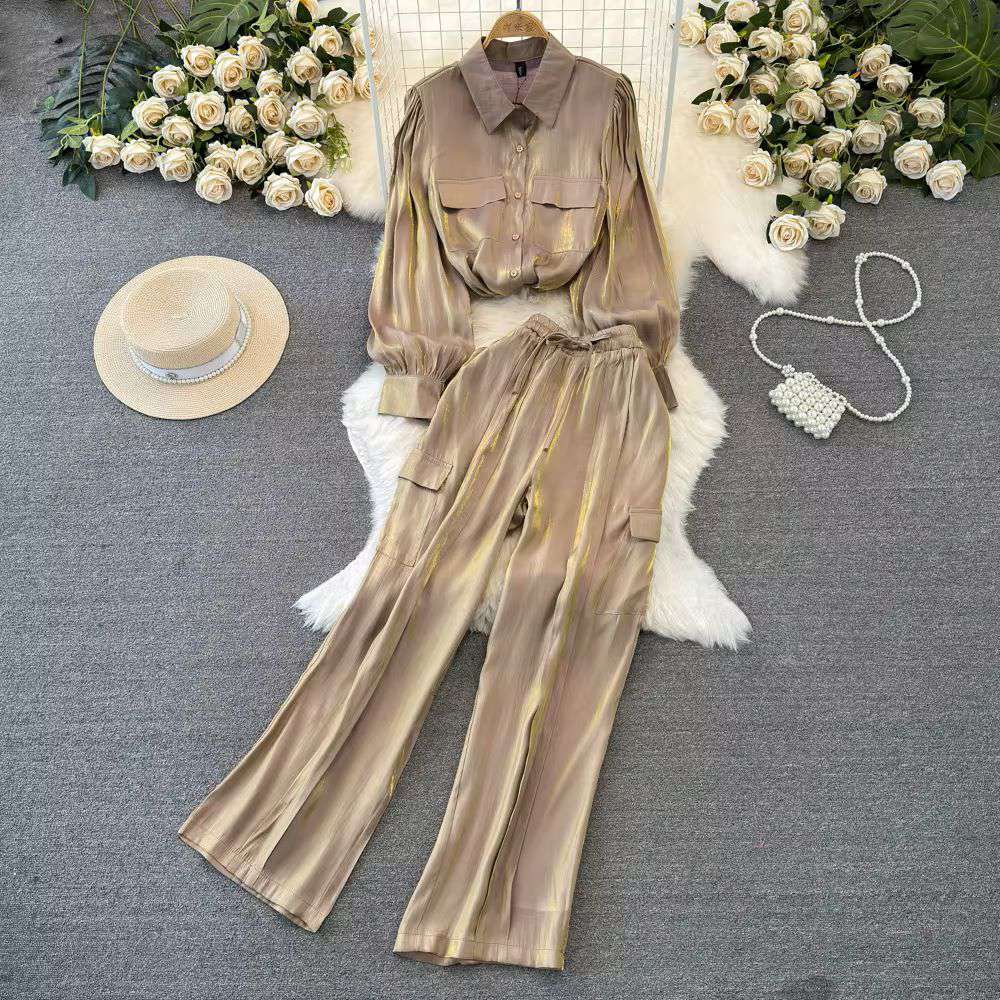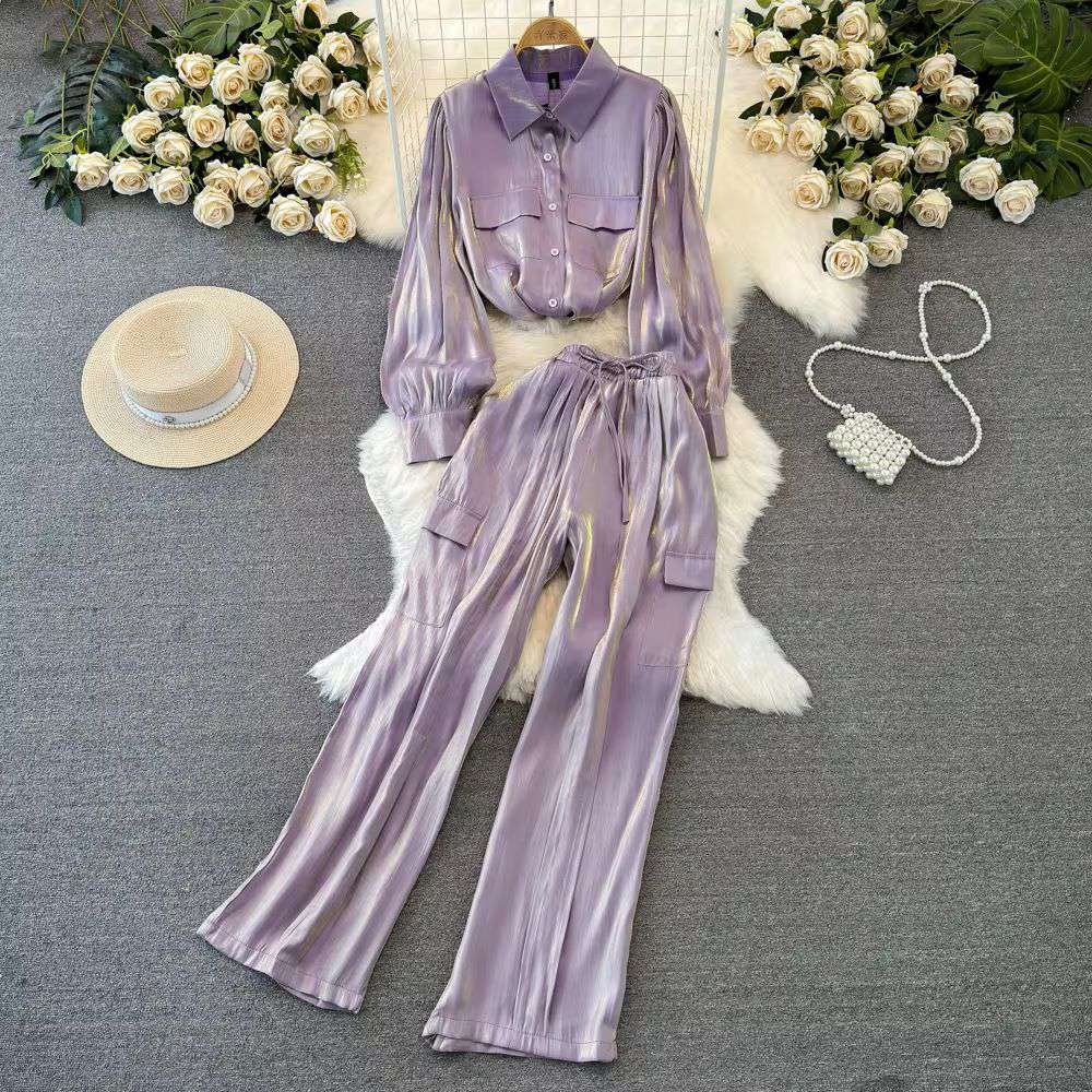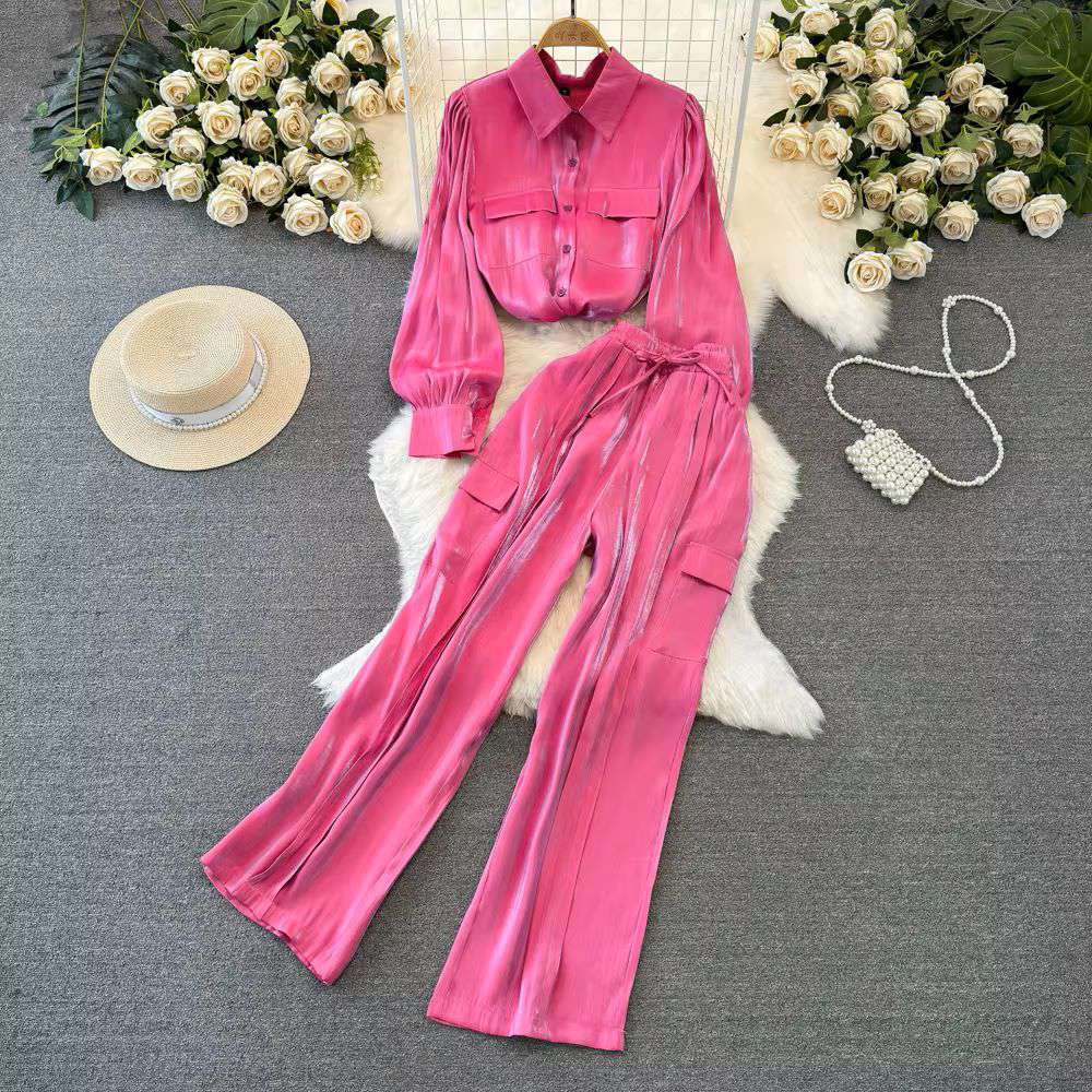 Women Long Sleeved Single Breasted Loose Glossy Shirt Casual Straight Wide Leg Pants