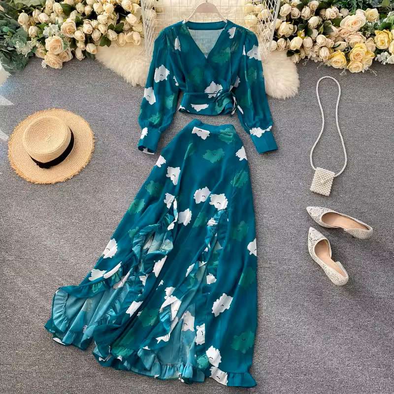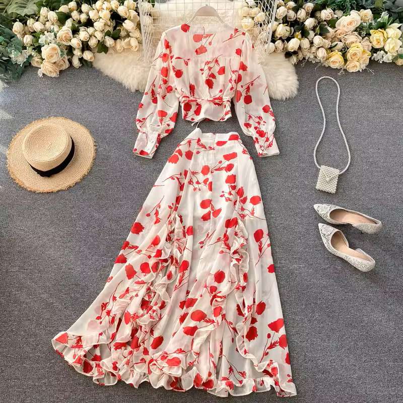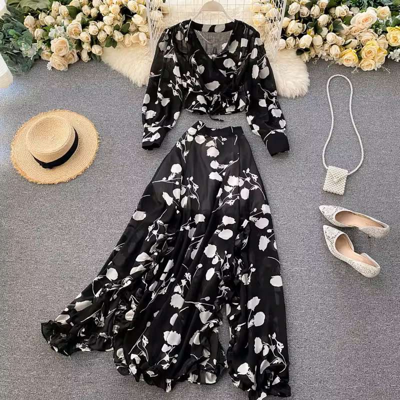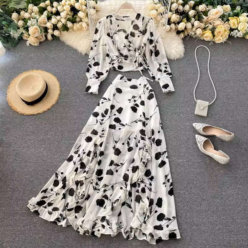 Women's Suit Printed Short Style Long Sleeve V-Neck Chiffon Shirt + Wooden Ear Edge Slit Half Skirt Two-Piece Set