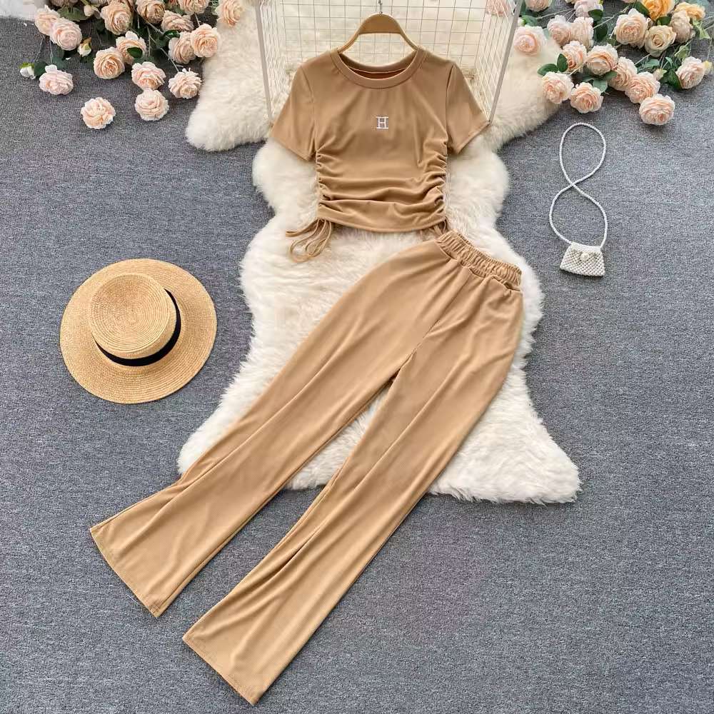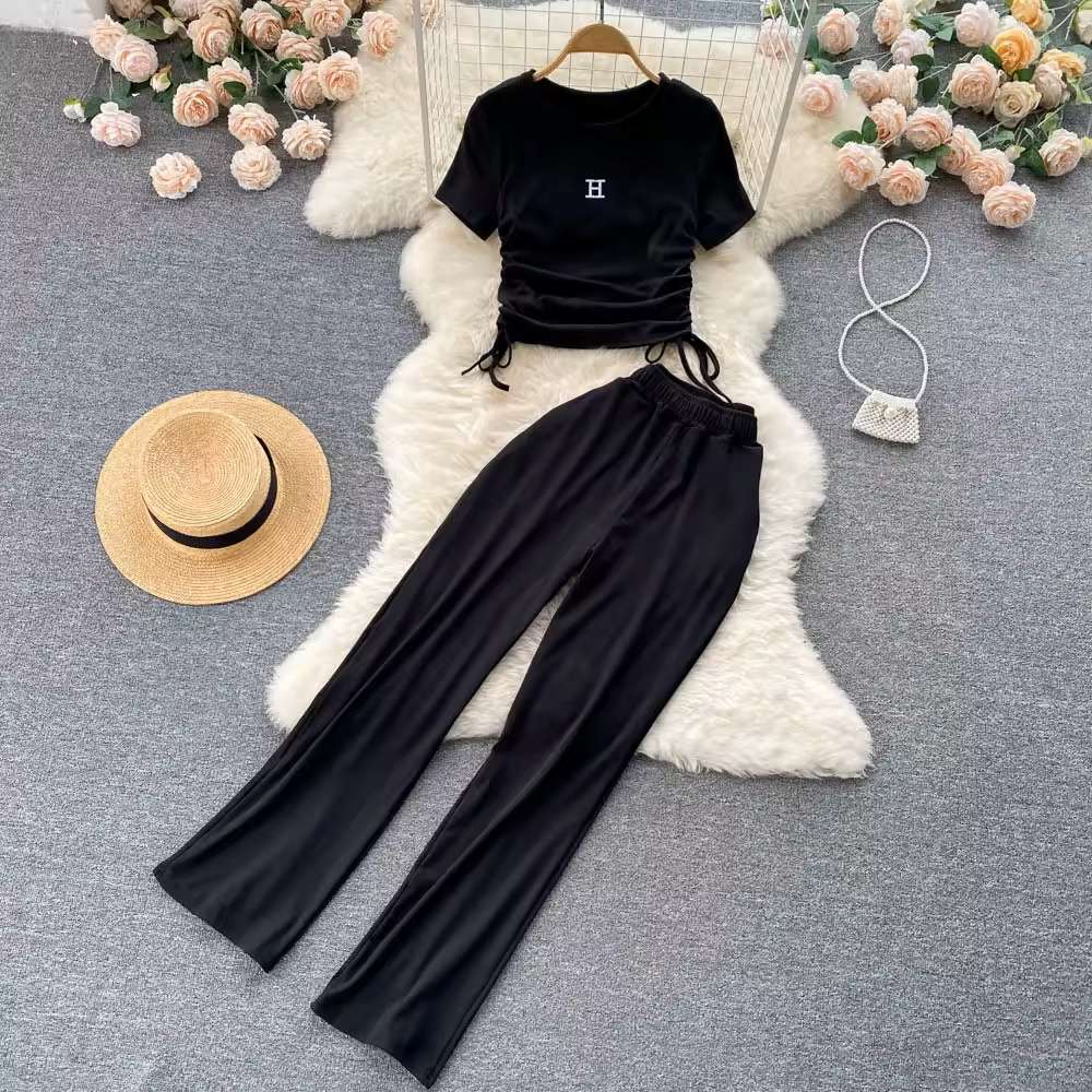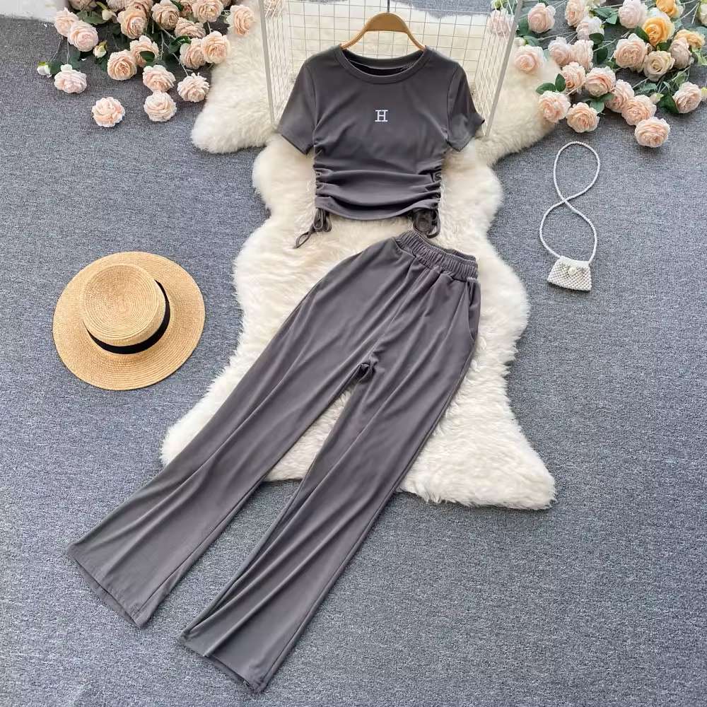 Women's Suits 2 Piece Summer Sets Women Pleated Drawstring Lace-up Short Sleeve Top + Drape Wide-leg Pants Suits Set For Women