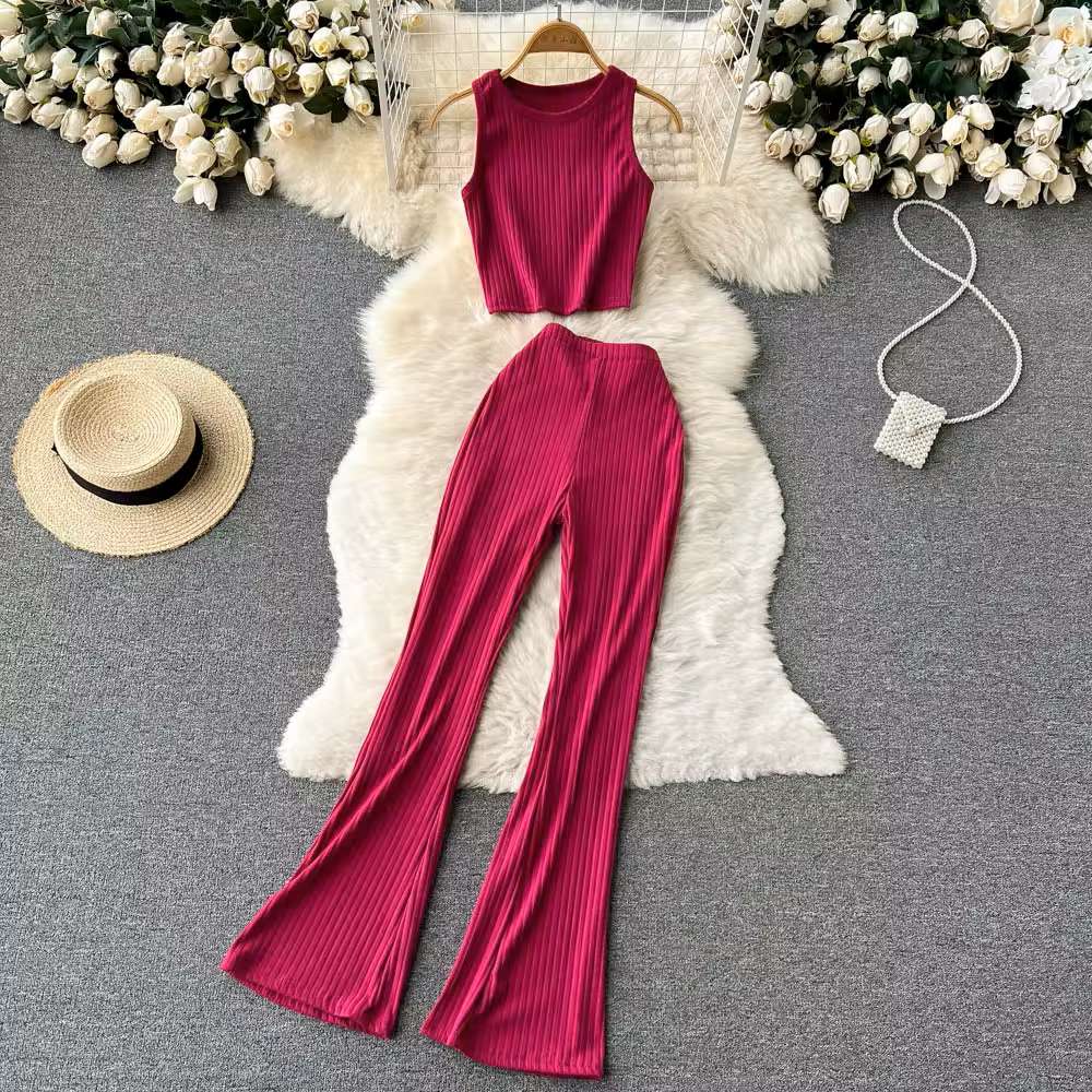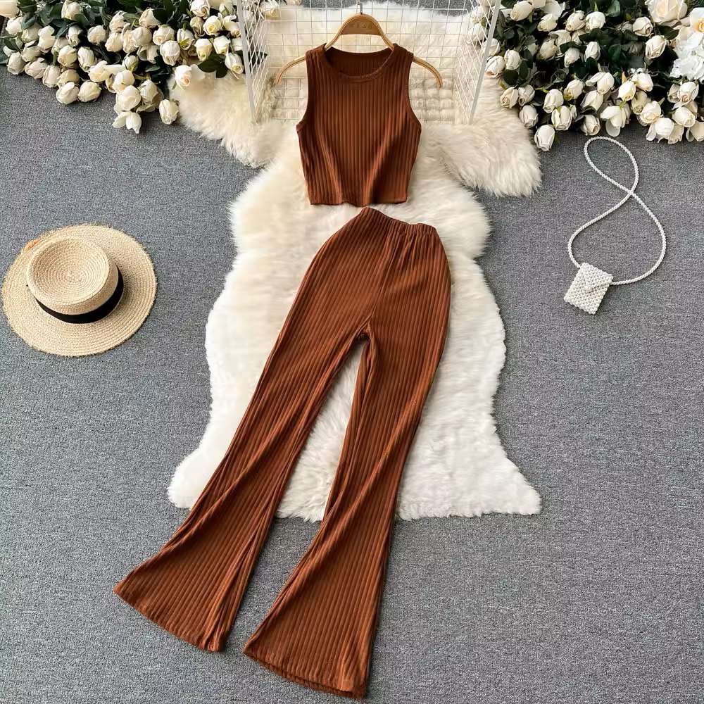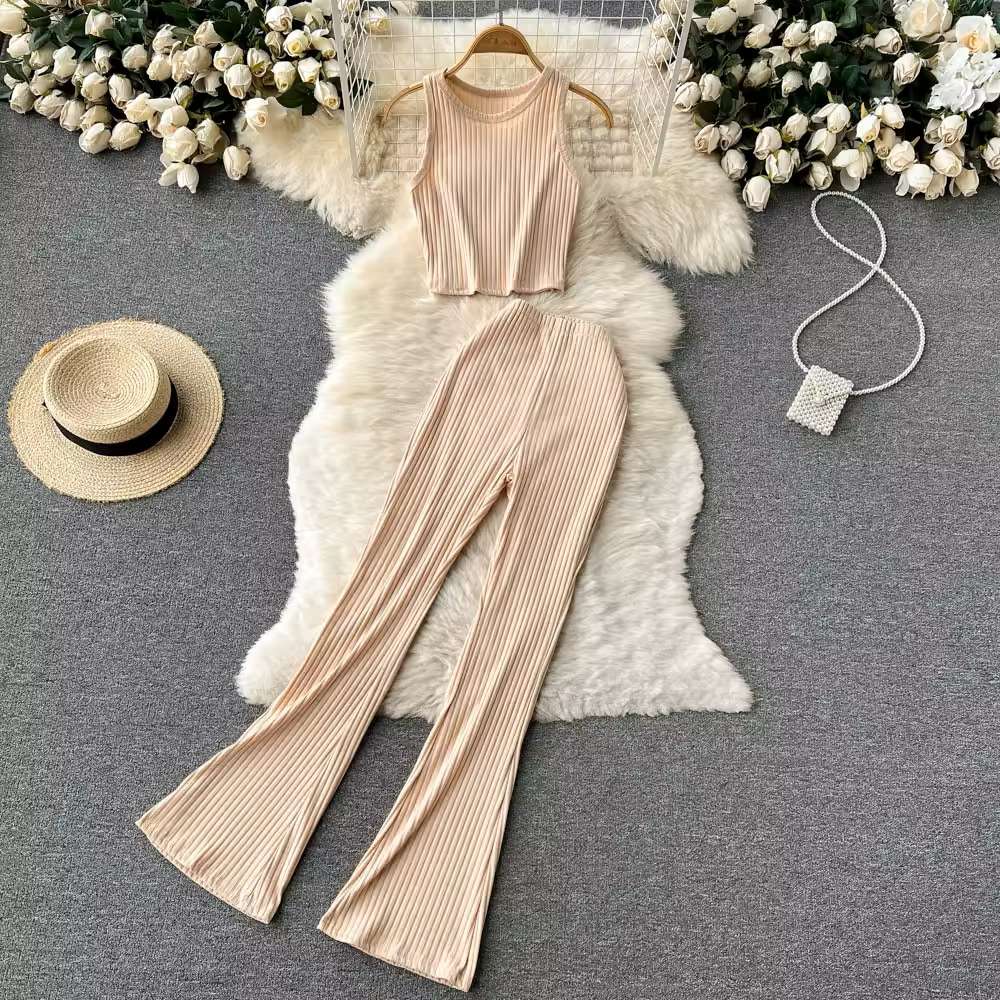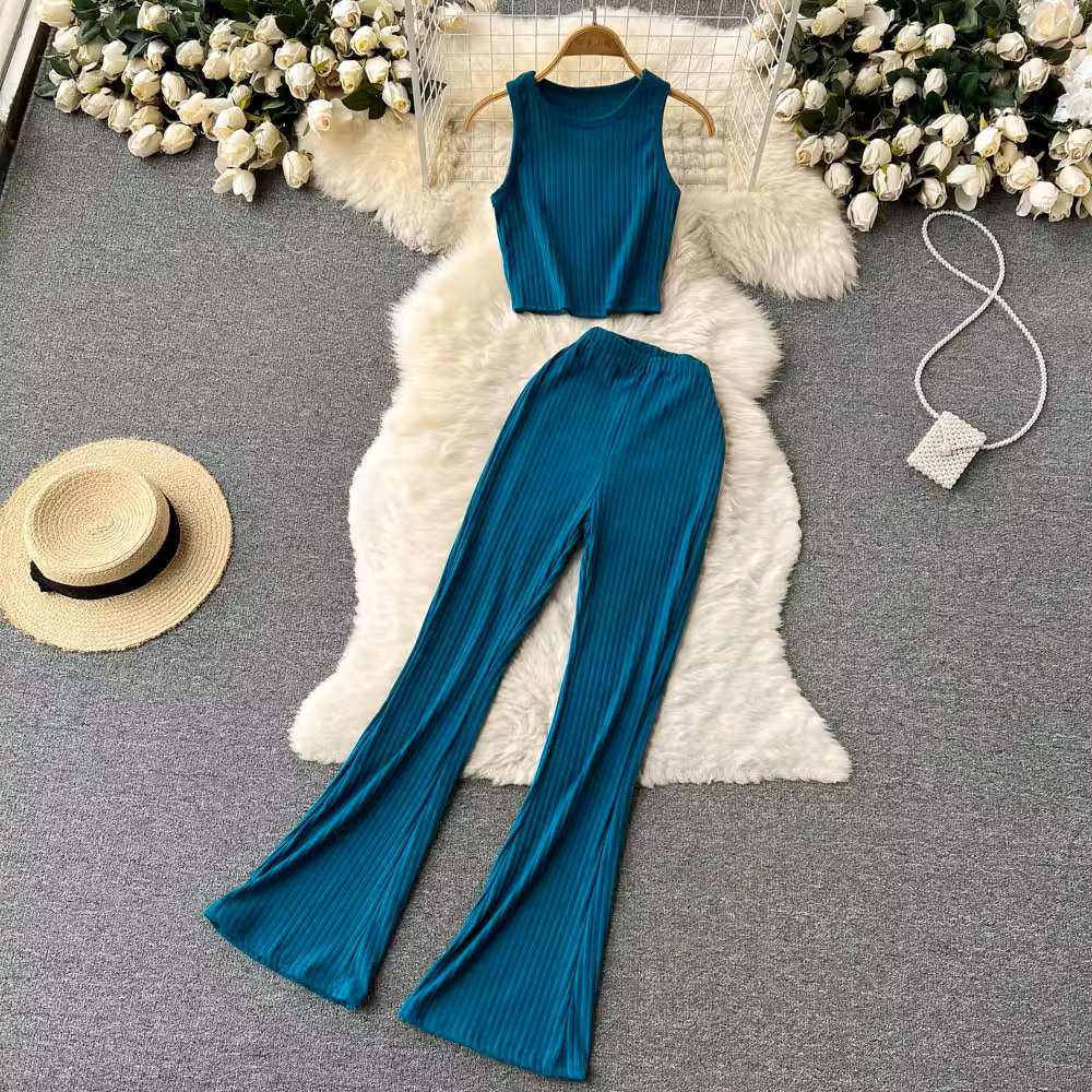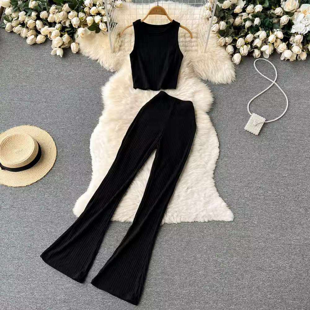 Women's Two Piece Pants Set Retro New Knitted Suit Short Sleeveless Top High Waist Slim Trousers Flared Two-Piece Set