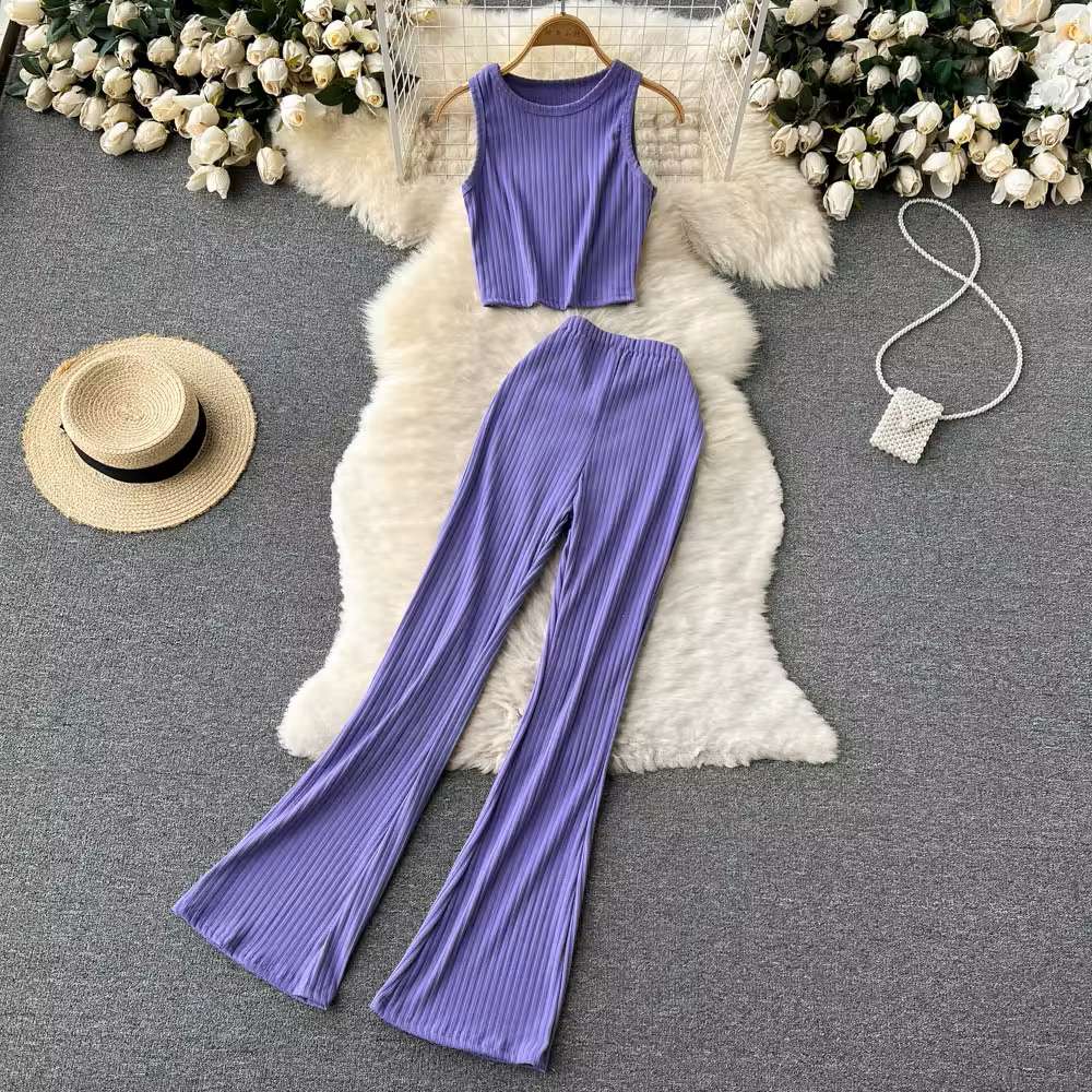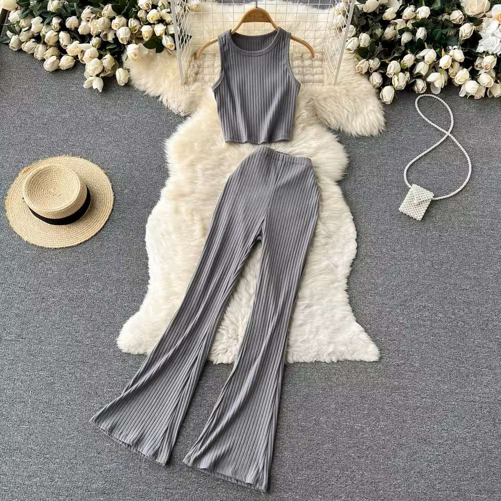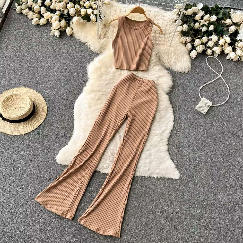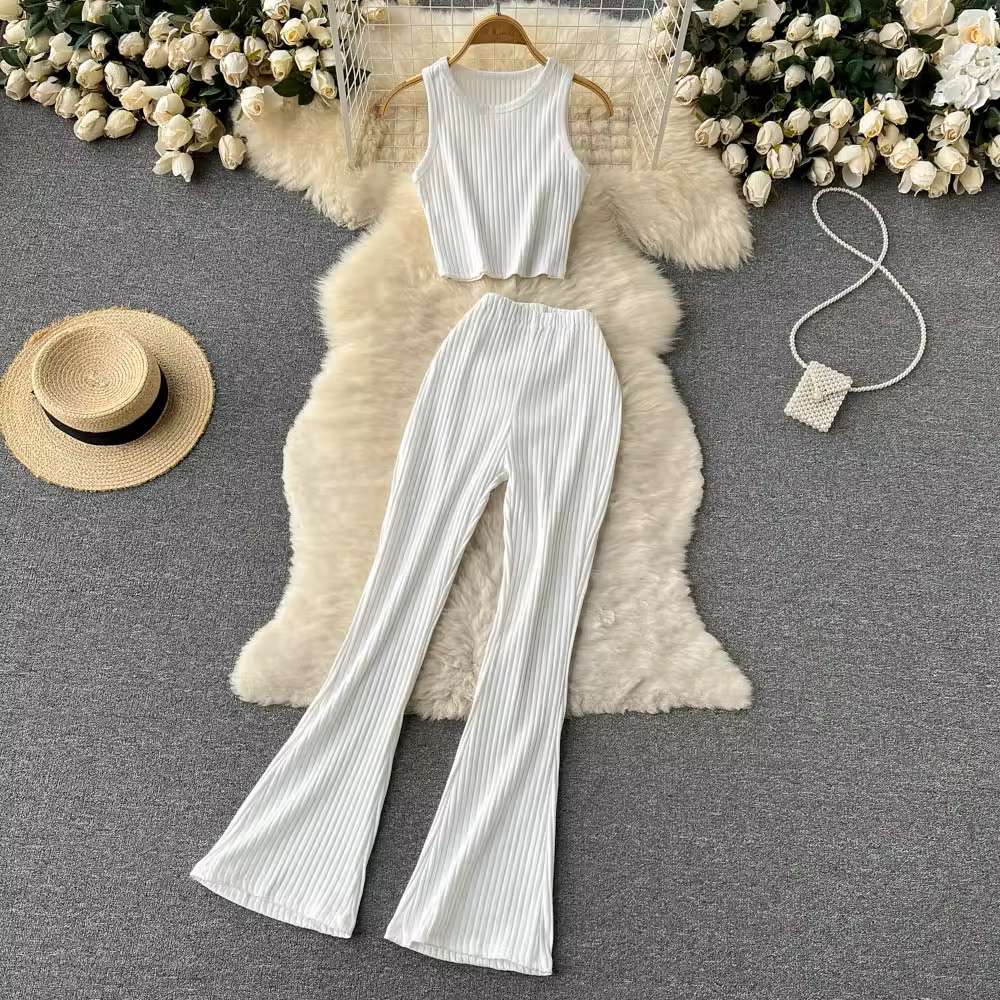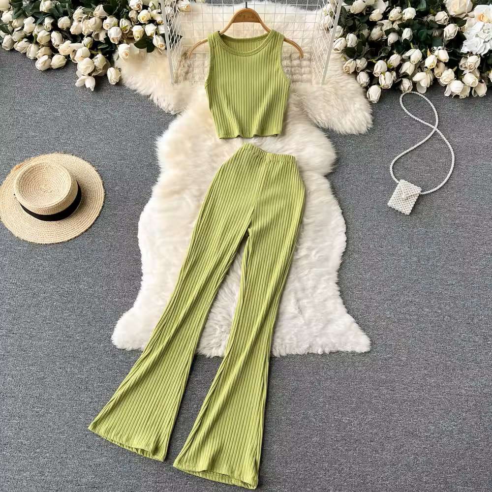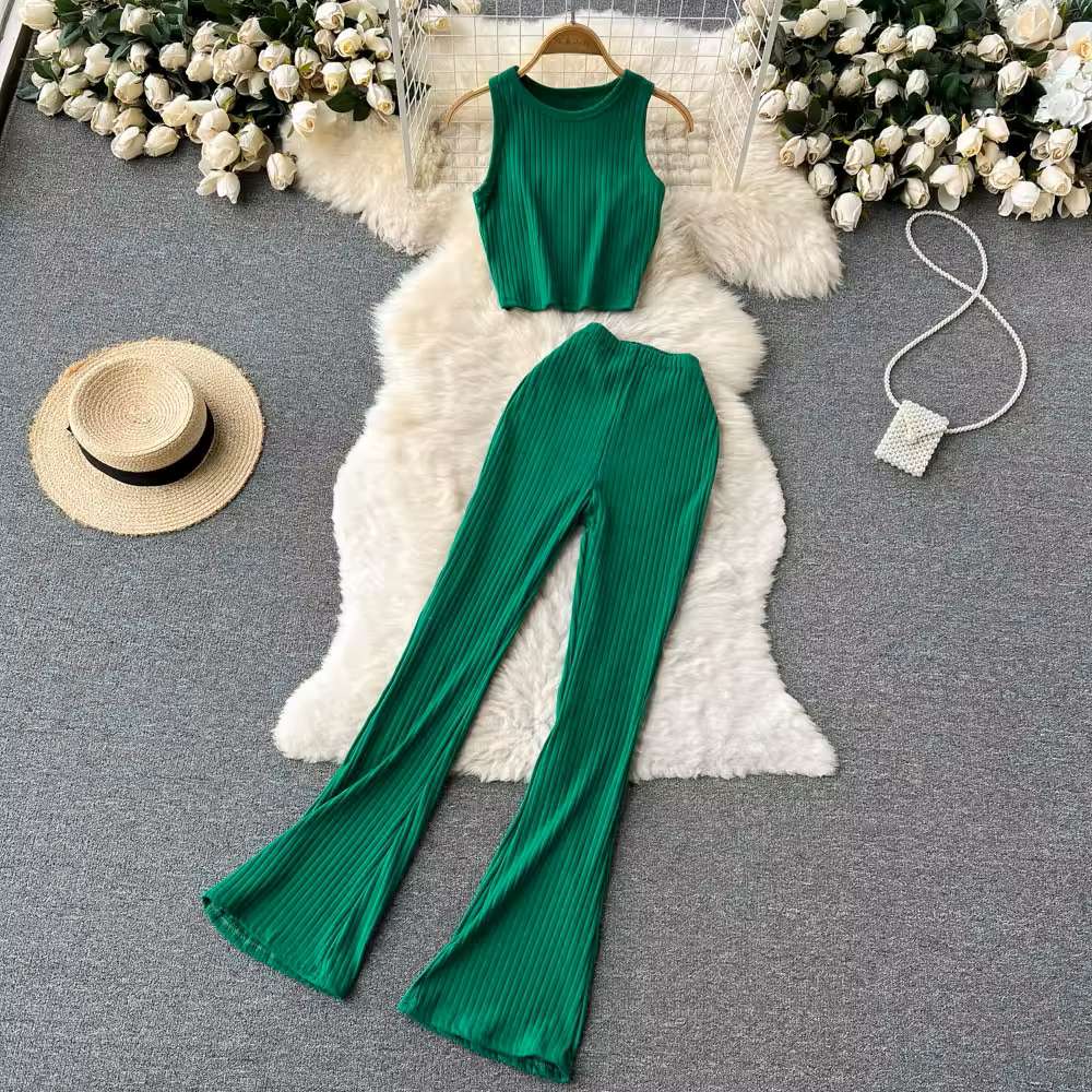 Women's Two Piece Pants Set Retro New Knitted Suit Short Sleeveless Top High Waist Slim Trousers Flared Two-Piece Set